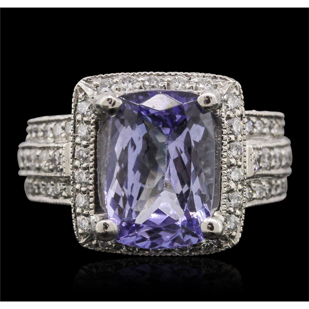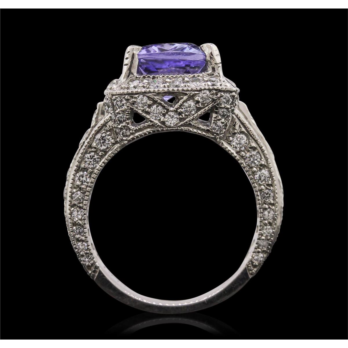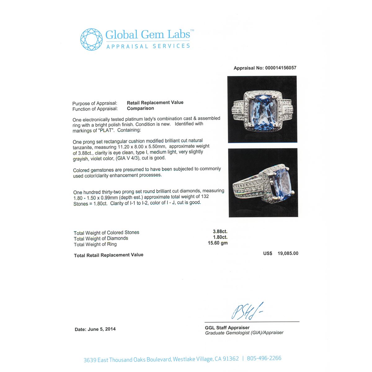 One electronically tested platinum Ladies combination cast & assembled ring with a bright polish finish. Condition is new. Identified with markings of "PLAT". Containing: One prong set rectangular cushion modified brilliant cut natural tanzanite, measuring 11.20 x 8.00 x 5.50mm, approximate weight of 3.88ct., clarity is eye clean, type I, medium light, very slightly grayish, violet color, (GIA V 4/3), cut is good. Colored gemstones are presumed to have been subjected to commonly used color/clarity enhancement processes. One Hundred Thirty-Two prong set round brilliant cut diamonds, measuring 1.80 - 1.50 x 0.99mm (depth est.) approximate total weight of 132 Stones = 1.80ct. Clarity of I-1 to I-2, Color of I - J, Cut is Good. Total Weight of Colored Stones 3.88ct. Total Weight of Diamonds 1.80ct. Total Weight of Ring 15.60 grams. GGL Appraised at $19,085.00.