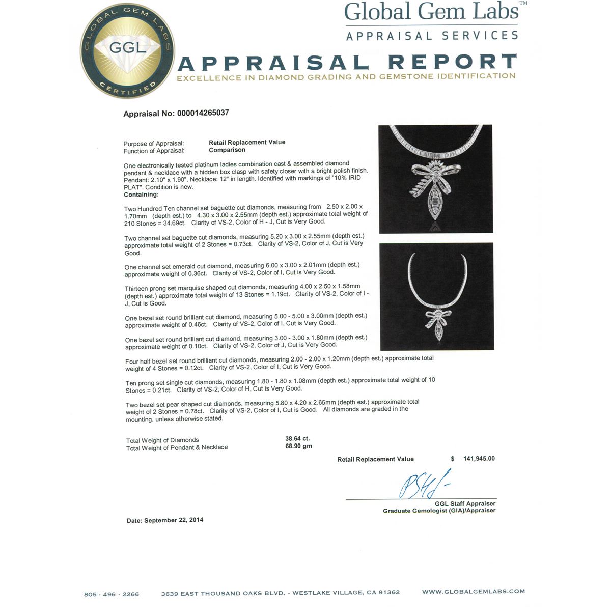 One electronically tested platinum ladies combination cast & assembled diamond pendant & necklace with a hidden box clasp with safety closer with a bright polish finish. Pendant: 2.10" x 1.90". Necklace: 12" in length. Identified with markings of "10%. IRID PLAT". Condition is new. Containing: Two Hundred Ten channel set baguette cut diamonds, measuring from 2.50 x 2.00 x 1.70mm (depth est.) to 4.30 x 3.00 x 2.55mm (depth est.) approximate total weight of 210 Stones = 34.69ct. Clarity: VS-2. Color: H - J, Cut is Very Good. Two channel set baguette cut diamonds, measuring 5.20 x 3.00 x 2.55mm (depth est.) approximate total weight of 2 Stones = 0.73ct. Clarity: VS-2. Color: J, Cut is Very Good. One channel set emerald cut diamond, measuring 6.00 x 3.00 x 2.01mm (depth est.) approximate weight of 0.36ct. Clarity: VS-2. Color: I, Cut is Very Good. Thirteen prong set marquise shaped cut diamonds, measuring 4.00 x 2.50 x 1.58mm (depth est.) approximate total weight of 13 Stones = 1.19ct. Clarity: VS-2. Color: I - J, Cut is Good. One bezel set round brilliant cut diamond, measuring 5.00 - 5.00 x 3.00mm (depth est.) approximate weight of 0.46ct. Clarity: VS-2. Color: I, Cut is Very Good. One bezel set round brilliant cut diamond, measuring 3.00 - 3.00 x 1.80mm (depth est.) approximate weight of 0.10ct. Clarity: VS-2. Color: J, Cut is Very Good. Four half bezel set round brilliant cut diamonds, measuring 2.00 - 2.00 x 1.20mm (depth est.) approximate total weight of 4 Stones = 0.12ct. Clarity: VS-2. Color: I, Cut is Very Good. Ten prong set single cut diamonds, measuring 1.80 - 1.80 x 1.08mm (depth est.) approximate total weight of 10 Stones = 0.21ct. Clarity: VS-2. Color: H, Cut is Very Good. Two bezel set pear shaped cut diamonds, measuring 5.80 x 4.20 x 2.65mm (depth est.) approximate total weight of 2 Stones = 0.78ct. Clarity: VS-2. Color: I, Cut is Good. All diamonds are graded in the mounting, unless otherwise stated. Total Weight of Diamonds 38.64ct. Total Weight of Pendant & Necklace 68.90 grams. GGL Appraised at $141,945.00.