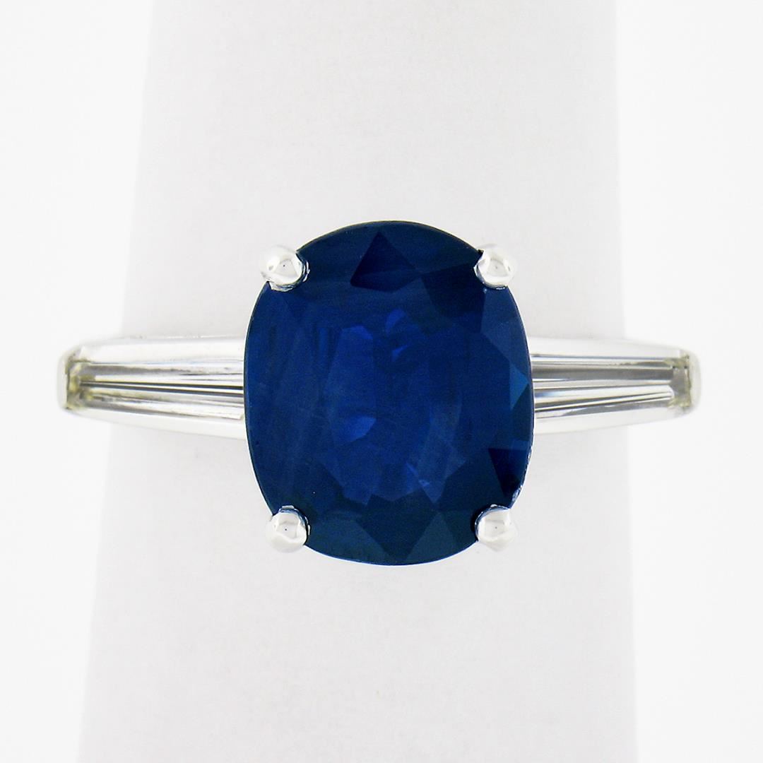 A solid platinum 3 stones ring, with 1 Gubelin graded 1 oval cut natural sapphire (3.64ct ), and 2 baguette cut natural diamonds (H/I - VS1/VS2 ; 0.60ctw). The ring is size 6.0, weighs a total of 5.26 grams, and measures 10.4mm wide. Comes with all original relevant certifications.