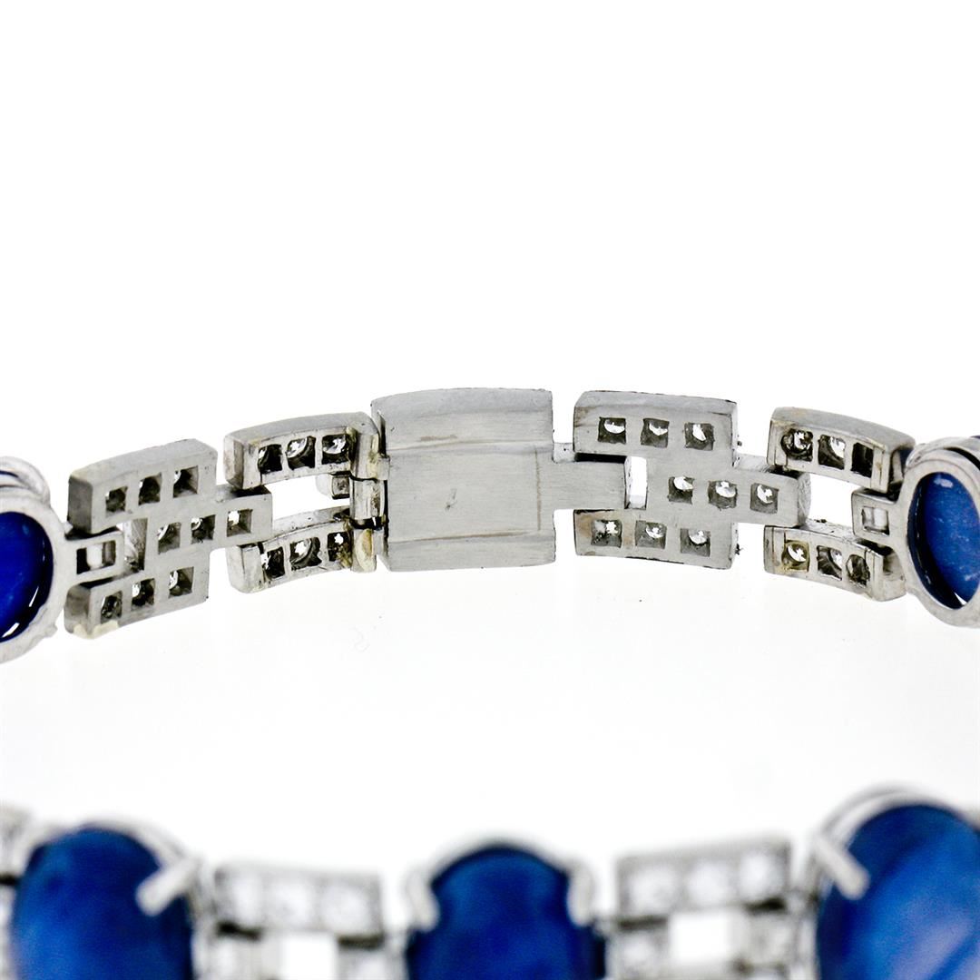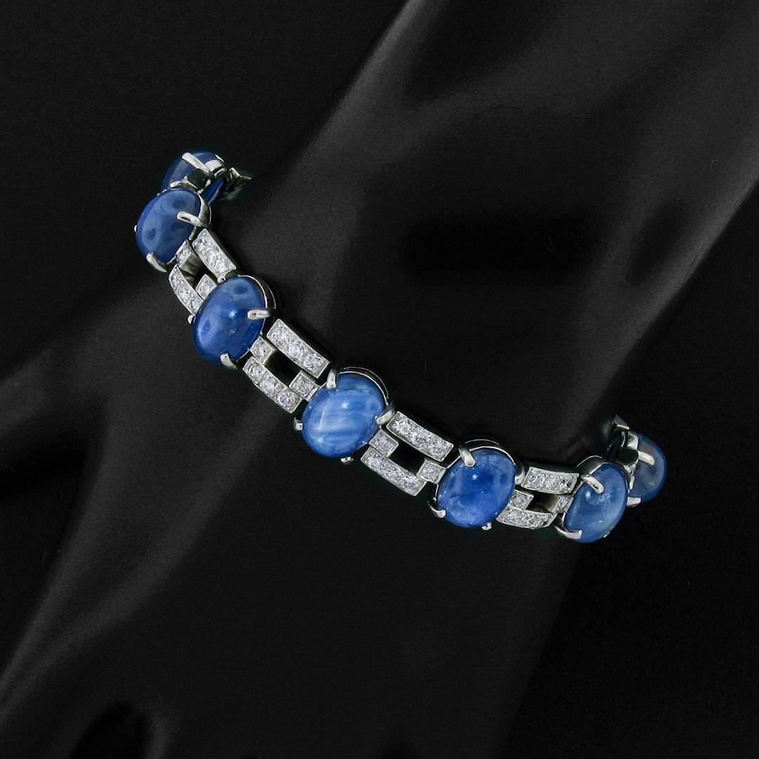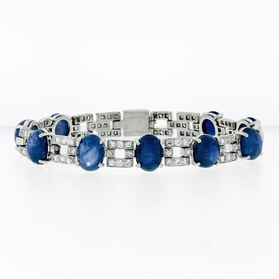 A vintage solid platinum tennis bracelet, featuring 9 oval cabochon cut natural star sapphires (40.50ctw ), with 105 round brilliant cut natural diamonds (F/G - VS1/VS2; 3.07ctw). It weighs a total of 32.52 grams, measures 9.75mm wide, and measures 6.75 inches in length.