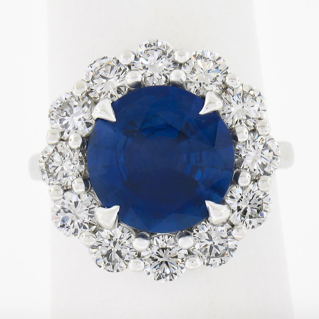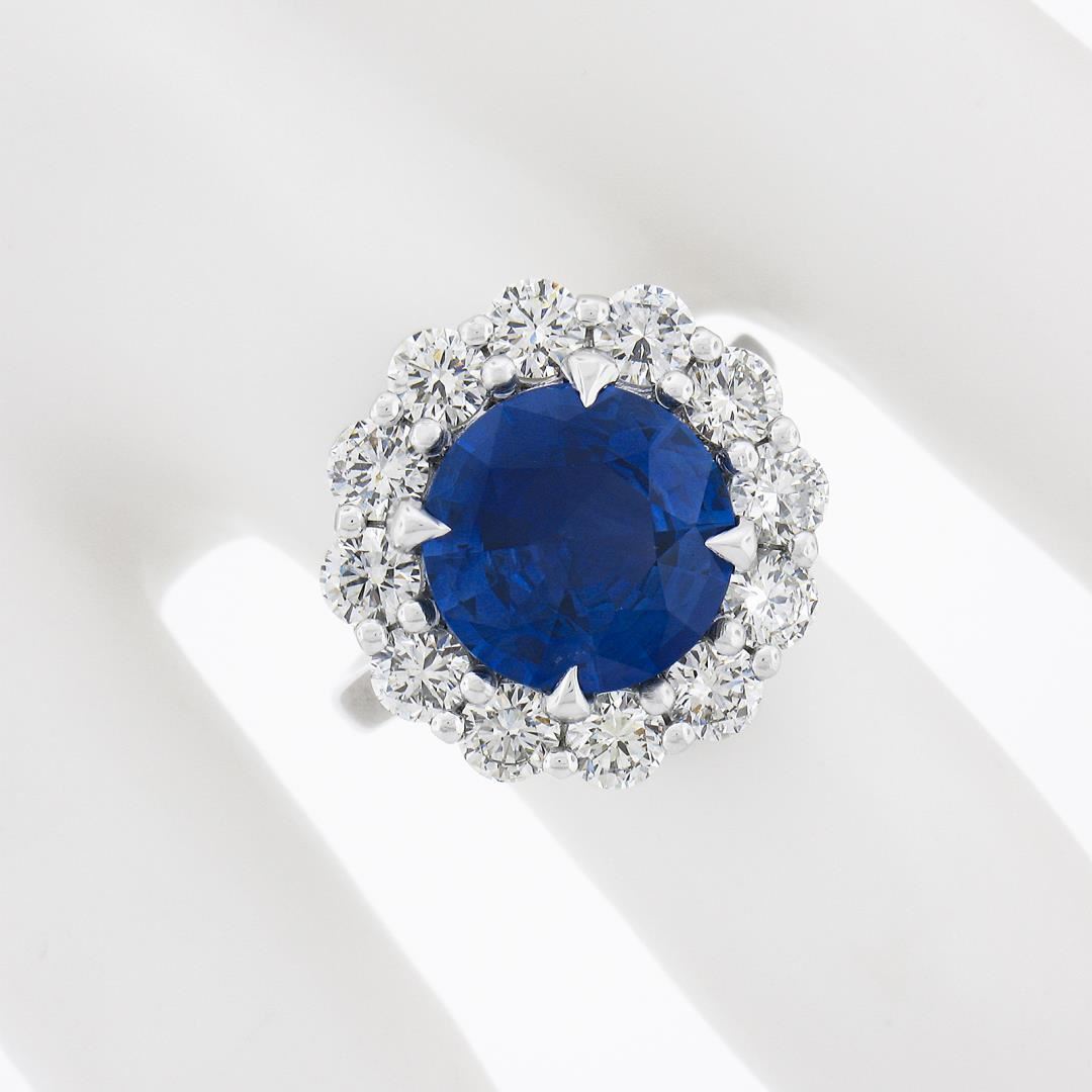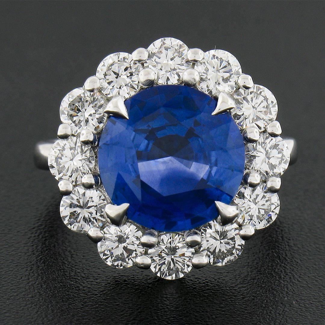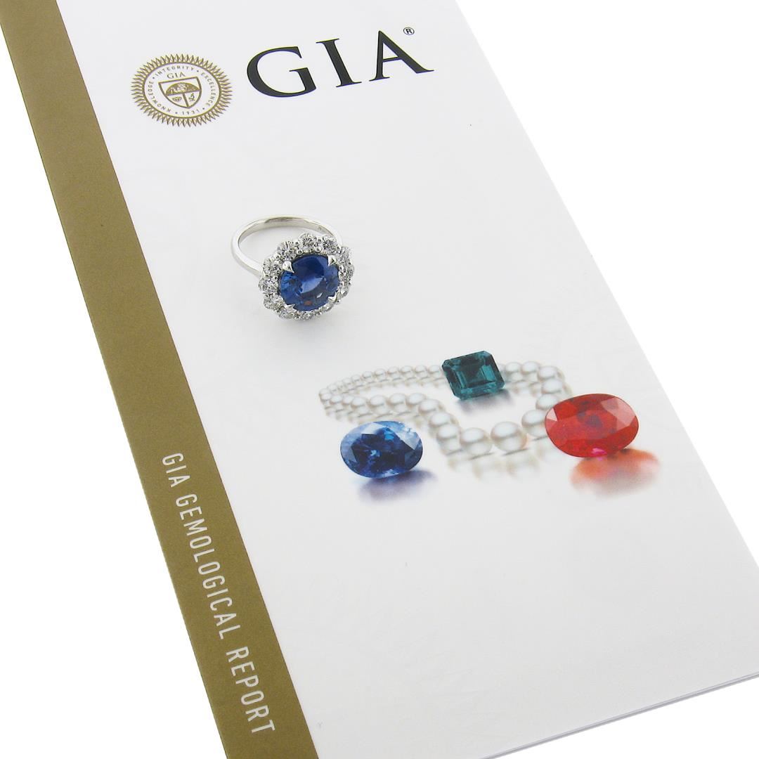 A new solid platinum statement ring, featuring 1 GIA graded natural round cut sapphire (4.55ct ), and a halo of 12 round cut natural diamonds (F/G - VS1/VS2 ; 1.87ctw). The ring is size 6.5, weighs a total of 10.21 grams, and measures 17mm wide. Comes with all original relevant certifications.