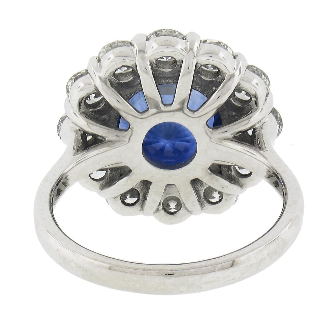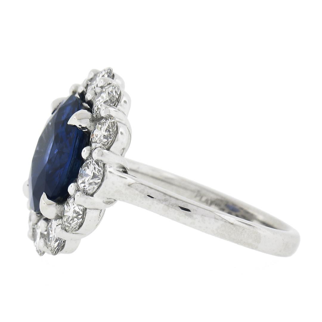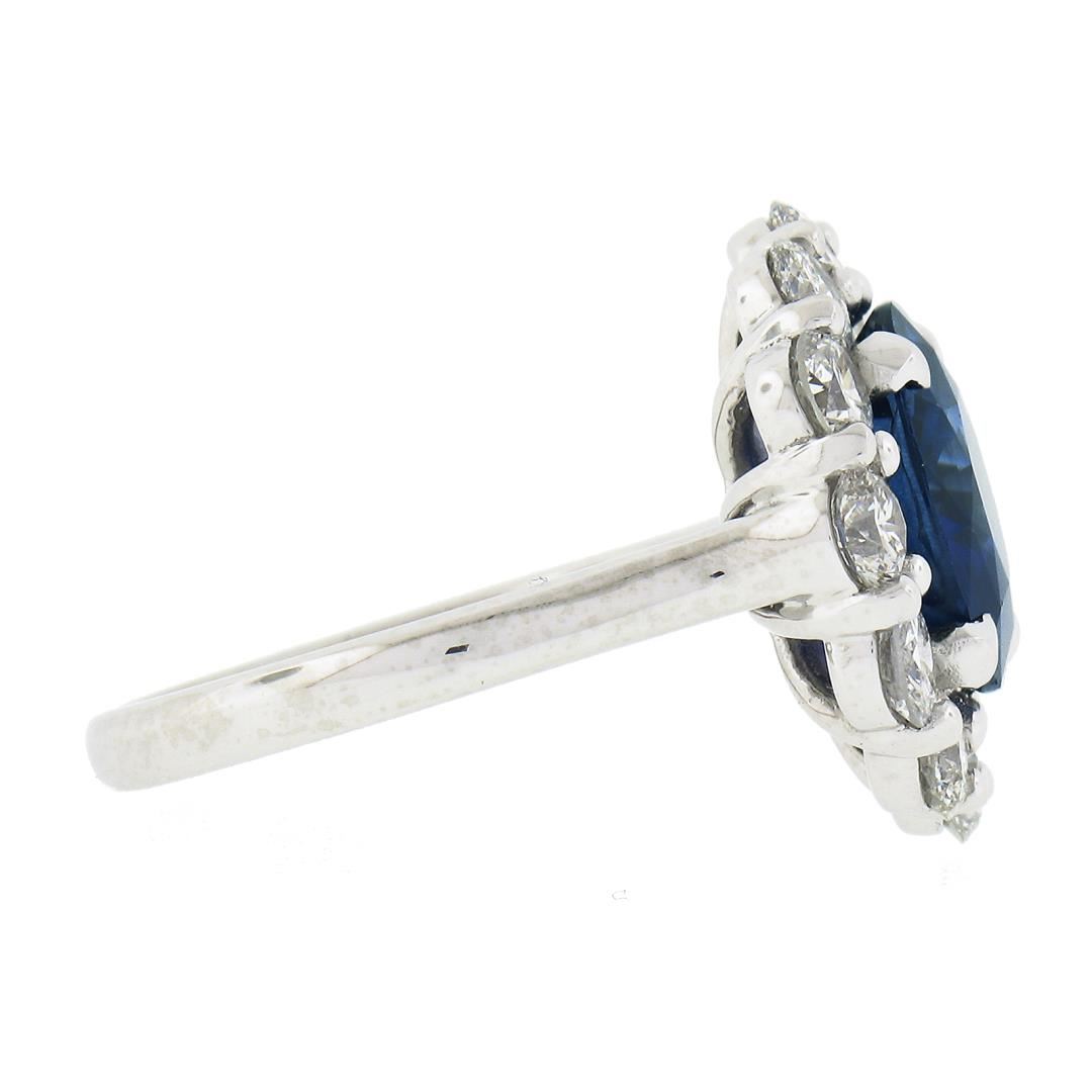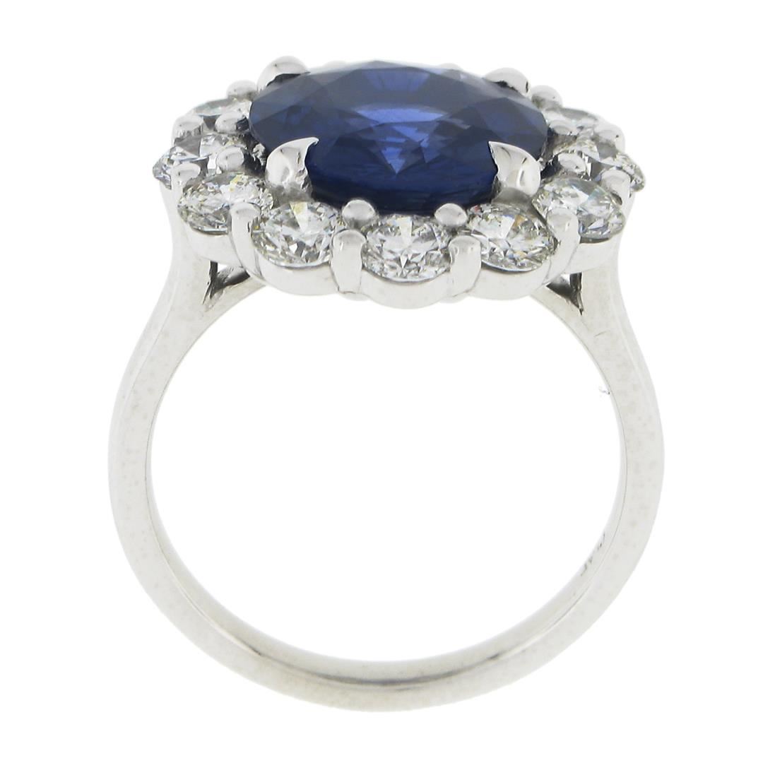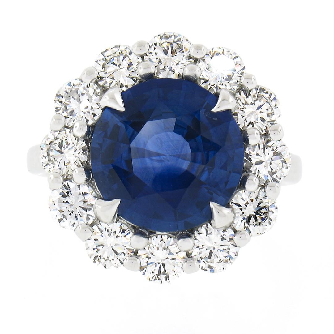 A new solid platinum statement ring, featuring 1 GIA graded natural round cut sapphire (4.55ct ), and a halo of 12 round cut natural diamonds (F/G - VS1/VS2 ; 1.87ctw). The ring is size 6.5, weighs a total of 10.21 grams, and measures 17mm wide. Comes with all original relevant certifications.