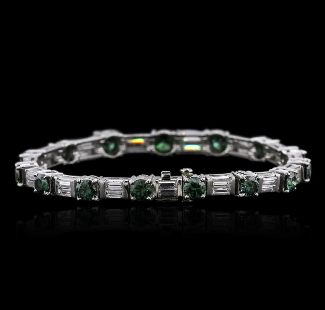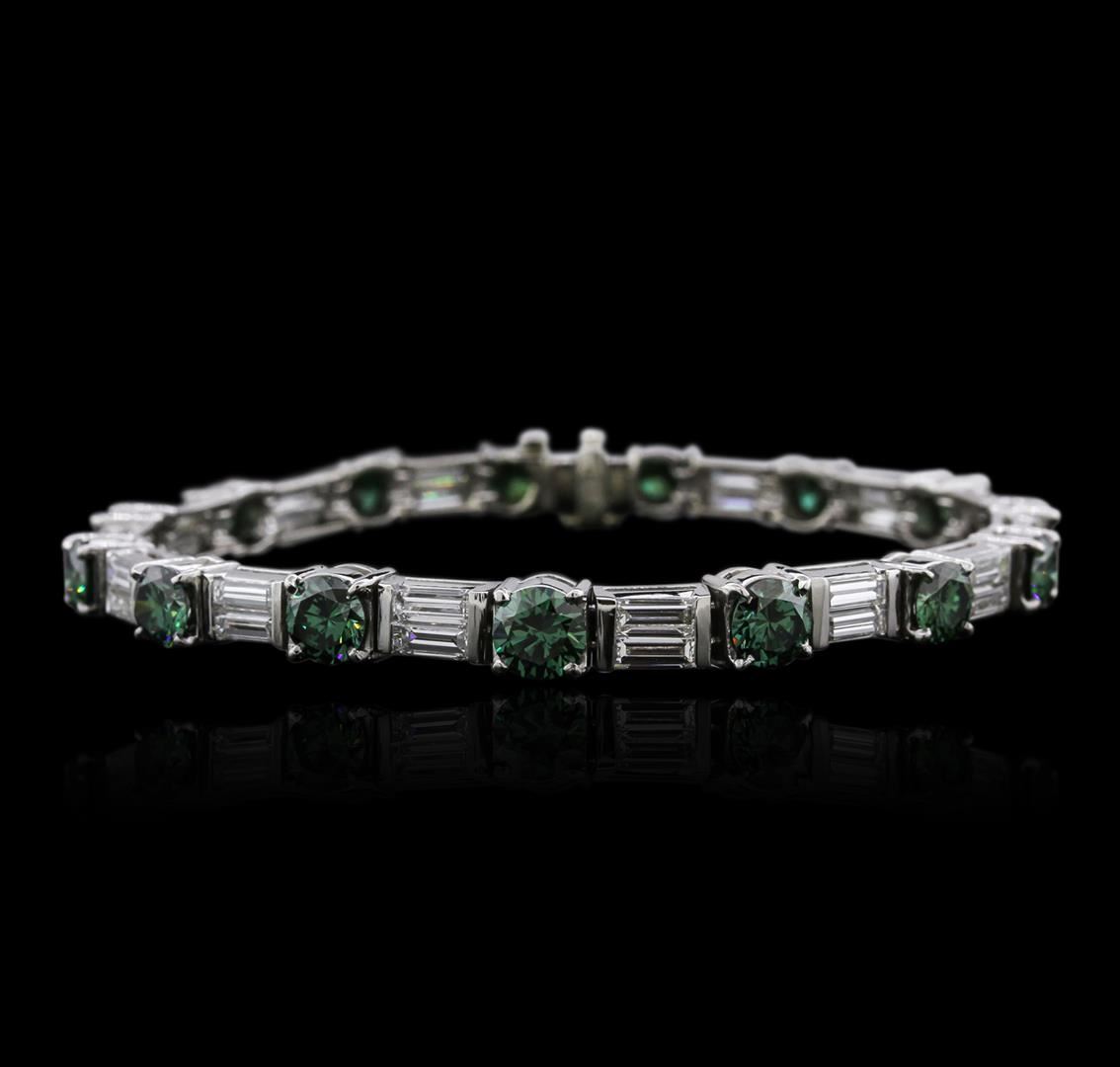 One electronically tested platinum ladies cast diamond tennis bracelet with a hinged clasp with a bright polish finish. Measurements: 6.50" in length Identified with markings of "PLAT". Condition is new. Containing: Fifteen prong set round brilliant cut diamonds, measuring 4.50 - 4.50 x 2.70mm (depth est.) approximate total weight of 15 Stones = 5.00ct. Clarity: VS-1, color of Fancy Green, Cut is Very Good. Thirty prong set baguette cut diamonds, measuring 3.50 x 1.50 x 1.28mm (depth est.) approximate total weight of 30 Stones = 1.84ct. Clarity: VS-1. Color: H - I, Cut is Very Good. All diamonds are graded in the mounting, unless otherwise stated. Total Weight of Diamonds 6.85ct. Total Weight of Tennis Bracelet 22.60 grams. GGL Appraised at $28,995.00.