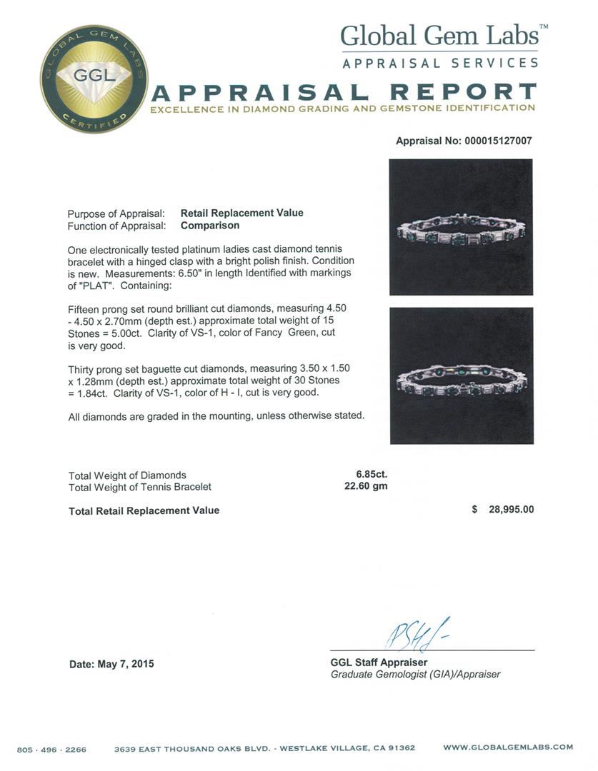 One electronically tested platinum ladies cast diamond tennis bracelet with a hinged clasp with a bright polish finish. Measurements: 6.50" in length Identified with markings of "PLAT". Condition is new. Containing: Fifteen prong set round brilliant cut diamonds, measuring 4.50 - 4.50 x 2.70mm (depth est.) approximate total weight of 15 Stones = 5.00ct. Clarity: VS-1, color of Fancy Green, Cut is Very Good. Thirty prong set baguette cut diamonds, measuring 3.50 x 1.50 x 1.28mm (depth est.) approximate total weight of 30 Stones = 1.84ct. Clarity: VS-1. Color: H - I, Cut is Very Good. All diamonds are graded in the mounting, unless otherwise stated. Total Weight of Diamonds 6.85ct. Total Weight of Tennis Bracelet 22.60 grams. GGL Appraised at $28,995.00.
