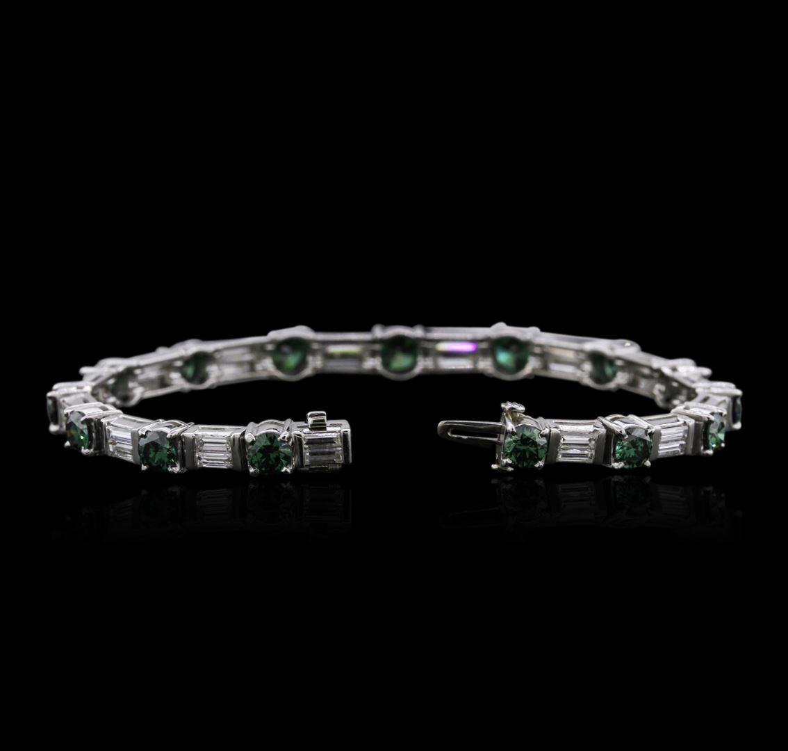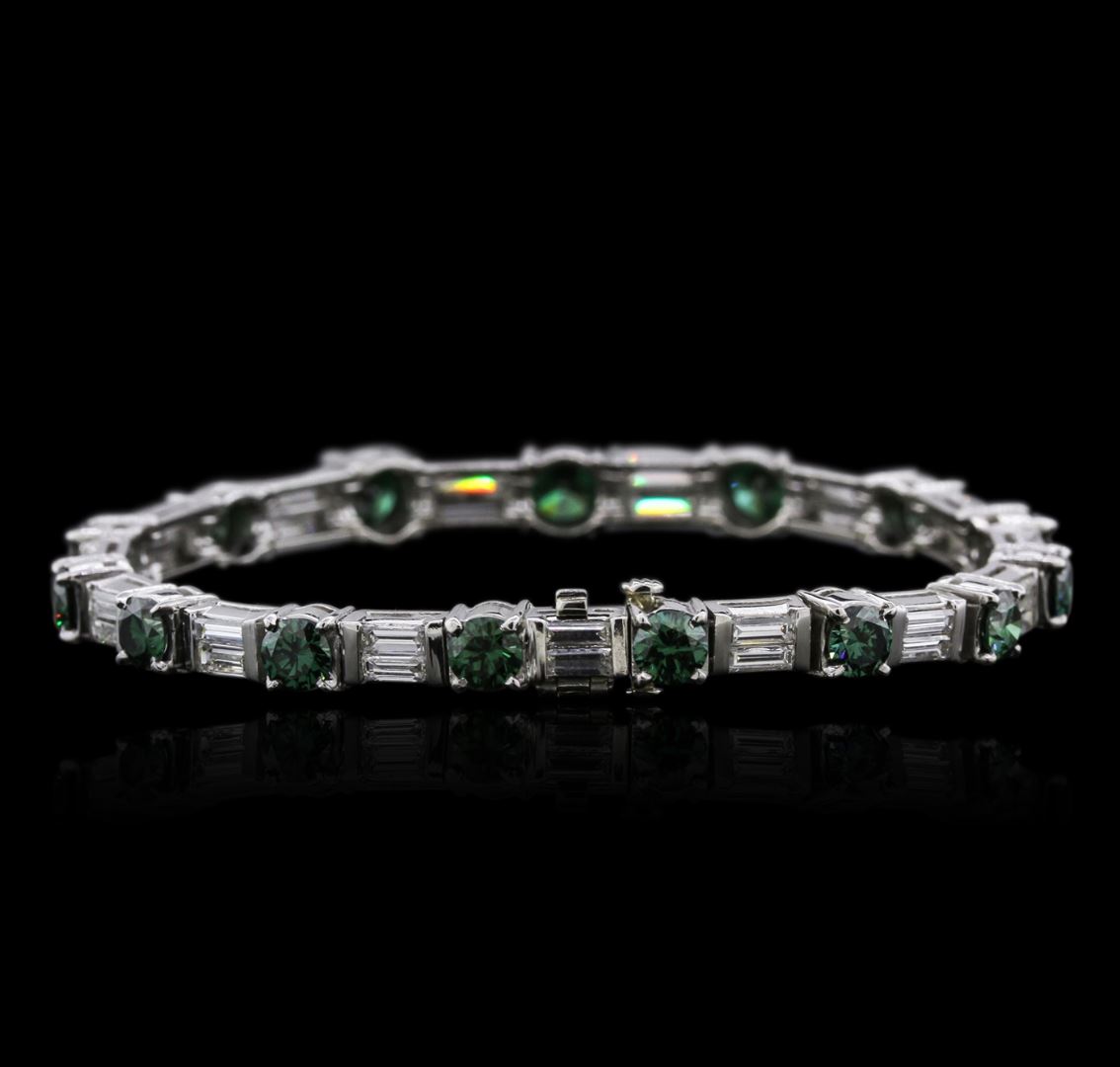 One electronically tested platinum ladies cast diamond tennis bracelet with a hinged clasp with a bright polish finish. Measurements: 6.50" in length Identified with markings of "PLAT". Condition is new. Containing: Fifteen prong set round brilliant cut diamonds, measuring 4.50 - 4.50 x 2.70mm (depth est.) approximate total weight of 15 Stones = 5.00ct. Clarity: VS-1, color of Fancy Green, Cut is Very Good. Thirty prong set baguette cut diamonds, measuring 3.50 x 1.50 x 1.28mm (depth est.) approximate total weight of 30 Stones = 1.84ct. Clarity: VS-1. Color: H - I, Cut is Very Good. All diamonds are graded in the mounting, unless otherwise stated. Total Weight of Diamonds 6.85ct. Total Weight of Tennis Bracelet 22.60 grams. GGL Appraised at $28,995.00.