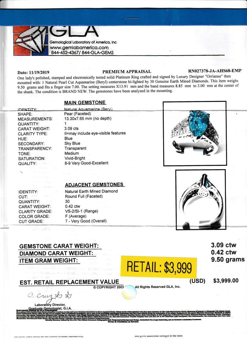 Platinum Aquamarine Ring. Please see Photos and Description for all available information. This Aquamarine ring features a stunning 3.09ct oval cut aquamarine gem in the center, surrounded by 0.42ct of diamonds. This ring is fashioned in platinum and is suitable for any occasion.