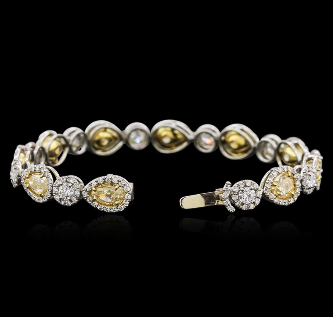 Platinum diamond bracelet, consisting of 10 pear brilliant cut diamonds weighing 10.13 carats. Diamonds are fancy to fancy intense yellow in color and VS1-VS2 in clarity. Measurements: 7.30 x 5.30 x 3.57 mm. Bracelet also contains 10 round brilliant cut diamonds weighing 2.04 carats, and completed by 260 round brilliant cut diamonds, weighing 2.71 carats. Diamonds are E-F in color and VS1-VS2 in clarity. Grading as mounting permits. EGL USA Appraised.