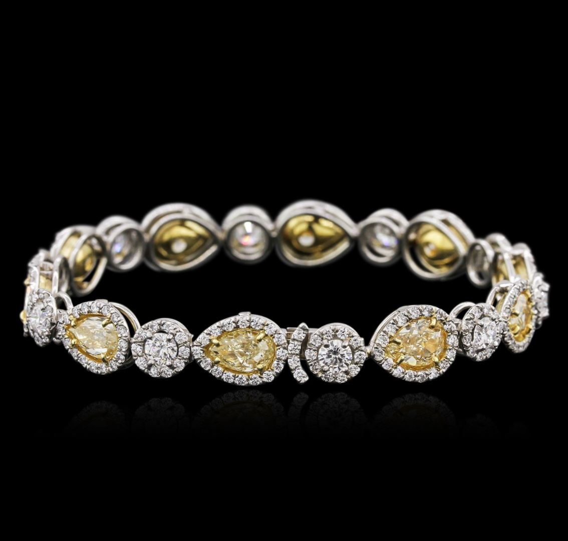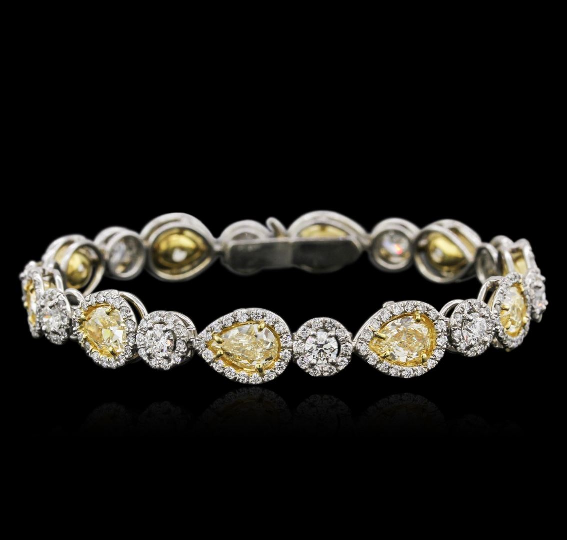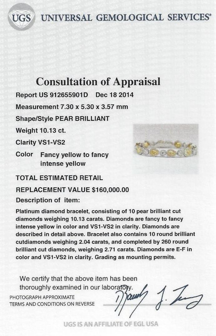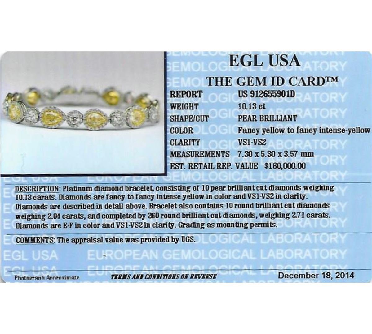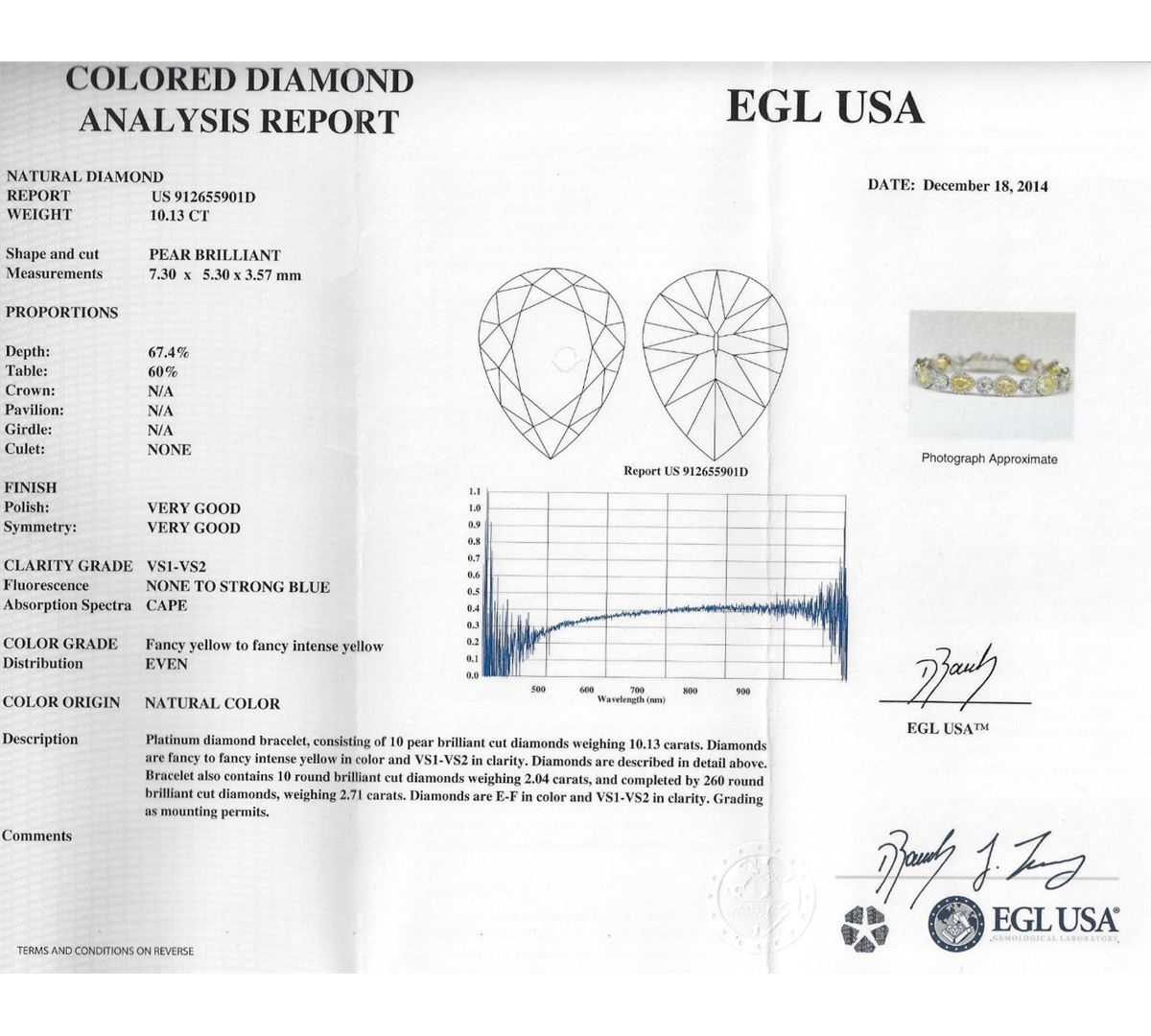 Platinum diamond bracelet, consisting of 10 pear brilliant cut diamonds weighing 10.13 carats. Diamonds are fancy to fancy intense yellow in color and VS1-VS2 in clarity. Measurements: 7.30 x 5.30 x 3.57 mm. Bracelet also contains 10 round brilliant cut diamonds weighing 2.04 carats, and completed by 260 round brilliant cut diamonds, weighing 2.71 carats. Diamonds are E-F in color and VS1-VS2 in clarity. Grading as mounting permits. EGL USA Appraised.