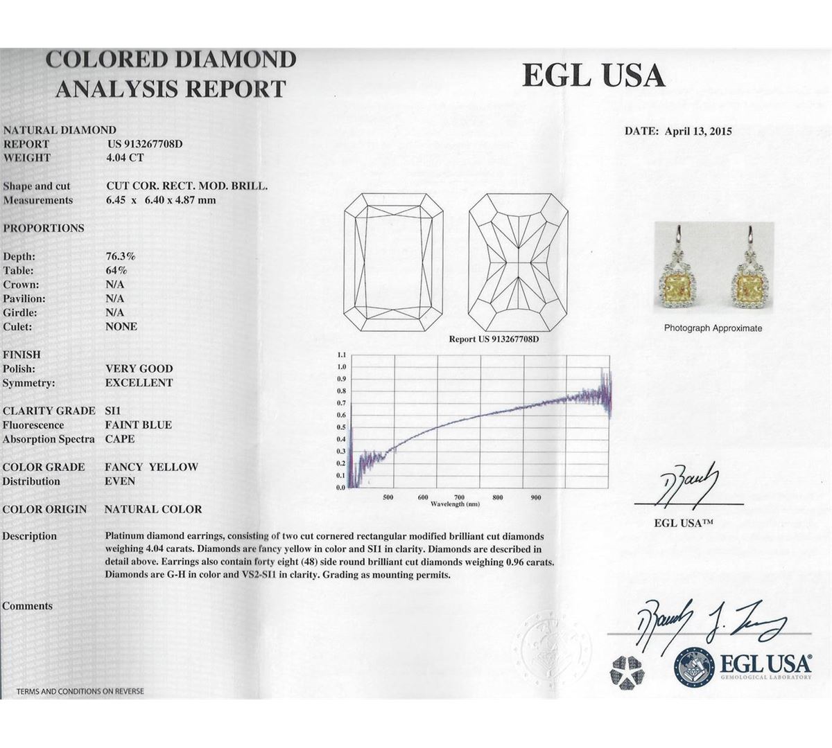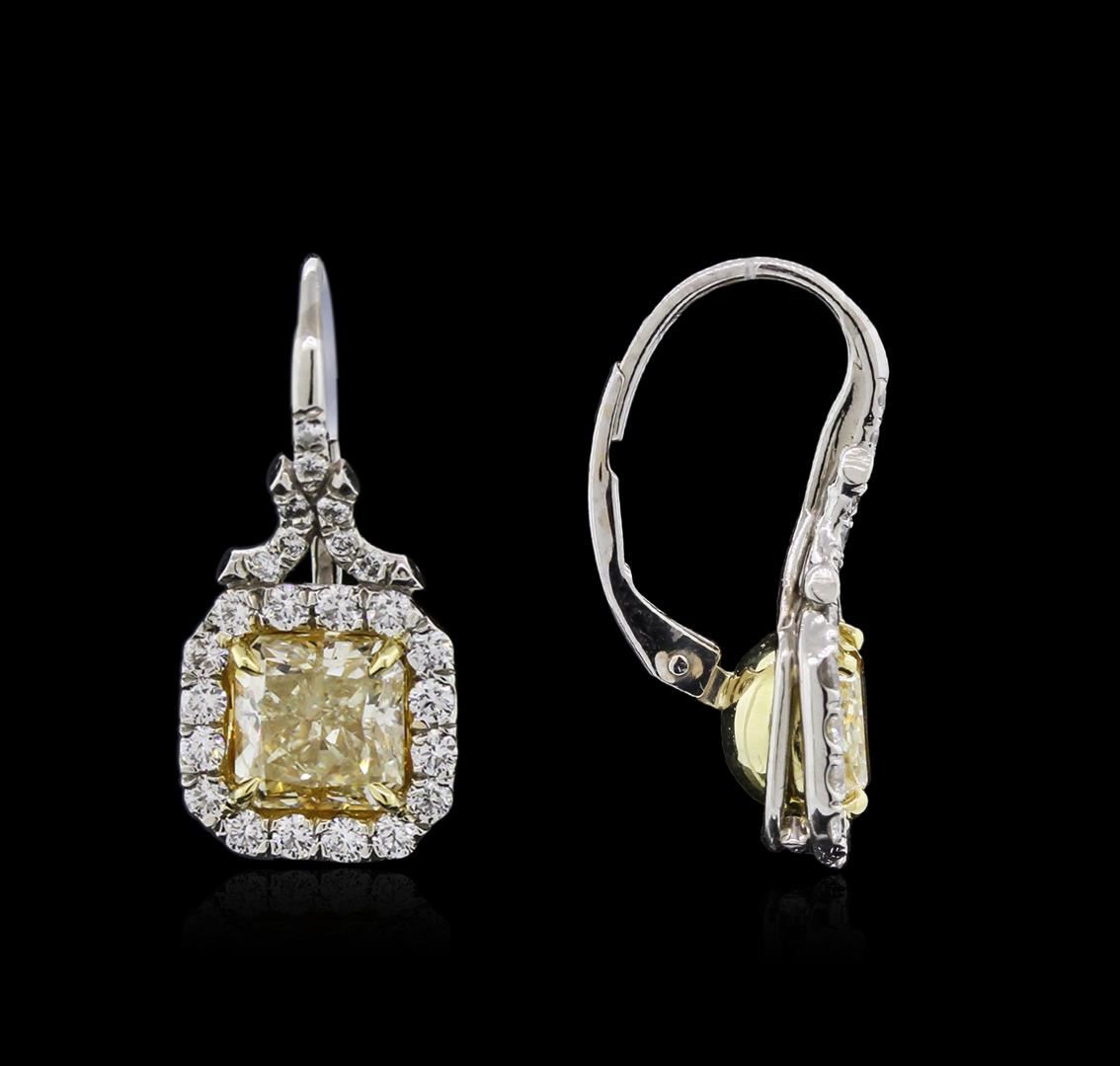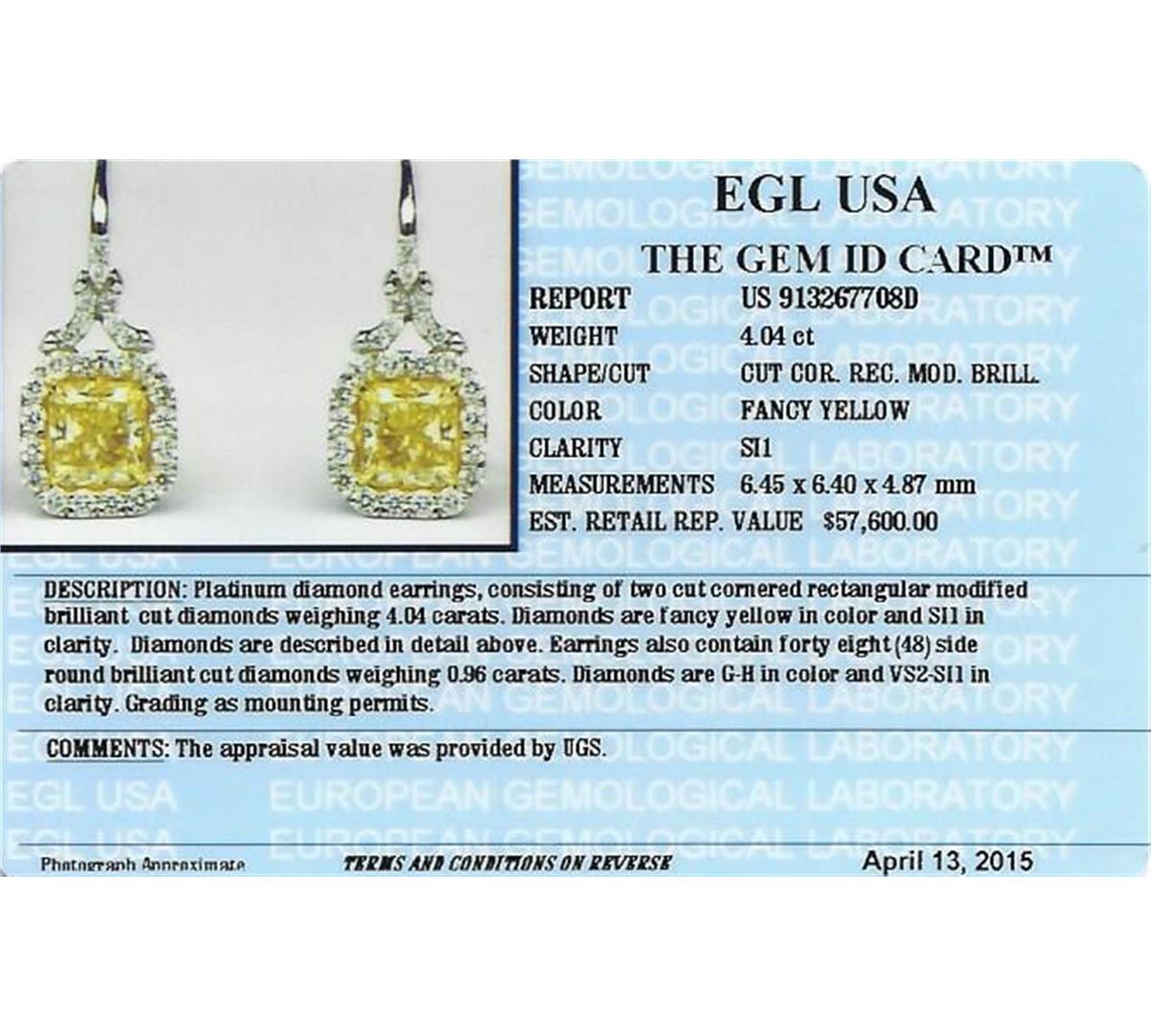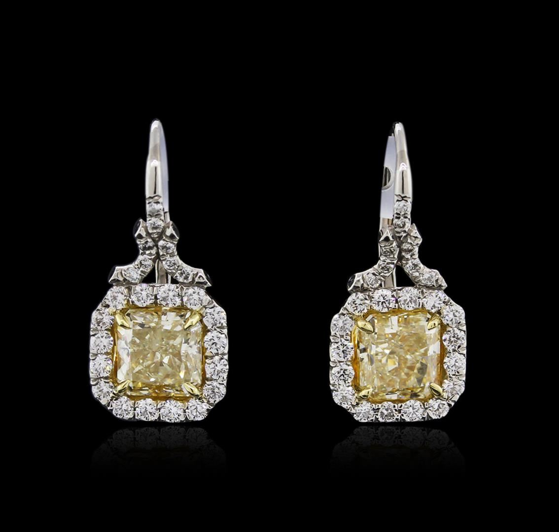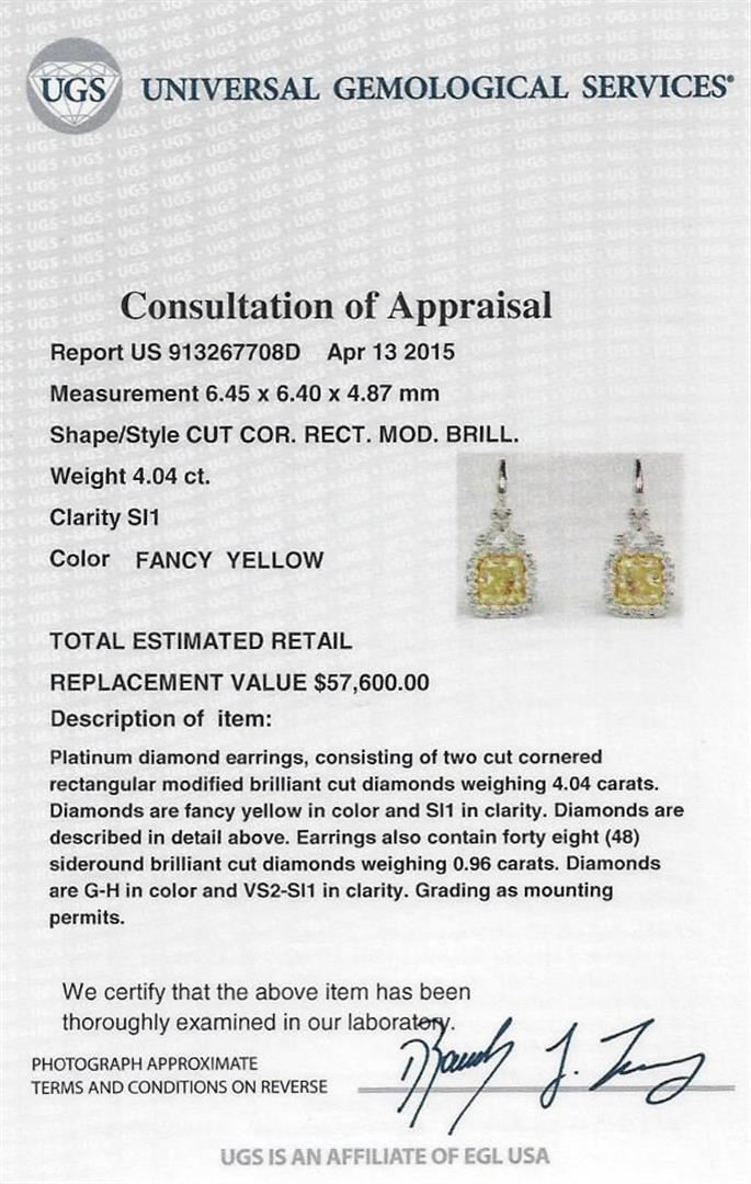 Platinum diamond earrings, consisting of two cut cornered rectangular modified brilliant cut diamonds weighing 4.04 carats. Diamonds are fancy yellow in color and SI1 in clarity. Measurements: 6.45 x 6.40 x 4.87 mm. Earrings also contain forty eight (48) side round brilliant cut diamonds weighing 0.96 carats. Diamonds are G-H in color and VS2-SI1 in clarity. Grading as mounting permits. EGL USA Appraised.