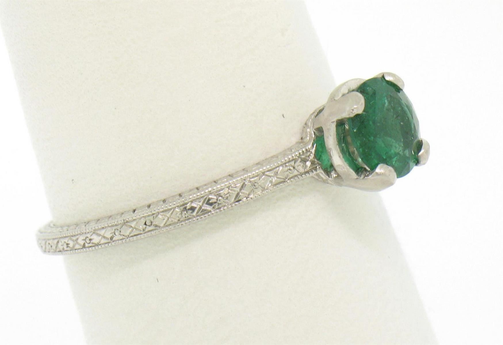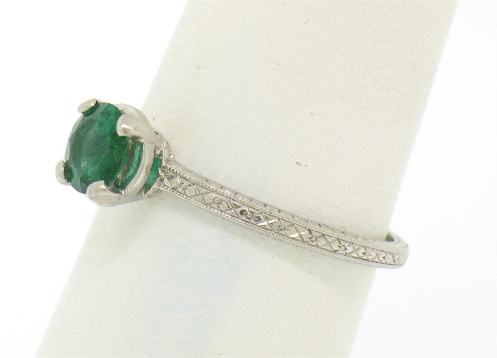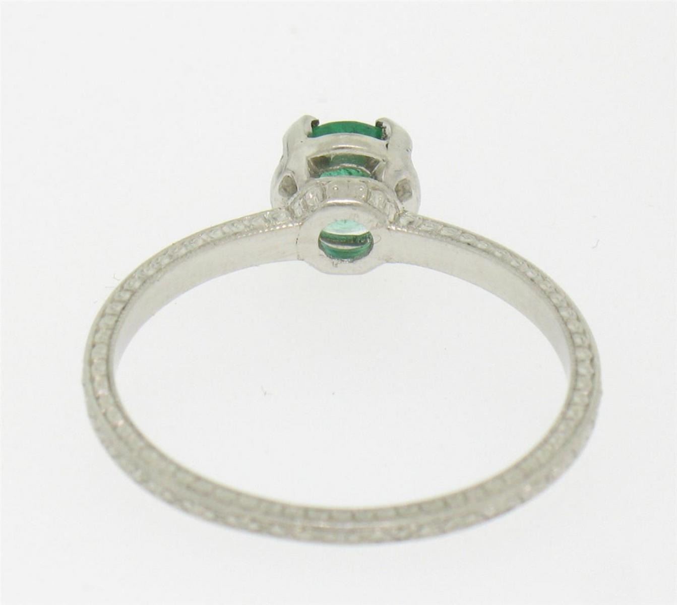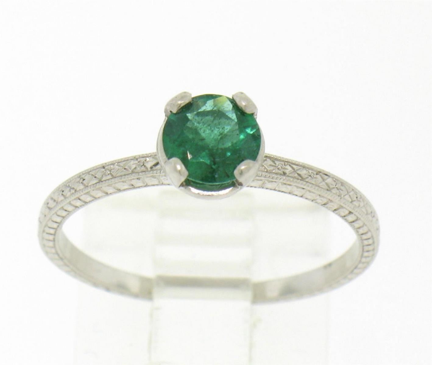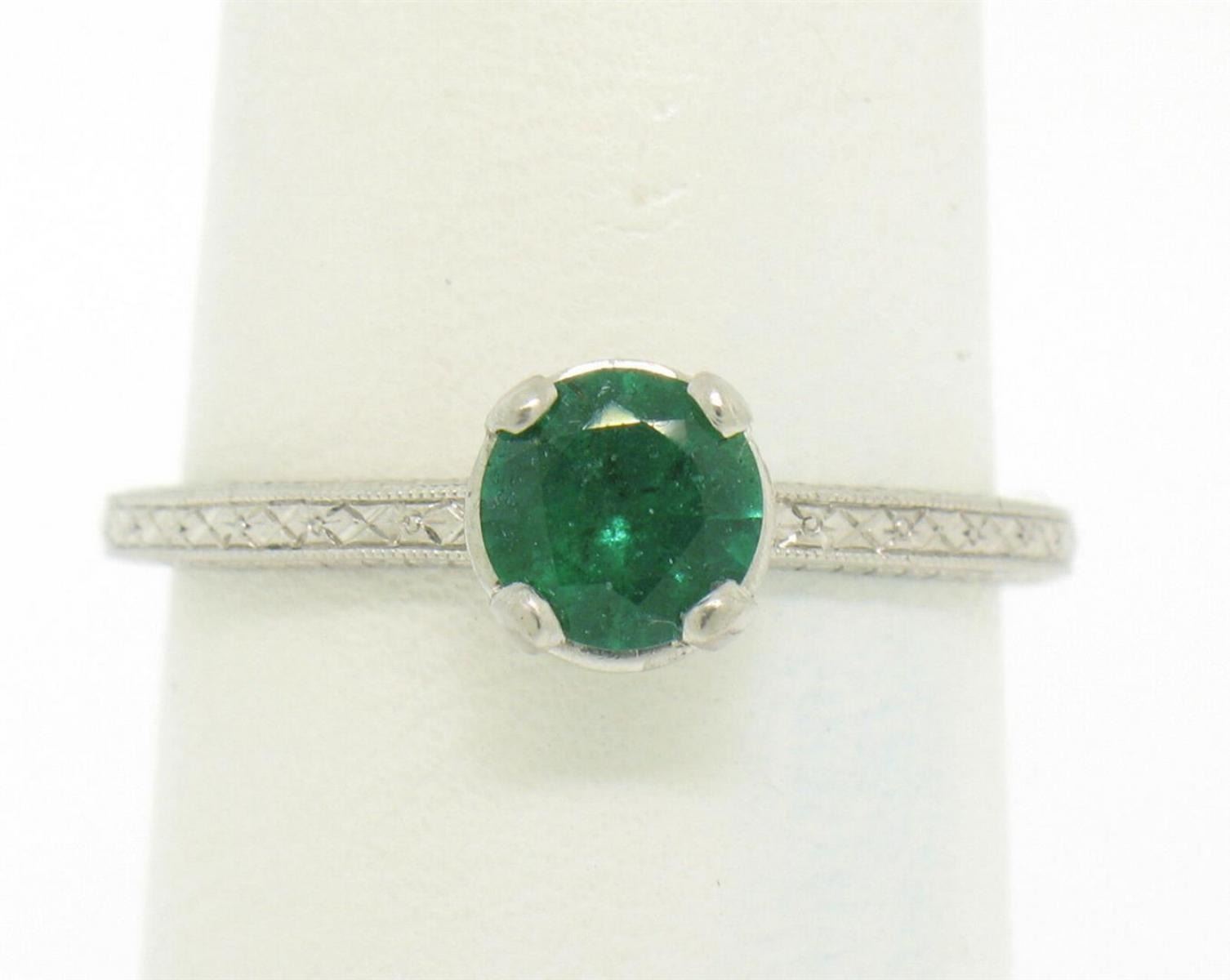 One Vintage Platinum Etched Petite Top quality .51ct Emerald Solitaire Ring Engagement. Item Details: Material: .900 Solid Platinum, Weight: 3.20 Grams, Stone: Natural Genuine Emerald (1) Round Brilliant Cut. Prong set. VERY FINE GREEN COLOR. Rich. Measures 5.70mm. Weighs exactly 0.51cts. VERY FINE AND 100% GUARANTEED GENUINE!, Dimensions/Size: Top of the ring measures 6.30mm wide at its widest and sits 5.60mm high off the finger at its highest point. Ring is a size 8, we can custom size!, Condition: Estate, 100% Excellent and ready to wear for a long long time!