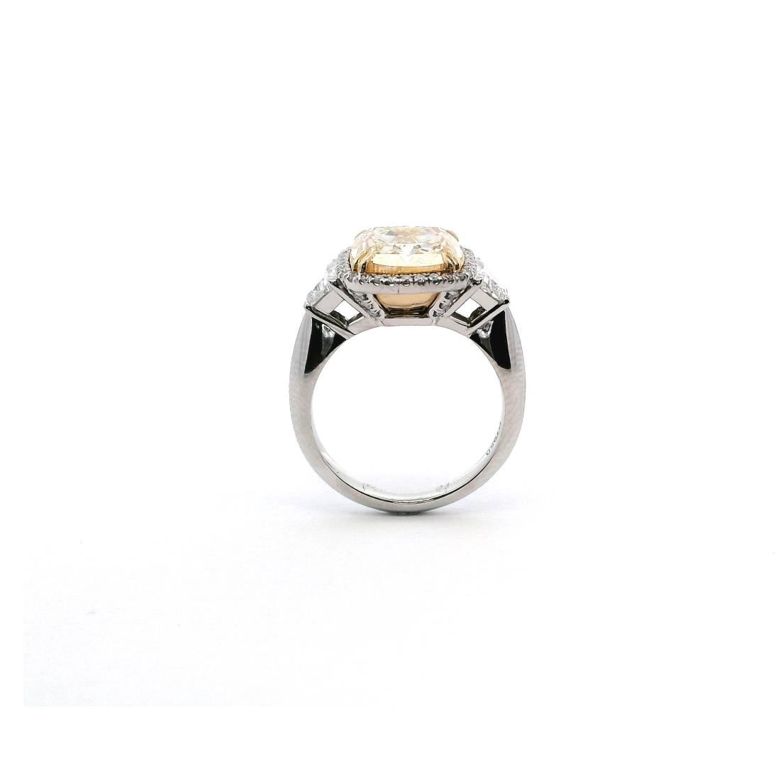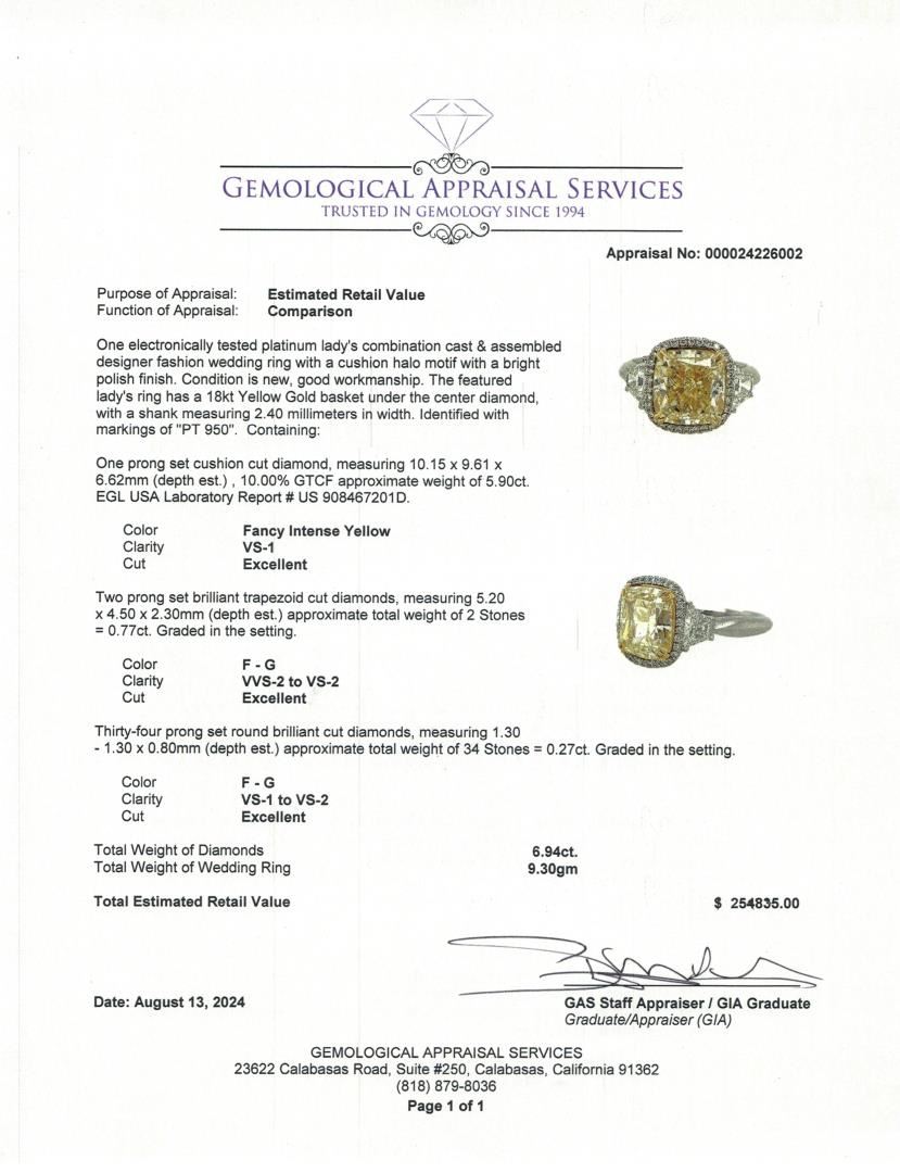 An extraordinary fusion of luxury, this platinum and 18kt yellow gold designer wedding ring features a breathtaking 5.90ct prong-set cushion-cut fancy intense yellow diamond, set in a yellow gold basket to enhance its vibrant hue. Flanking the center stone are two prong-set brilliant trapezoid cut diamonds (0.77ct total), offering a sleek and sophisticated transition. A halo of 34 prong-set round brilliant-cut diamonds (0.27ct total, F-G color, VS-1 to VS-2 clarity, Excellent cut) surrounds the center, adding brilliance. The cushion halo motif and 2.40mm shank width complete this opulent and timeless design.