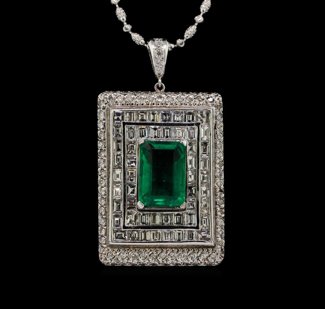 One electronically tested platinum ladies custom cast & assembled emerald and diamond pendant with chain. The pendant features an emerald set within tiered diamond bezels, completed by a diamond set bail. The pendant is supported by a twenty inch length 18KT white gold designer style chain, terminating in a lobster claw clasp. Bright polish finish. Identified with markings of "Pt900". Condition is new, good workmanship. Containing: One prong set octagonal step cut natural emerald, measuring 13.84 x 9.79 x 6.36mm, exact weight 6.98ct., clarity is moderately included, type III, medium dark, very slightly grayish, green color, (GIA G 6/3), cut is good. Transmitting light with a minimum of distortion, transparent. Naturally occurring internal & external characteristics are present. Clarity enhancement. GIA Gemological Report attached. Graded loose prior to setting in the GIA Laboratory, Report #2175051844.One Hundred Thirteen bead set round brilliant cut diamonds, measuring 1.60 - 1.40 x 0.90mm (depth est.) approximate total weight of 113 Stones = 1.40 ct. The color grade reflects the entire range of color for this group. Graded in the setting. Clarity: I-1 to I-2. Color: G - J Fifty-Two channel set baguette cut diamonds, measuring from 2.40 x 2.30 x 1.61mm (depth est.) to 3.50 x 2.20 x 1.54mm (depth est.) approximate total weight of 52 Stones = 2.90 ct. Graded in the setting. Clarity: SI-1 to I-1. Color: G - I. Total Weight of Colored Stones 6.98ct. Total Weight of Diamonds 4.30 ct. AIG Appraised.