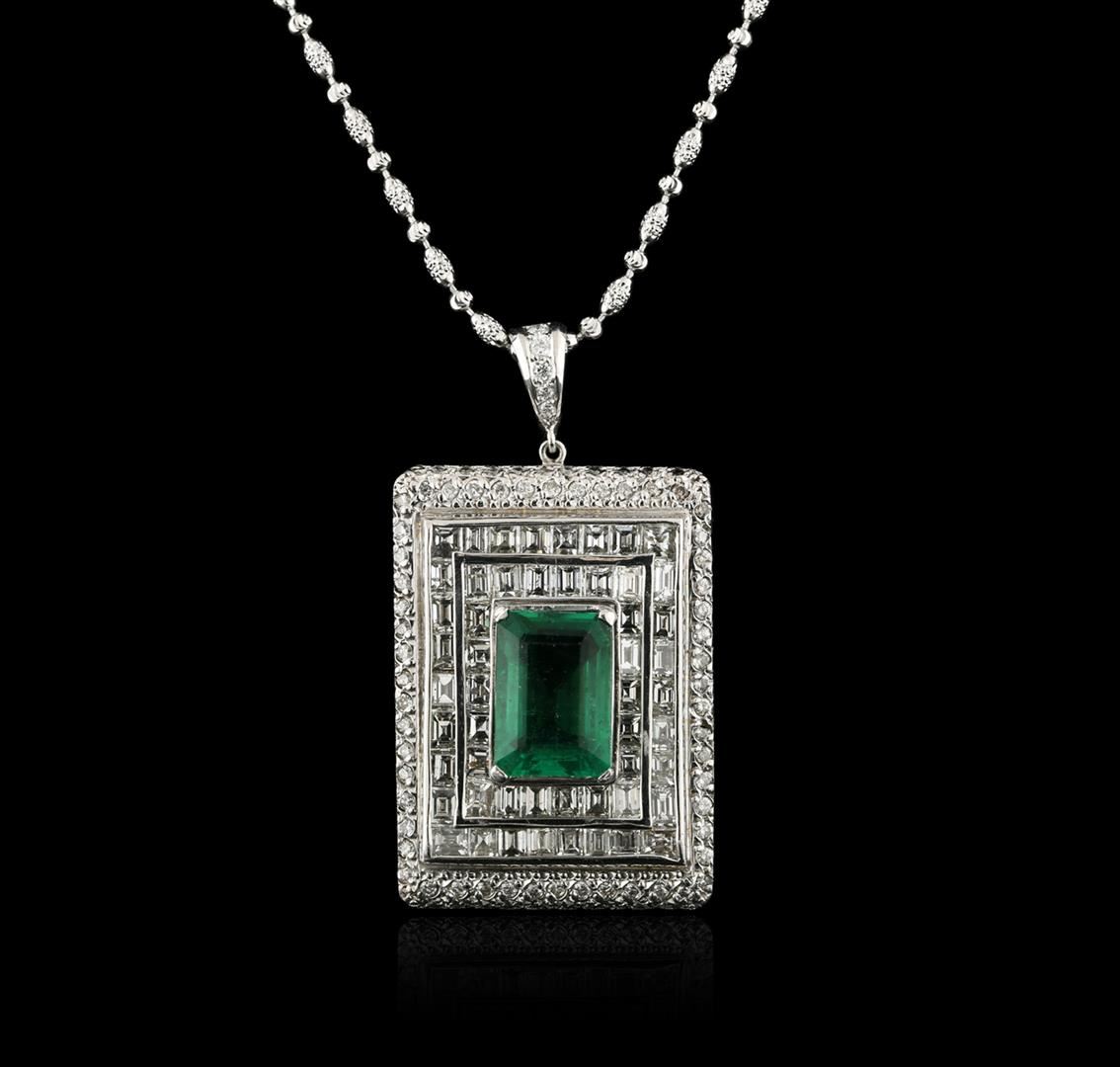 One electronically tested platinum ladies custom cast & assembled emerald and diamond pendant with chain. The pendant features an emerald set within tiered diamond bezels, completed by a diamond set bail. The pendant is supported by a twenty inch length 18KT white gold designer style chain, terminating in a lobster claw clasp. Bright polish finish. Identified with markings of "Pt900". Condition is new, good workmanship. Containing: One prong set octagonal step cut natural emerald, measuring 13.84 x 9.79 x 6.36mm, exact weight 6.98ct., clarity is moderately included, type III, medium dark, very slightly grayish, green color, (GIA G 6/3), cut is good. Transmitting light with a minimum of distortion, transparent. Naturally occurring internal & external characteristics are present. Clarity enhancement. GIA Gemological Report attached. Graded loose prior to setting in the GIA Laboratory, Report #2175051844.One Hundred Thirteen bead set round brilliant cut diamonds, measuring 1.60 - 1.40 x 0.90mm (depth est.) approximate total weight of 113 Stones = 1.40ct. The color grade reflects the entire range of color for this group. Graded in the setting. Clarity: I-1 to I-2. Color: G - J Fifty-Two channel set baguette cut diamonds, measuring from 2.40 x 2.30 x 1.61mm (depth est.) to 3.50 x 2.20 x 1.54mm (depth est.) approximate total weight of 52 Stones = 2.90ct. Graded in the setting. Clarity: SI-1 to I-1. Color: G - I. Total Weight of Colored Stones 6.98ct. Total Weight of Diamonds 4.30ct. AIG Appraised at $41,995.00.