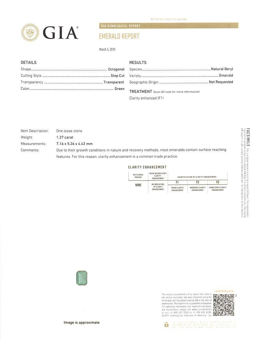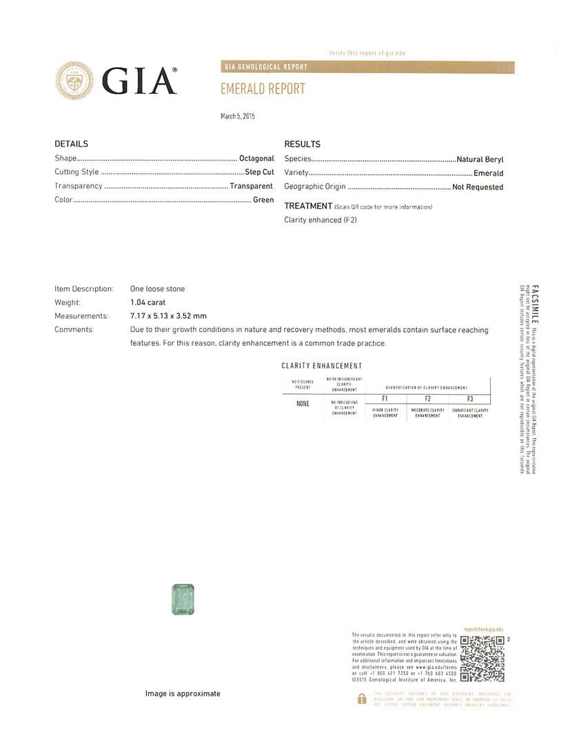 One electronically tested platinum ladies custom cast & assembled emerald and diamond bracelet. Seven and three-eighths inch length bracelet features a one and one-quarter inch wide stylized emerald and diamond ribbon, terminating in a concealed clasp. Bright polish finish. Condition is new, good workmanship. Containing: One prong set octagonal step cut natural emerald, measuring 7.31 x 5.26 x 4.43mm, exact weight 1.35ct., clarity is moderately included, type III, medium dark, very slightly grayish, green color, (GIA G 6/3), cut is good. Transmitting light with a minimum of distortion, transparent. Naturally occurring internal & external characteristics are present. Clarity enhanced. GIA Gemological Report attached. Graded loose prior to setting in the GIA Laboratory, Report #5171048822.One prong set octagonal step cut natural emerald, measuring 7.16 x 5.26 x 4.42mm, exact weight 1.27ct., clarity is moderately included, type III, medium dark, very slightly grayish, green color, (GIA G 6/3), cut is good. Transmitting light with a minimum of distortion, transparent. Naturally occurring internal & external characteristics are present. Clarity enhanced. GIA Gemological Report attached. Graded loose prior to setting in the GIA Laboratory, Report #2175048766.One prong set octagonal step cut natural emerald, measuring 7.13 x 5.25 x 3.63mm, exact weight 1.07ct., clarity is moderately included, type III, medium dark, very slightly grayish, green color, (GIA G 6/3), cut is good. Transmitting light with a minimum of distortion, transparent. Naturally occurring internal & external characteristics are present. Clarity enhanced. GIA Gemological Report attached. Graded loose prior to setting in the GIA Laboratory, Report #2175048808.One prong set octagonal step cut natural emerald, measuring 7.17 x 5.13 x 3.52mm, exact weight 1.04ct., clarity is moderately included, type III, medium dark, very slightly grayish, green color, (GIA G 6/3), cut is good. Transmitting light with a minimum of distortion, transparent. Naturally occurring internal & external characteristics are present. Clarity enhanced. GIA Gemological Report attached. Graded loose prior to setting in the GIA Laboratory, Report #1172048776.One prong set octagonal step cut natural emerald, measuring 7.14 x 5.02 x 3.73mm, exact weight 1.03ct., clarity is moderately included, type III, medium dark, very slightly grayish, green color, (GIA G 6/3), cut is good. Transmitting light with a minimum of distortion, transparent. Naturally occurring internal & external characteristics are present. Clarity enhanced. GIA Gemological Report attached. Graded loose prior to setting in the GIA Laboratory, Report #2175048816.One prong set octagonal step cut natural emerald, measuring 7.00 x 5.25 x 3.66mm, exact weight 0.91ct., clarity is moderately included, type III, medium dark, very slightly grayish, green color, (GIA G 6/3), cut is good. Transmitting light with a minimum of distortion, transparent. Naturally occurring internal & external characteristics are present. Clarity enhanced. Plastic is present in a surface cavity. GIA Gemological Report attached. Graded loose prior to setting in the GIA Laboratory, Report #2171048825.One prong set octagonal step cut natural emerald, measuring 7.01 x 5.00 x 3.63mm, exact weight 0.91ct., clarity is moderately included, type III, medium dark, very slightly grayish, green color, (GIA G 6/3), cut is good. Transmitting light with a minimum of distortion, transparent. Naturally occurring internal & external characteristics are present. Clarity enhanced. GIA Gemological Report attached. Graded loose prior to setting in the GIA Laboratory, Report #1176048790.One prong set octagonal step cut natural emerald, measuring 7.02 x 5.23 x 3.30mm, exact weight 0.91ct., clarity is moderately included, type III, medium dark, very slightly grayish, green color, (GIA G 6/3), cut is good. Transmitting light with a minimum of distortion, transparent. Naturally occurring internal & external characteristics are present. Clarity enhanced. GIA Gemological Report attached. Graded loose prior to setting in the GIA Laboratory, Report #2175048802.One prong set octagonal step cut natural emerald, measuring 6.91 x 5.08 x 3.50mm, exact weight 0.88ct., clarity is moderately included, type III, medium dark, very slightly grayish, green color, (GIA G 6/3), cut is good. Transmitting light with a minimum of distortion, transparent. Naturally occurring internal & external characteristics are present. Clarity enhanced. GIA Gemological Report attached. Graded loose prior to setting in the GIA Laboratory, Report #2175048795.Six Hundred Ninety-Three bead set round brilliant cut diamonds, measuring 1.60 - 1.20 x 0.84mm (depth est.) approximate total weight of 693 Stones = 7.05ct. The color grade reflects the entire range of color for this group. Graded in the setting. Clarity: I-1 to I-2. Color: G - J Fifty-One bead set round brilliant cut diamonds, measuring 2.30 - 1.80 x 1.23mm (depth est.) approximate total weight of 51 Stones = 1.61ct. Graded in the setting. Clarity: SI-1 to SI-2. Color: G - I One Hundred Eighty channel set baguette cut diamonds, measuring from 2.50 x 2.40 x 1.68mm (depth est.) to 3.40 x 2.20 x 1.54mm (depth est.) approximate total weight of 180 Stones = 18.05ct. The color grade reflects the entire range of color for this group. Graded in the setting. Clarity: SI-1 to I-1. Color: G - J. Total Weight of Colored Stones 9.37ct. Total Weight of Diamonds 26.71ct. Each Emerald comes with a GIA certificate. AIG Appraised at $142,265.00.