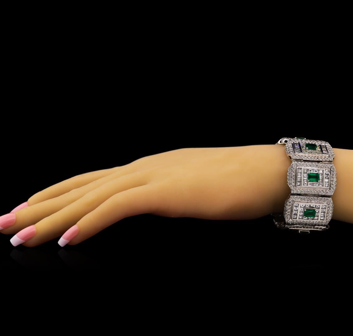 One electronically tested platinum ladies custom cast & assembled emerald and diamond bracelet. Seven and three-eighths inch length bracelet features a one and one-quarter inch wide stylized emerald and diamond ribbon, terminating in a concealed clasp. Bright polish finish. Condition is new, good workmanship. Containing: One prong set octagonal step cut natural emerald, measuring 7.31 x 5.26 x 4.43mm, exact weight 1.35ct., clarity is moderately included, type III, medium dark, very slightly grayish, green color, (GIA G 6/3), cut is good. Transmitting light with a minimum of distortion, transparent. Naturally occurring internal & external characteristics are present. Clarity enhanced. GIA Gemological Report attached. Graded loose prior to setting in the GIA Laboratory, Report #5171048822.One prong set octagonal step cut natural emerald, measuring 7.16 x 5.26 x 4.42mm, exact weight 1.27ct., clarity is moderately included, type III, medium dark, very slightly grayish, green color, (GIA G 6/3), cut is good. Transmitting light with a minimum of distortion, transparent. Naturally occurring internal & external characteristics are present. Clarity enhanced. GIA Gemological Report attached. Graded loose prior to setting in the GIA Laboratory, Report #2175048766.One prong set octagonal step cut natural emerald, measuring 7.13 x 5.25 x 3.63mm, exact weight 1.07ct., clarity is moderately included, type III, medium dark, very slightly grayish, green color, (GIA G 6/3), cut is good. Transmitting light with a minimum of distortion, transparent. Naturally occurring internal & external characteristics are present. Clarity enhanced. GIA Gemological Report attached. Graded loose prior to setting in the GIA Laboratory, Report #2175048808.One prong set octagonal step cut natural emerald, measuring 7.17 x 5.13 x 3.52mm, exact weight 1.04ct., clarity is moderately included, type III, medium dark, very slightly grayish, green color, (GIA G 6/3), cut is good. Transmitting light with a minimum of distortion, transparent. Naturally occurring internal & external characteristics are present. Clarity enhanced. GIA Gemological Report attached. Graded loose prior to setting in the GIA Laboratory, Report #1172048776.One prong set octagonal step cut natural emerald, measuring 7.14 x 5.02 x 3.73mm, exact weight 1.03ct., clarity is moderately included, type III, medium dark, very slightly grayish, green color, (GIA G 6/3), cut is good. Transmitting light with a minimum of distortion, transparent. Naturally occurring internal & external characteristics are present. Clarity enhanced. GIA Gemological Report attached. Graded loose prior to setting in the GIA Laboratory, Report #2175048816.One prong set octagonal step cut natural emerald, measuring 7.00 x 5.25 x 3.66mm, exact weight 0.91ct., clarity is moderately included, type III, medium dark, very slightly grayish, green color, (GIA G 6/3), cut is good. Transmitting light with a minimum of distortion, transparent. Naturally occurring internal & external characteristics are present. Clarity enhanced. Plastic is present in a surface cavity. GIA Gemological Report attached. Graded loose prior to setting in the GIA Laboratory, Report #2171048825.One prong set octagonal step cut natural emerald, measuring 7.01 x 5.00 x 3.63mm, exact weight 0.91ct., clarity is moderately included, type III, medium dark, very slightly grayish, green color, (GIA G 6/3), cut is good. Transmitting light with a minimum of distortion, transparent. Naturally occurring internal & external characteristics are present. Clarity enhanced. GIA Gemological Report attached. Graded loose prior to setting in the GIA Laboratory, Report #1176048790.One prong set octagonal step cut natural emerald, measuring 7.02 x 5.23 x 3.30mm, exact weight 0.91ct., clarity is moderately included, type III, medium dark, very slightly grayish, green color, (GIA G 6/3), cut is good. Transmitting light with a minimum of distortion, transparent. Naturally occurring internal & external characteristics are present. Clarity enhanced. GIA Gemological Report attached. Graded loose prior to setting in the GIA Laboratory, Report #2175048802.One prong set octagonal step cut natural emerald, measuring 6.91 x 5.08 x 3.50mm, exact weight 0.88ct., clarity is moderately included, type III, medium dark, very slightly grayish, green color, (GIA G 6/3), cut is good. Transmitting light with a minimum of distortion, transparent. Naturally occurring internal & external characteristics are present. Clarity enhanced. GIA Gemological Report attached. Graded loose prior to setting in the GIA Laboratory, Report #2175048795.Six Hundred Ninety-Three bead set round brilliant cut diamonds, measuring 1.60 - 1.20 x 0.84mm (depth est.) approximate total weight of 693 Stones = 7.05ct. The color grade reflects the entire range of color for this group. Graded in the setting. Clarity: I-1 to I-2. Color: G - J Fifty-One bead set round brilliant cut diamonds, measuring 2.30 - 1.80 x 1.23mm (depth est.) approximate total weight of 51 Stones = 1.61ct. Graded in the setting. Clarity: SI-1 to SI-2. Color: G - I One Hundred Eighty channel set baguette cut diamonds, measuring from 2.50 x 2.40 x 1.68mm (depth est.) to 3.40 x 2.20 x 1.54mm (depth est.) approximate total weight of 180 Stones = 18.05ct. The color grade reflects the entire range of color for this group. Graded in the setting. Clarity: SI-1 to I-1. Color: G - J. Total Weight of Colored Stones 9.37ct. Total Weight of Diamonds 26.71ct. Each Emerald comes with a GIA certificate. AIG Appraised at $142,265.00.
