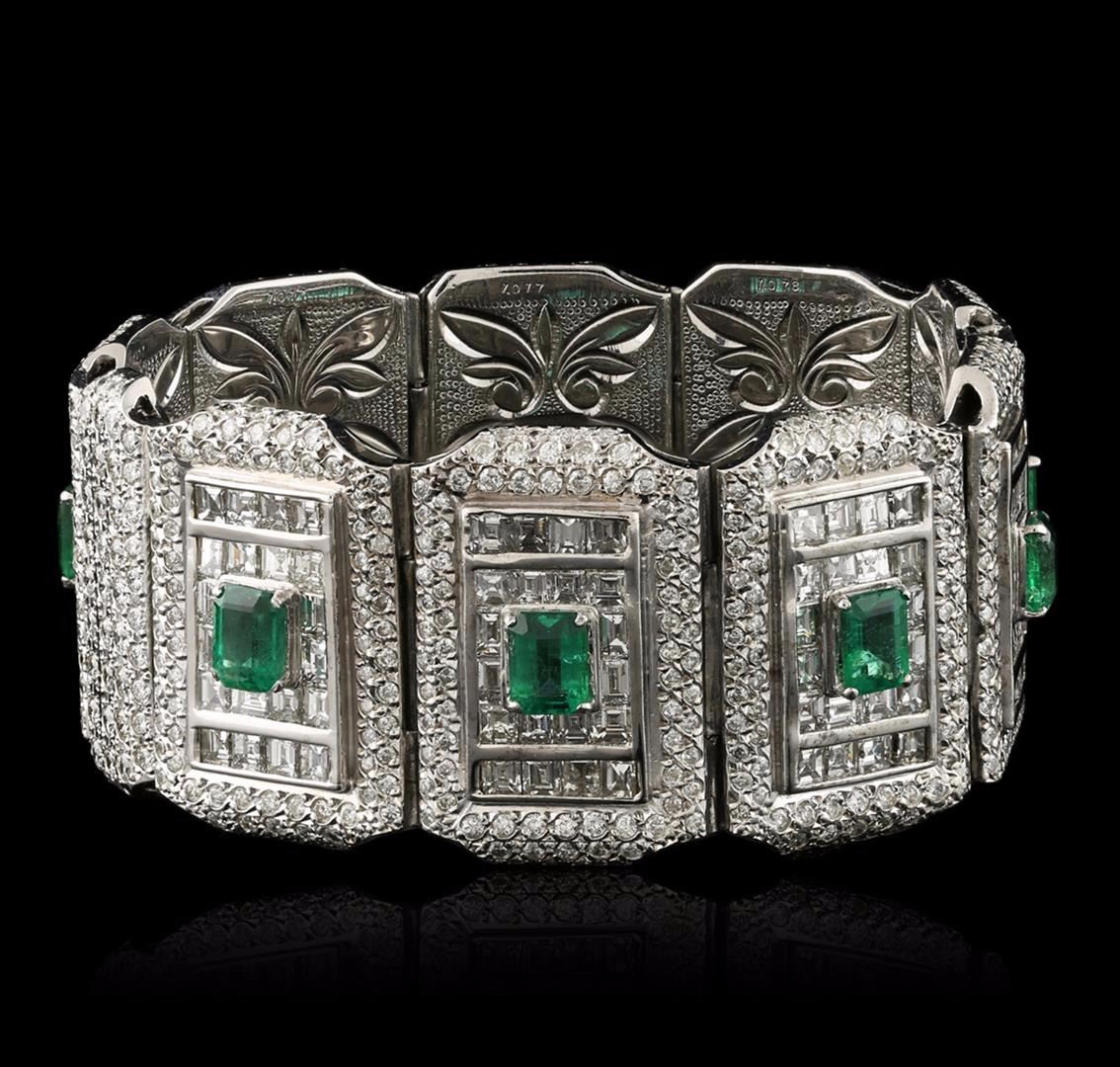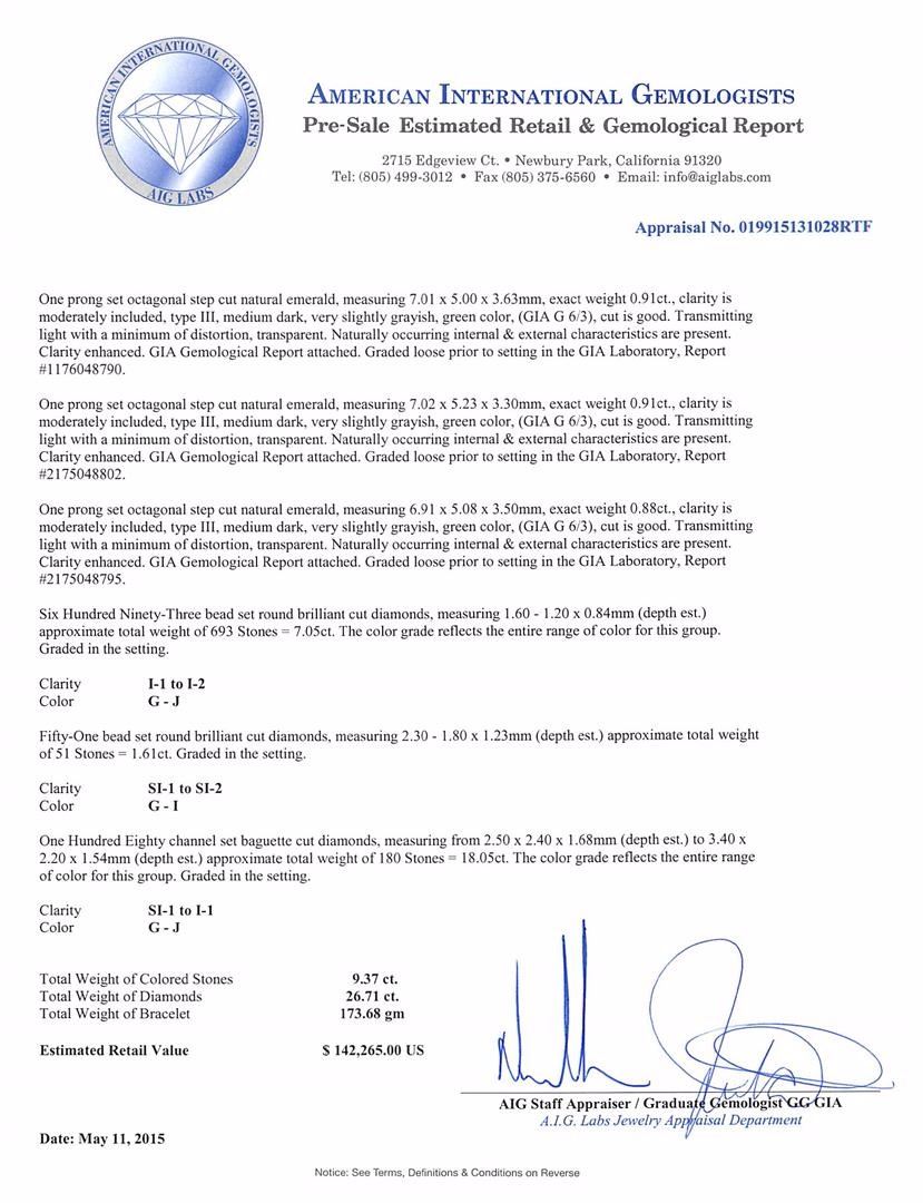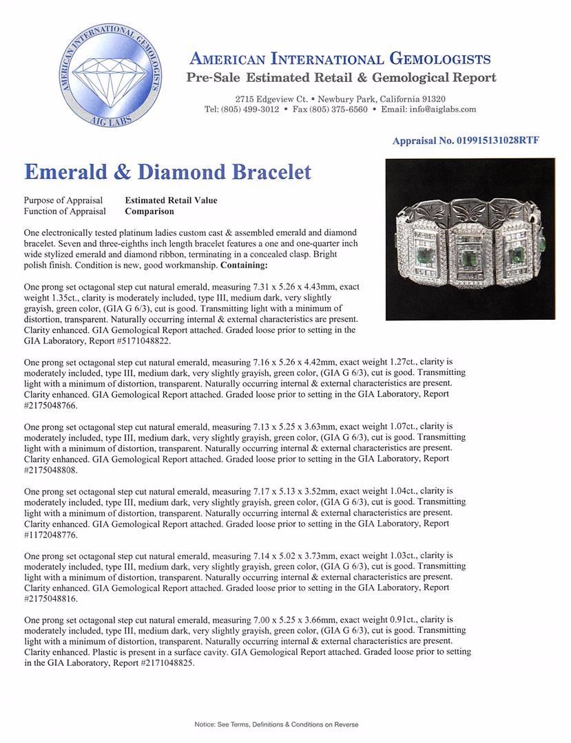One electronically tested platinum ladies custom cast & assembled emerald and diamond bracelet. Seven and three-eighths inch length bracelet features a one and one-quarter inch wide stylized emerald and diamond ribbon, terminating in a concealed clasp. Bright polish finish. Condition is new, good workmanship. Containing: One prong set octagonal step cut natural emerald, measuring 7.31 x 5.26 x 4.43mm, exact weight 1.35ct., clarity is moderately included, type III, medium dark, very slightly grayish, green color, (GIA G 6/3), cut is good. Transmitting light with a minimum of distortion, transparent. Naturally occurring internal & external characteristics are present. Clarity enhanced. GIA Gemological Report attached. Graded loose prior to setting in the GIA Laboratory, Report #5171048822.One prong set octagonal step cut natural emerald, measuring 7.16 x 5.26 x 4.42mm, exact weight 1.27ct., clarity is moderately included, type III, medium dark, very slightly grayish, green color, (GIA G 6/3), cut is good. Transmitting light with a minimum of distortion, transparent. Naturally occurring internal & external characteristics are present. Clarity enhanced. GIA Gemological Report attached. Graded loose prior to setting in the GIA Laboratory, Report #2175048766.One prong set octagonal step cut natural emerald, measuring 7.13 x 5.25 x 3.63mm, exact weight 1.07ct., clarity is moderately included, type III, medium dark, very slightly grayish, green color, (GIA G 6/3), cut is good. Transmitting light with a minimum of distortion, transparent. Naturally occurring internal & external characteristics are present. Clarity enhanced. GIA Gemological Report attached. Graded loose prior to setting in the GIA Laboratory, Report #2175048808.One prong set octagonal step cut natural emerald, measuring 7.17 x 5.13 x 3.52mm, exact weight 1.04ct., clarity is moderately included, type III, medium dark, very slightly grayish, green color, (GIA G 6/3), cut is good. Transmitting light with a minimum of distortion, transparent. Naturally occurring internal & external characteristics are present. Clarity enhanced. GIA Gemological Report attached. Graded loose prior to setting in the GIA Laboratory, Report #1172048776.One prong set octagonal step cut natural emerald, measuring 7.14 x 5.02 x 3.73mm, exact weight 1.03ct., clarity is moderately included, type III, medium dark, very slightly grayish, green color, (GIA G 6/3), cut is good. Transmitting light with a minimum of distortion, transparent. Naturally occurring internal & external characteristics are present. Clarity enhanced. GIA Gemological Report attached. Graded loose prior to setting in the GIA Laboratory, Report #2175048816.One prong set octagonal step cut natural emerald, measuring 7.00 x 5.25 x 3.66mm, exact weight 0.91ct., clarity is moderately included, type III, medium dark, very slightly grayish, green color, (GIA G 6/3), cut is good. Transmitting light with a minimum of distortion, transparent. Naturally occurring internal & external characteristics are present. Clarity enhanced. Plastic is present in a surface cavity. GIA Gemological Report attached. Graded loose prior to setting in the GIA Laboratory, Report #2171048825.One prong set octagonal step cut natural emerald, measuring 7.01 x 5.00 x 3.63mm, exact weight 0.91ct., clarity is moderately included, type III, medium dark, very slightly grayish, green color, (GIA G 6/3), cut is good. Transmitting light with a minimum of distortion, transparent. Naturally occurring internal & external characteristics are present. Clarity enhanced. GIA Gemological Report attached. Graded loose prior to setting in the GIA Laboratory, Report #1176048790.One prong set octagonal step cut natural emerald, measuring 7.02 x 5.23 x 3.30mm, exact weight 0.91ct., clarity is moderately included, type III, medium dark, very slightly grayish, green color, (GIA G 6/3), cut is good. Transmitting light with a minimum of distortion, transparent. Naturally occurring internal & external characteristics are present. Clarity enhanced. GIA Gemological Report attached. Graded loose prior to setting in the GIA Laboratory, Report #2175048802.One prong set octagonal step cut natural emerald, measuring 6.91 x 5.08 x 3.50mm, exact weight 0.88ct., clarity is moderately included, type III, medium dark, very slightly grayish, green color, (GIA G 6/3), cut is good. Transmitting light with a minimum of distortion, transparent. Naturally occurring internal & external characteristics are present. Clarity enhanced. GIA Gemological Report attached. Graded loose prior to setting in the GIA Laboratory, Report #2175048795.Six Hundred Ninety-Three bead set round brilliant cut diamonds, measuring 1.60 - 1.20 x 0.84mm (depth est.) approximate total weight of 693 Stones = 7.05ct. The color grade reflects the entire range of color for this group. Graded in the setting. Clarity: I-1 to I-2. Color: G - J Fifty-One bead set round brilliant cut diamonds, measuring 2.30 - 1.80 x 1.23mm (depth est.) approximate total weight of 51 Stones = 1.61ct. Graded in the setting. Clarity: SI-1 to SI-2. Color: G - I One Hundred Eighty channel set baguette cut diamonds, measuring from 2.50 x 2.40 x 1.68mm (depth est.) to 3.40 x 2.20 x 1.54mm (depth est.) approximate total weight of 180 Stones = 18.05ct. The color grade reflects the entire range of color for this group. Graded in the setting. Clarity: SI-1 to I-1. Color: G - J. Total Weight of Colored Stones 9.37ct. Total Weight of Diamonds 26.71ct. Each Emerald comes with a GIA certificate. AIG Appraised at $142,265.00.