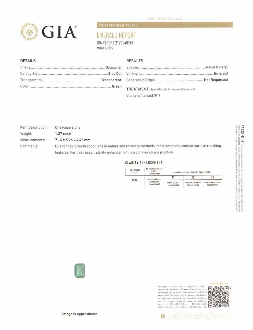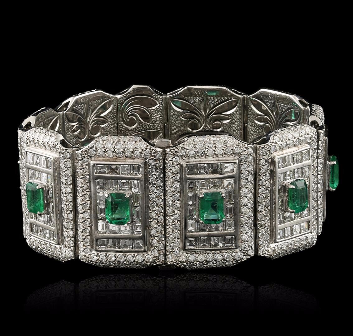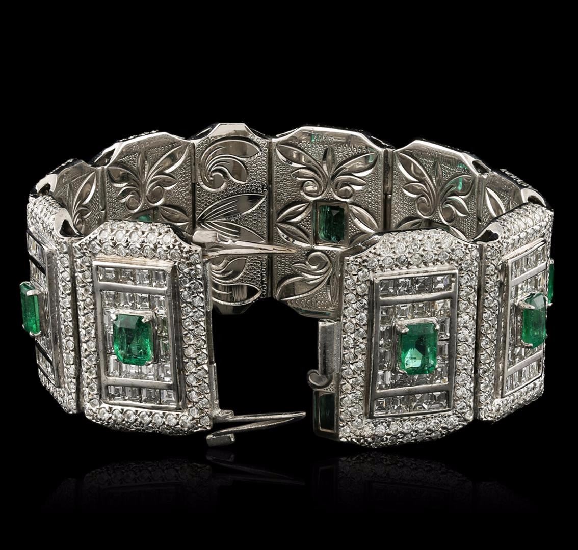 One electronically tested platinum ladies custom cast & assembled emerald and diamond bracelet. Seven and three-eighths inch length bracelet features a one and one-quarter inch wide stylized emerald and diamond ribbon, terminating in a concealed clasp. Bright polish finish. Condition is new, good workmanship. Containing: One prong set octagonal step cut natural emerald, measuring 7.31 x 5.26 x 4.43mm, exact weight 1.35ct., clarity is moderately included, type III, medium dark, very slightly grayish, green color, (GIA G 6/3), cut is good. Transmitting light with a minimum of distortion, transparent. Naturally occurring internal & external characteristics are present. Clarity enhanced. GIA Gemological Report attached. Graded loose prior to setting in the GIA Laboratory, Report #5171048822.One prong set octagonal step cut natural emerald, measuring 7.16 x 5.26 x 4.42mm, exact weight 1.27ct., clarity is moderately included, type III, medium dark, very slightly grayish, green color, (GIA G 6/3), cut is good. Transmitting light with a minimum of distortion, transparent. Naturally occurring internal & external characteristics are present. Clarity enhanced. GIA Gemological Report attached. Graded loose prior to setting in the GIA Laboratory, Report #2175048766.One prong set octagonal step cut natural emerald, measuring 7.13 x 5.25 x 3.63mm, exact weight 1.07ct., clarity is moderately included, type III, medium dark, very slightly grayish, green color, (GIA G 6/3), cut is good. Transmitting light with a minimum of distortion, transparent. Naturally occurring internal & external characteristics are present. Clarity enhanced. GIA Gemological Report attached. Graded loose prior to setting in the GIA Laboratory, Report #2175048808.One prong set octagonal step cut natural emerald, measuring 7.17 x 5.13 x 3.52mm, exact weight 1.04ct., clarity is moderately included, type III, medium dark, very slightly grayish, green color, (GIA G 6/3), cut is good. Transmitting light with a minimum of distortion, transparent. Naturally occurring internal & external characteristics are present. Clarity enhanced. GIA Gemological Report attached. Graded loose prior to setting in the GIA Laboratory, Report #1172048776.One prong set octagonal step cut natural emerald, measuring 7.14 x 5.02 x 3.73mm, exact weight 1.03ct., clarity is moderately included, type III, medium dark, very slightly grayish, green color, (GIA G 6/3), cut is good. Transmitting light with a minimum of distortion, transparent. Naturally occurring internal & external characteristics are present. Clarity enhanced. GIA Gemological Report attached. Graded loose prior to setting in the GIA Laboratory, Report #2175048816.One prong set octagonal step cut natural emerald, measuring 7.00 x 5.25 x 3.66mm, exact weight 0.91ct., clarity is moderately included, type III, medium dark, very slightly grayish, green color, (GIA G 6/3), cut is good. Transmitting light with a minimum of distortion, transparent. Naturally occurring internal & external characteristics are present. Clarity enhanced. Plastic is present in a surface cavity. GIA Gemological Report attached. Graded loose prior to setting in the GIA Laboratory, Report #2171048825.One prong set octagonal step cut natural emerald, measuring 7.01 x 5.00 x 3.63mm, exact weight 0.91ct., clarity is moderately included, type III, medium dark, very slightly grayish, green color, (GIA G 6/3), cut is good. Transmitting light with a minimum of distortion, transparent. Naturally occurring internal & external characteristics are present. Clarity enhanced. GIA Gemological Report attached. Graded loose prior to setting in the GIA Laboratory, Report #1176048790.One prong set octagonal step cut natural emerald, measuring 7.02 x 5.23 x 3.30mm, exact weight 0.91ct., clarity is moderately included, type III, medium dark, very slightly grayish, green color, (GIA G 6/3), cut is good. Transmitting light with a minimum of distortion, transparent. Naturally occurring internal & external characteristics are present. Clarity enhanced. GIA Gemological Report attached. Graded loose prior to setting in the GIA Laboratory, Report #2175048802.One prong set octagonal step cut natural emerald, measuring 6.91 x 5.08 x 3.50mm, exact weight 0.88ct., clarity is moderately included, type III, medium dark, very slightly grayish, green color, (GIA G 6/3), cut is good. Transmitting light with a minimum of distortion, transparent. Naturally occurring internal & external characteristics are present. Clarity enhanced. GIA Gemological Report attached. Graded loose prior to setting in the GIA Laboratory, Report #2175048795.Six Hundred Ninety-Three bead set round brilliant cut diamonds, measuring 1.60 - 1.20 x 0.84mm (depth est.) approximate total weight of 693 Stones = 7.05ct. The color grade reflects the entire range of color for this group. Graded in the setting. Clarity: I-1 to I-2. Color: G - J Fifty-One bead set round brilliant cut diamonds, measuring 2.30 - 1.80 x 1.23mm (depth est.) approximate total weight of 51 Stones = 1.61ct. Graded in the setting. Clarity: SI-1 to SI-2. Color: G - I One Hundred Eighty channel set baguette cut diamonds, measuring from 2.50 x 2.40 x 1.68mm (depth est.) to 3.40 x 2.20 x 1.54mm (depth est.) approximate total weight of 180 Stones = 18.05ct. The color grade reflects the entire range of color for this group. Graded in the setting. Clarity: SI-1 to I-1. Color: G - J. Total Weight of Colored Stones 9.37ct. Total Weight of Diamonds 26.71ct. Each Emerald comes with a GIA certificate. AIG Appraised at $142,265.00.