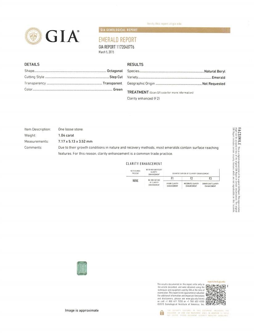 One electronically tested platinum ladies custom cast & assembled emerald and diamond bracelet. Seven and three-eighths inch length bracelet features a one and one-quarter inch wide stylized emerald and diamond ribbon, terminating in a concealed clasp. Bright polish finish. Condition is new, good workmanship. Containing: One prong set octagonal step cut natural emerald, measuring 7.31 x 5.26 x 4.43mm, exact weight 1.35ct., clarity is moderately included, type III, medium dark, very slightly grayish, green color, (GIA G 6/3), cut is good. Transmitting light with a minimum of distortion, transparent. Naturally occurring internal & external characteristics are present. Clarity enhanced. GIA Gemological Report attached. Graded loose prior to setting in the GIA Laboratory, Report #5171048822.One prong set octagonal step cut natural emerald, measuring 7.16 x 5.26 x 4.42mm, exact weight 1.27ct., clarity is moderately included, type III, medium dark, very slightly grayish, green color, (GIA G 6/3), cut is good. Transmitting light with a minimum of distortion, transparent. Naturally occurring internal & external characteristics are present. Clarity enhanced. GIA Gemological Report attached. Graded loose prior to setting in the GIA Laboratory, Report #2175048766.One prong set octagonal step cut natural emerald, measuring 7.13 x 5.25 x 3.63mm, exact weight 1.07ct., clarity is moderately included, type III, medium dark, very slightly grayish, green color, (GIA G 6/3), cut is good. Transmitting light with a minimum of distortion, transparent. Naturally occurring internal & external characteristics are present. Clarity enhanced. GIA Gemological Report attached. Graded loose prior to setting in the GIA Laboratory, Report #2175048808.One prong set octagonal step cut natural emerald, measuring 7.17 x 5.13 x 3.52mm, exact weight 1.04ct., clarity is moderately included, type III, medium dark, very slightly grayish, green color, (GIA G 6/3), cut is good. Transmitting light with a minimum of distortion, transparent. Naturally occurring internal & external characteristics are present. Clarity enhanced. GIA Gemological Report attached. Graded loose prior to setting in the GIA Laboratory, Report #1172048776.One prong set octagonal step cut natural emerald, measuring 7.14 x 5.02 x 3.73mm, exact weight 1.03ct., clarity is moderately included, type III, medium dark, very slightly grayish, green color, (GIA G 6/3), cut is good. Transmitting light with a minimum of distortion, transparent. Naturally occurring internal & external characteristics are present. Clarity enhanced. GIA Gemological Report attached. Graded loose prior to setting in the GIA Laboratory, Report #2175048816.One prong set octagonal step cut natural emerald, measuring 7.00 x 5.25 x 3.66mm, exact weight 0.91ct., clarity is moderately included, type III, medium dark, very slightly grayish, green color, (GIA G 6/3), cut is good. Transmitting light with a minimum of distortion, transparent. Naturally occurring internal & external characteristics are present. Clarity enhanced. Plastic is present in a surface cavity. GIA Gemological Report attached. Graded loose prior to setting in the GIA Laboratory, Report #2171048825.One prong set octagonal step cut natural emerald, measuring 7.01 x 5.00 x 3.63mm, exact weight 0.91ct., clarity is moderately included, type III, medium dark, very slightly grayish, green color, (GIA G 6/3), cut is good. Transmitting light with a minimum of distortion, transparent. Naturally occurring internal & external characteristics are present. Clarity enhanced. GIA Gemological Report attached. Graded loose prior to setting in the GIA Laboratory, Report #1176048790.One prong set octagonal step cut natural emerald, measuring 7.02 x 5.23 x 3.30mm, exact weight 0.91ct., clarity is moderately included, type III, medium dark, very slightly grayish, green color, (GIA G 6/3), cut is good. Transmitting light with a minimum of distortion, transparent. Naturally occurring internal & external characteristics are present. Clarity enhanced. GIA Gemological Report attached. Graded loose prior to setting in the GIA Laboratory, Report #2175048802.One prong set octagonal step cut natural emerald, measuring 6.91 x 5.08 x 3.50mm, exact weight 0.88ct., clarity is moderately included, type III, medium dark, very slightly grayish, green color, (GIA G 6/3), cut is good. Transmitting light with a minimum of distortion, transparent. Naturally occurring internal & external characteristics are present. Clarity enhanced. GIA Gemological Report attached. Graded loose prior to setting in the GIA Laboratory, Report #2175048795.Six Hundred Ninety-Three bead set round brilliant cut diamonds, measuring 1.60 - 1.20 x 0.84mm (depth est.) approximate total weight of 693 Stones = 7.05ct. The color grade reflects the entire range of color for this group. Graded in the setting. Clarity: I-1 to I-2. Color: G - J Fifty-One bead set round brilliant cut diamonds, measuring 2.30 - 1.80 x 1.23mm (depth est.) approximate total weight of 51 Stones = 1.61ct. Graded in the setting. Clarity: SI-1 to SI-2. Color: G - I One Hundred Eighty channel set baguette cut diamonds, measuring from 2.50 x 2.40 x 1.68mm (depth est.) to 3.40 x 2.20 x 1.54mm (depth est.) approximate total weight of 180 Stones = 18.05ct. The color grade reflects the entire range of color for this group. Graded in the setting. Clarity: SI-1 to I-1. Color: G - J. Total Weight of Colored Stones 9.37ct. Total Weight of Diamonds 26.71ct. Each Emerald comes with a GIA certificate. AIG Appraised at $142,265.00.