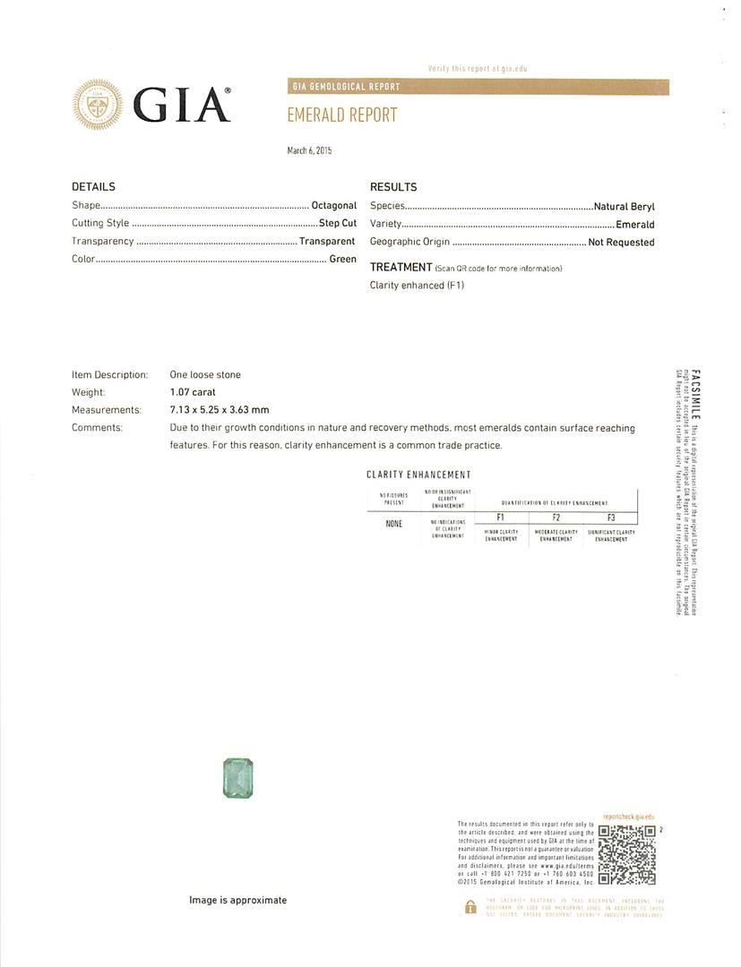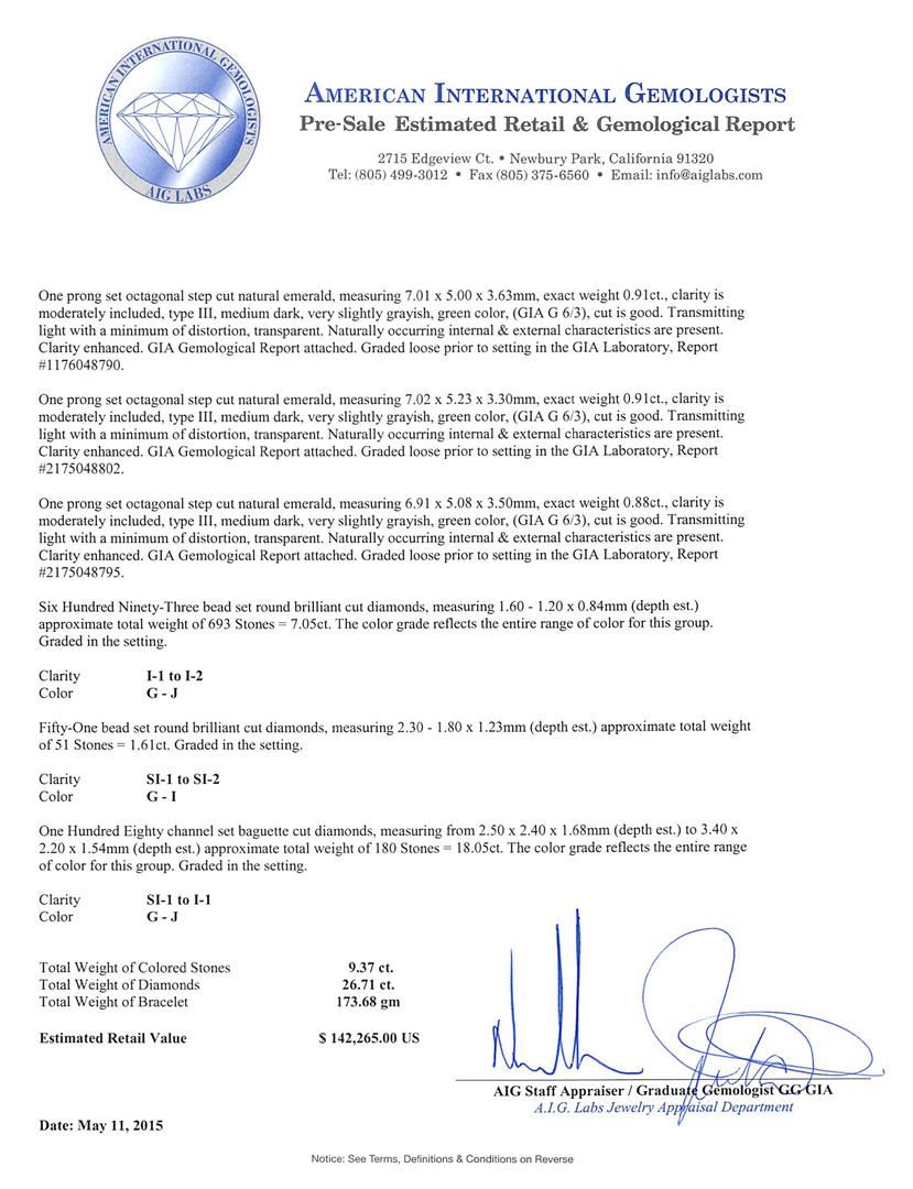 One electronically tested platinum ladies custom cast & assembled emerald and diamond bracelet. Seven and three-eighths inch length bracelet features a one and one-quarter inch wide stylized emerald and diamond ribbon, terminating in a concealed clasp. Bright polish finish. Condition is new, good workmanship. Containing: One prong set octagonal step cut natural emerald, measuring 7.31 x 5.26 x 4.43mm, exact weight 1.35ct., clarity is moderately included, type III, medium dark, very slightly grayish, green color, (GIA G 6/3), cut is good. Transmitting light with a minimum of distortion, transparent. Naturally occurring internal & external characteristics are present. Clarity enhanced. GIA Gemological Report attached. Graded loose prior to setting in the GIA Laboratory, Report #5171048822.One prong set octagonal step cut natural emerald, measuring 7.16 x 5.26 x 4.42mm, exact weight 1.27ct., clarity is moderately included, type III, medium dark, very slightly grayish, green color, (GIA G 6/3), cut is good. Transmitting light with a minimum of distortion, transparent. Naturally occurring internal & external characteristics are present. Clarity enhanced. GIA Gemological Report attached. Graded loose prior to setting in the GIA Laboratory, Report #2175048766.One prong set octagonal step cut natural emerald, measuring 7.13 x 5.25 x 3.63mm, exact weight 1.07ct., clarity is moderately included, type III, medium dark, very slightly grayish, green color, (GIA G 6/3), cut is good. Transmitting light with a minimum of distortion, transparent. Naturally occurring internal & external characteristics are present. Clarity enhanced. GIA Gemological Report attached. Graded loose prior to setting in the GIA Laboratory, Report #2175048808.One prong set octagonal step cut natural emerald, measuring 7.17 x 5.13 x 3.52mm, exact weight 1.04ct., clarity is moderately included, type III, medium dark, very slightly grayish, green color, (GIA G 6/3), cut is good. Transmitting light with a minimum of distortion, transparent. Naturally occurring internal & external characteristics are present. Clarity enhanced. GIA Gemological Report attached. Graded loose prior to setting in the GIA Laboratory, Report #1172048776.One prong set octagonal step cut natural emerald, measuring 7.14 x 5.02 x 3.73mm, exact weight 1.03ct., clarity is moderately included, type III, medium dark, very slightly grayish, green color, (GIA G 6/3), cut is good. Transmitting light with a minimum of distortion, transparent. Naturally occurring internal & external characteristics are present. Clarity enhanced. GIA Gemological Report attached. Graded loose prior to setting in the GIA Laboratory, Report #2175048816.One prong set octagonal step cut natural emerald, measuring 7.00 x 5.25 x 3.66mm, exact weight 0.91ct., clarity is moderately included, type III, medium dark, very slightly grayish, green color, (GIA G 6/3), cut is good. Transmitting light with a minimum of distortion, transparent. Naturally occurring internal & external characteristics are present. Clarity enhanced. Plastic is present in a surface cavity. GIA Gemological Report attached. Graded loose prior to setting in the GIA Laboratory, Report #2171048825.One prong set octagonal step cut natural emerald, measuring 7.01 x 5.00 x 3.63mm, exact weight 0.91ct., clarity is moderately included, type III, medium dark, very slightly grayish, green color, (GIA G 6/3), cut is good. Transmitting light with a minimum of distortion, transparent. Naturally occurring internal & external characteristics are present. Clarity enhanced. GIA Gemological Report attached. Graded loose prior to setting in the GIA Laboratory, Report #1176048790.One prong set octagonal step cut natural emerald, measuring 7.02 x 5.23 x 3.30mm, exact weight 0.91ct., clarity is moderately included, type III, medium dark, very slightly grayish, green color, (GIA G 6/3), cut is good. Transmitting light with a minimum of distortion, transparent. Naturally occurring internal & external characteristics are present. Clarity enhanced. GIA Gemological Report attached. Graded loose prior to setting in the GIA Laboratory, Report #2175048802.One prong set octagonal step cut natural emerald, measuring 6.91 x 5.08 x 3.50mm, exact weight 0.88ct., clarity is moderately included, type III, medium dark, very slightly grayish, green color, (GIA G 6/3), cut is good. Transmitting light with a minimum of distortion, transparent. Naturally occurring internal & external characteristics are present. Clarity enhanced. GIA Gemological Report attached. Graded loose prior to setting in the GIA Laboratory, Report #2175048795.Six Hundred Ninety-Three bead set round brilliant cut diamonds, measuring 1.60 - 1.20 x 0.84mm (depth est.) approximate total weight of 693 Stones = 7.05ct. The color grade reflects the entire range of color for this group. Graded in the setting. Clarity: I-1 to I-2. Color: G - J Fifty-One bead set round brilliant cut diamonds, measuring 2.30 - 1.80 x 1.23mm (depth est.) approximate total weight of 51 Stones = 1.61ct. Graded in the setting. Clarity: SI-1 to SI-2. Color: G - I One Hundred Eighty channel set baguette cut diamonds, measuring from 2.50 x 2.40 x 1.68mm (depth est.) to 3.40 x 2.20 x 1.54mm (depth est.) approximate total weight of 180 Stones = 18.05ct. The color grade reflects the entire range of color for this group. Graded in the setting. Clarity: SI-1 to I-1. Color: G - J. Total Weight of Colored Stones 9.37ct. Total Weight of Diamonds 26.71ct. Each Emerald comes with a GIA certificate. AIG Appraised at $142,265.00.