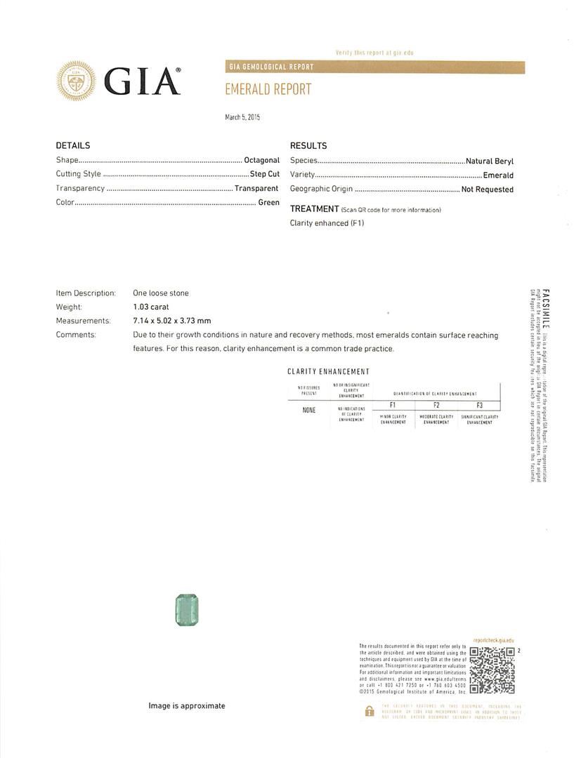 One electronically tested platinum ladies custom cast & assembled emerald and diamond bracelet. Seven and three-eighths inch length bracelet features a one and one-quarter inch wide stylized emerald and diamond ribbon, terminating in a concealed clasp. Bright polish finish. Condition is new, good workmanship. Containing: One prong set octagonal step cut natural emerald, measuring 7.31 x 5.26 x 4.43mm, exact weight 1.35ct., clarity is moderately included, type III, medium dark, very slightly grayish, green color, (GIA G 6/3), cut is good. Transmitting light with a minimum of distortion, transparent. Naturally occurring internal & external characteristics are present. Clarity enhanced. GIA Gemological Report attached. Graded loose prior to setting in the GIA Laboratory, Report #5171048822.One prong set octagonal step cut natural emerald, measuring 7.16 x 5.26 x 4.42mm, exact weight 1.27ct., clarity is moderately included, type III, medium dark, very slightly grayish, green color, (GIA G 6/3), cut is good. Transmitting light with a minimum of distortion, transparent. Naturally occurring internal & external characteristics are present. Clarity enhanced. GIA Gemological Report attached. Graded loose prior to setting in the GIA Laboratory, Report #2175048766.One prong set octagonal step cut natural emerald, measuring 7.13 x 5.25 x 3.63mm, exact weight 1.07ct., clarity is moderately included, type III, medium dark, very slightly grayish, green color, (GIA G 6/3), cut is good. Transmitting light with a minimum of distortion, transparent. Naturally occurring internal & external characteristics are present. Clarity enhanced. GIA Gemological Report attached. Graded loose prior to setting in the GIA Laboratory, Report #2175048808.One prong set octagonal step cut natural emerald, measuring 7.17 x 5.13 x 3.52mm, exact weight 1.04ct., clarity is moderately included, type III, medium dark, very slightly grayish, green color, (GIA G 6/3), cut is good. Transmitting light with a minimum of distortion, transparent. Naturally occurring internal & external characteristics are present. Clarity enhanced. GIA Gemological Report attached. Graded loose prior to setting in the GIA Laboratory, Report #1172048776.One prong set octagonal step cut natural emerald, measuring 7.14 x 5.02 x 3.73mm, exact weight 1.03ct., clarity is moderately included, type III, medium dark, very slightly grayish, green color, (GIA G 6/3), cut is good. Transmitting light with a minimum of distortion, transparent. Naturally occurring internal & external characteristics are present. Clarity enhanced. GIA Gemological Report attached. Graded loose prior to setting in the GIA Laboratory, Report #2175048816.One prong set octagonal step cut natural emerald, measuring 7.00 x 5.25 x 3.66mm, exact weight 0.91ct., clarity is moderately included, type III, medium dark, very slightly grayish, green color, (GIA G 6/3), cut is good. Transmitting light with a minimum of distortion, transparent. Naturally occurring internal & external characteristics are present. Clarity enhanced. Plastic is present in a surface cavity. GIA Gemological Report attached. Graded loose prior to setting in the GIA Laboratory, Report #2171048825.One prong set octagonal step cut natural emerald, measuring 7.01 x 5.00 x 3.63mm, exact weight 0.91ct., clarity is moderately included, type III, medium dark, very slightly grayish, green color, (GIA G 6/3), cut is good. Transmitting light with a minimum of distortion, transparent. Naturally occurring internal & external characteristics are present. Clarity enhanced. GIA Gemological Report attached. Graded loose prior to setting in the GIA Laboratory, Report #1176048790.One prong set octagonal step cut natural emerald, measuring 7.02 x 5.23 x 3.30mm, exact weight 0.91ct., clarity is moderately included, type III, medium dark, very slightly grayish, green color, (GIA G 6/3), cut is good. Transmitting light with a minimum of distortion, transparent. Naturally occurring internal & external characteristics are present. Clarity enhanced. GIA Gemological Report attached. Graded loose prior to setting in the GIA Laboratory, Report #2175048802.One prong set octagonal step cut natural emerald, measuring 6.91 x 5.08 x 3.50mm, exact weight 0.88ct., clarity is moderately included, type III, medium dark, very slightly grayish, green color, (GIA G 6/3), cut is good. Transmitting light with a minimum of distortion, transparent. Naturally occurring internal & external characteristics are present. Clarity enhanced. GIA Gemological Report attached. Graded loose prior to setting in the GIA Laboratory, Report #2175048795.Six Hundred Ninety-Three bead set round brilliant cut diamonds, measuring 1.60 - 1.20 x 0.84mm (depth est.) approximate total weight of 693 Stones = 7.05ct. The color grade reflects the entire range of color for this group. Graded in the setting. Clarity: I-1 to I-2. Color: G - J Fifty-One bead set round brilliant cut diamonds, measuring 2.30 - 1.80 x 1.23mm (depth est.) approximate total weight of 51 Stones = 1.61ct. Graded in the setting. Clarity: SI-1 to SI-2. Color: G - I One Hundred Eighty channel set baguette cut diamonds, measuring from 2.50 x 2.40 x 1.68mm (depth est.) to 3.40 x 2.20 x 1.54mm (depth est.) approximate total weight of 180 Stones = 18.05ct. The color grade reflects the entire range of color for this group. Graded in the setting. Clarity: SI-1 to I-1. Color: G - J. Total Weight of Colored Stones 9.37ct. Total Weight of Diamonds 26.71ct. Each Emerald comes with a GIA certificate. AIG Appraised at $142,265.00.
