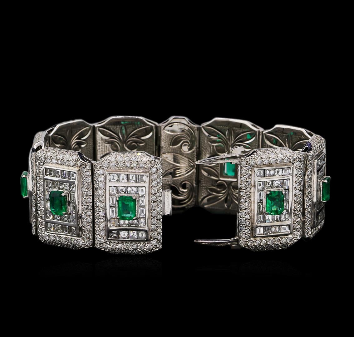 One electronically tested platinum ladies custom cast & assembled emerald and diamond bracelet. Seven and three-eighths inch length bracelet features a one and one-quarter inch wide stylized emerald and diamond ribbon, terminating in a concealed clasp. Bright polish finish. Condition is new, good workmanship. Containing: One prong set octagonal step cut natural emerald, measuring 7.31 x 5.26 x 4.43mm, exact weight 1.35ct., clarity is moderately included, type III, medium dark, very slightly grayish, green color, (GIA G 6/3), cut is good. Transmitting light with a minimum of distortion, transparent. Naturally occurring internal & external characteristics are present. Clarity enhanced. GIA Gemological Report attached. Graded loose prior to setting in the GIA Laboratory, Report #5171048822.One prong set octagonal step cut natural emerald, measuring 7.16 x 5.26 x 4.42mm, exact weight 1.27ct., clarity is moderately included, type III, medium dark, very slightly grayish, green color, (GIA G 6/3), cut is good. Transmitting light with a minimum of distortion, transparent. Naturally occurring internal & external characteristics are present. Clarity enhanced. GIA Gemological Report attached. Graded loose prior to setting in the GIA Laboratory, Report #2175048766.One prong set octagonal step cut natural emerald, measuring 7.13 x 5.25 x 3.63mm, exact weight 1.07ct., clarity is moderately included, type III, medium dark, very slightly grayish, green color, (GIA G 6/3), cut is good. Transmitting light with a minimum of distortion, transparent. Naturally occurring internal & external characteristics are present. Clarity enhanced. GIA Gemological Report attached. Graded loose prior to setting in the GIA Laboratory, Report #2175048808.One prong set octagonal step cut natural emerald, measuring 7.17 x 5.13 x 3.52mm, exact weight 1.04ct., clarity is moderately included, type III, medium dark, very slightly grayish, green color, (GIA G 6/3), cut is good. Transmitting light with a minimum of distortion, transparent. Naturally occurring internal & external characteristics are present. Clarity enhanced. GIA Gemological Report attached. Graded loose prior to setting in the GIA Laboratory, Report #1172048776.One prong set octagonal step cut natural emerald, measuring 7.14 x 5.02 x 3.73mm, exact weight 1.03ct., clarity is moderately included, type III, medium dark, very slightly grayish, green color, (GIA G 6/3), cut is good. Transmitting light with a minimum of distortion, transparent. Naturally occurring internal & external characteristics are present. Clarity enhanced. GIA Gemological Report attached. Graded loose prior to setting in the GIA Laboratory, Report #2175048816.One prong set octagonal step cut natural emerald, measuring 7.00 x 5.25 x 3.66mm, exact weight 0.91ct., clarity is moderately included, type III, medium dark, very slightly grayish, green color, (GIA G 6/3), cut is good. Transmitting light with a minimum of distortion, transparent. Naturally occurring internal & external characteristics are present. Clarity enhanced. Plastic is present in a surface cavity. GIA Gemological Report attached. Graded loose prior to setting in the GIA Laboratory, Report #2171048825.One prong set octagonal step cut natural emerald, measuring 7.01 x 5.00 x 3.63mm, exact weight 0.91ct., clarity is moderately included, type III, medium dark, very slightly grayish, green color, (GIA G 6/3), cut is good. Transmitting light with a minimum of distortion, transparent. Naturally occurring internal & external characteristics are present. Clarity enhanced. GIA Gemological Report attached. Graded loose prior to setting in the GIA Laboratory, Report #1176048790.One prong set octagonal step cut natural emerald, measuring 7.02 x 5.23 x 3.30mm, exact weight 0.91ct., clarity is moderately included, type III, medium dark, very slightly grayish, green color, (GIA G 6/3), cut is good. Transmitting light with a minimum of distortion, transparent. Naturally occurring internal & external characteristics are present. Clarity enhanced. GIA Gemological Report attached. Graded loose prior to setting in the GIA Laboratory, Report #2175048802.One prong set octagonal step cut natural emerald, measuring 6.91 x 5.08 x 3.50mm, exact weight 0.88ct., clarity is moderately included, type III, medium dark, very slightly grayish, green color, (GIA G 6/3), cut is good. Transmitting light with a minimum of distortion, transparent. Naturally occurring internal & external characteristics are present. Clarity enhanced. GIA Gemological Report attached. Graded loose prior to setting in the GIA Laboratory, Report #2175048795.Six Hundred Ninety-Three bead set round brilliant cut diamonds, measuring 1.60 - 1.20 x 0.84mm (depth est.) approximate total weight of 693 Stones = 7.05ct. The color grade reflects the entire range of color for this group. Graded in the setting. Clarity: I-1 to I-2. Color: G - J Fifty-One bead set round brilliant cut diamonds, measuring 2.30 - 1.80 x 1.23mm (depth est.) approximate total weight of 51 Stones = 1.61ct. Graded in the setting. Clarity: SI-1 to SI-2. Color: G - I One Hundred Eighty channel set baguette cut diamonds, measuring from 2.50 x 2.40 x 1.68mm (depth est.) to 3.40 x 2.20 x 1.54mm (depth est.) approximate total weight of 180 Stones = 18.05ct. The color grade reflects the entire range of color for this group. Graded in the setting. Clarity: SI-1 to I-1. Color: G - J. Total Weight of Colored Stones 9.37ct. Total Weight of Diamonds 26.71ct. Each Emerald comes with a GIA certificate. AIG Appraised at $142,265.00.