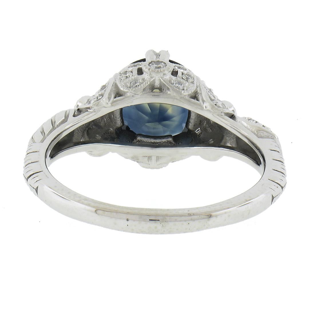 A solid platinum ribbon ring, with 1 GIA graded round cut natural sapphire (2.25ct), and 38 round cut natural diamonds (F/G - VS1/VS2 ; 0.32ctw). The ring is size 6.25, weighs a total of 6.37 grams, and measures 9.2mm wide. Comes with all original relevant certifications.