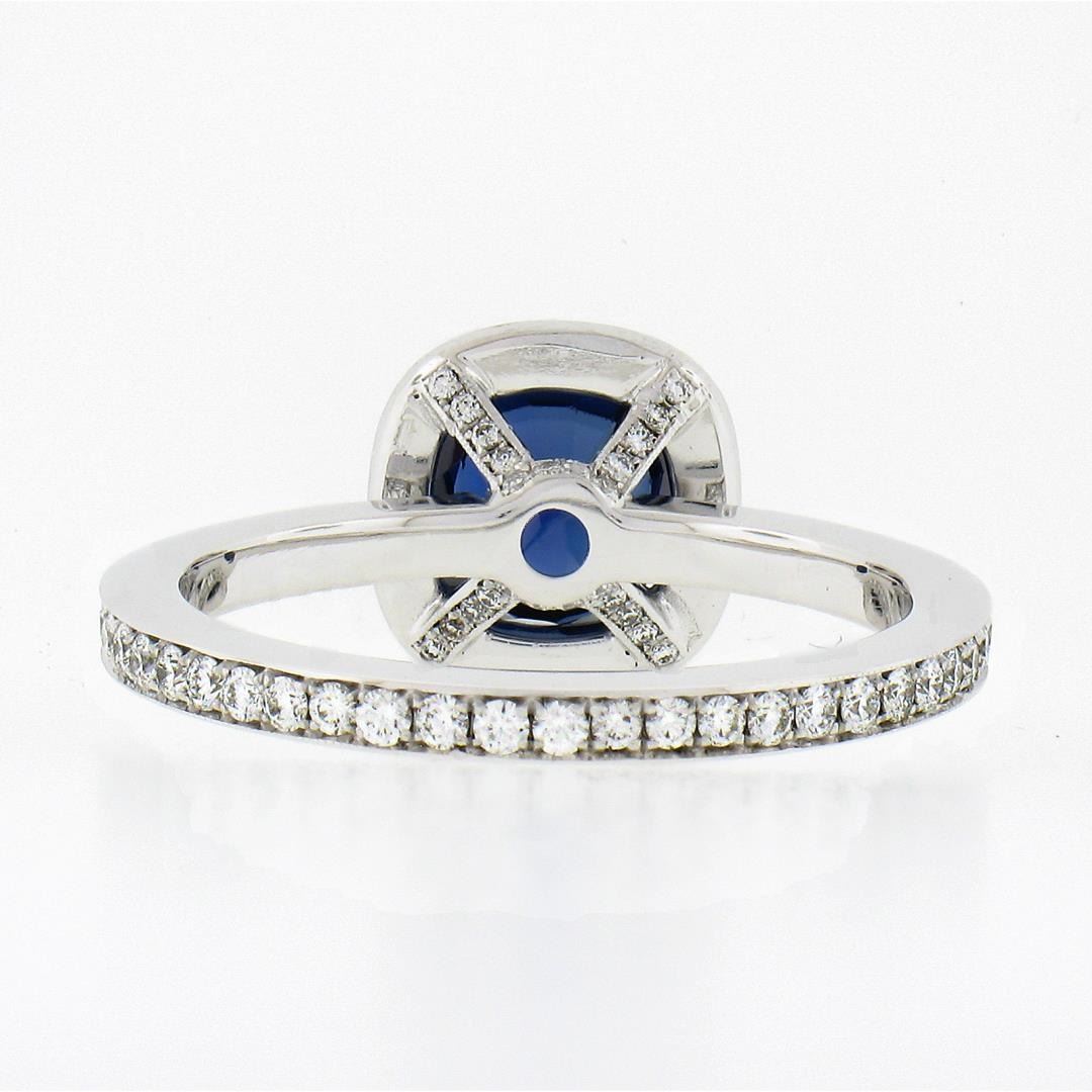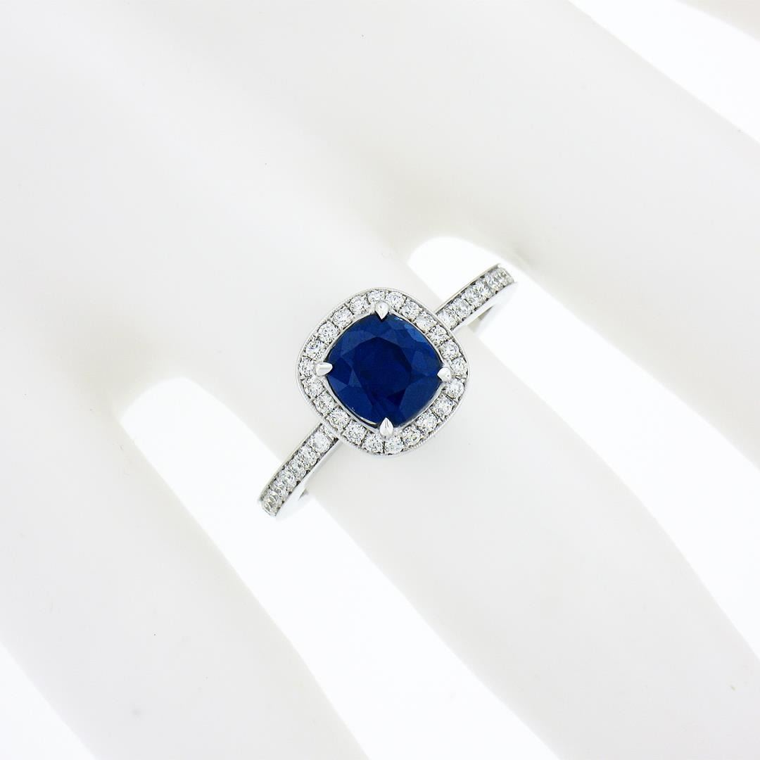 A solid platinum engagement ring, with 1 GIA graded cushion cut natural sapphire (NO HEAT - 1.37ct ), and a halo of 90 round brilliant cut natural diamonds (F/G - VS1/VS2 ; 0.90ctw). The ring is size 6.0, weighs a total of 4.68 grams, and measures 9.40mm wide. Comes with all original relevant certifications.
