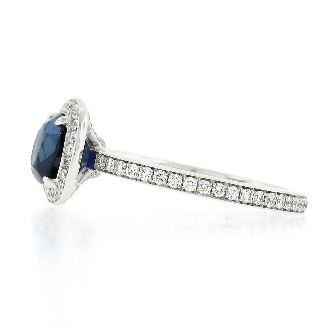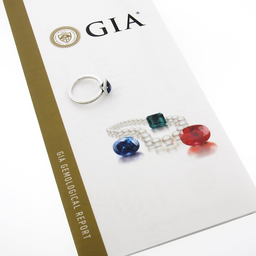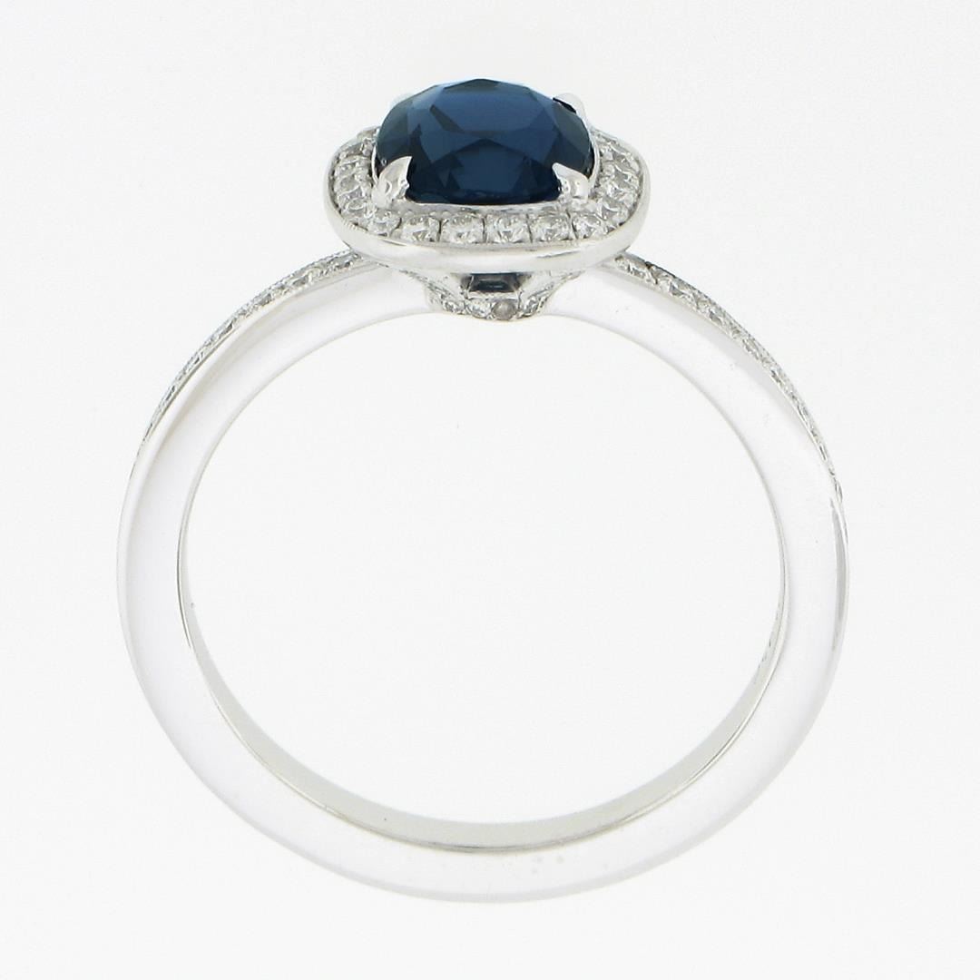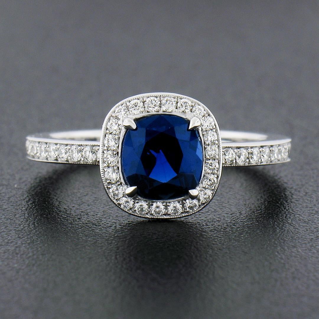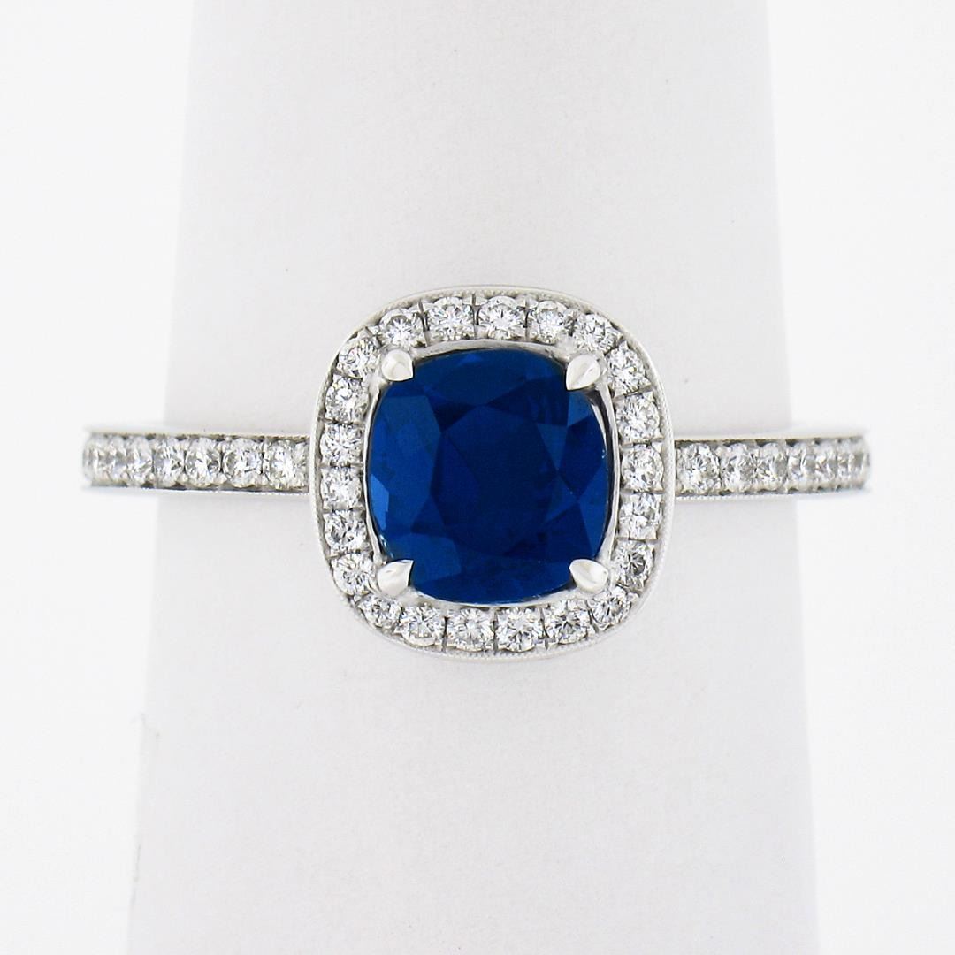 A solid platinum engagement ring, with 1 GIA graded cushion cut natural sapphire (NO HEAT - 1.37ct ), and a halo of 90 round brilliant cut natural diamonds (F/G - VS1/VS2 ; 0.90ctw). The ring is size 6.0, weighs a total of 4.68 grams, and measures 9.40mm wide. Comes with all original relevant certifications.
