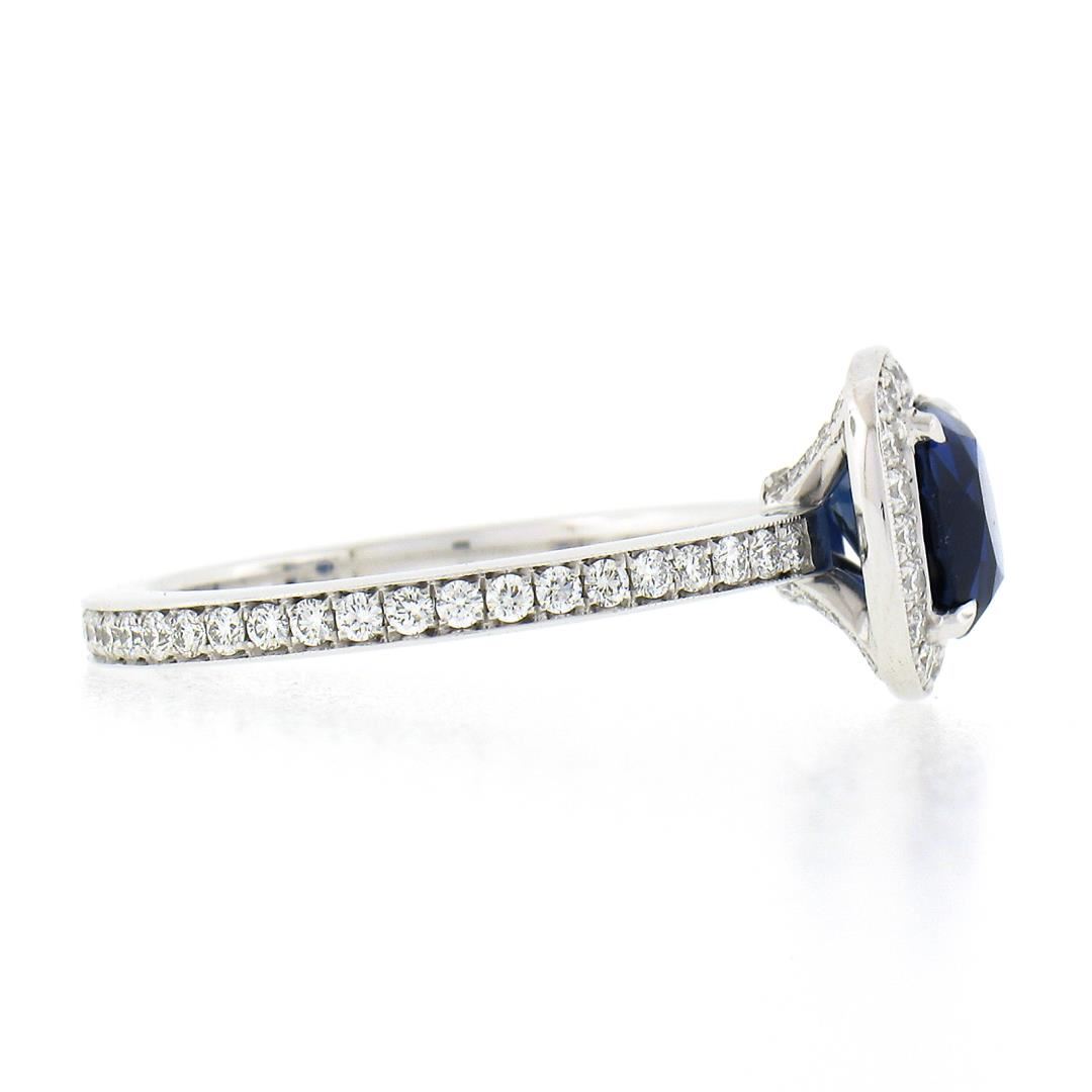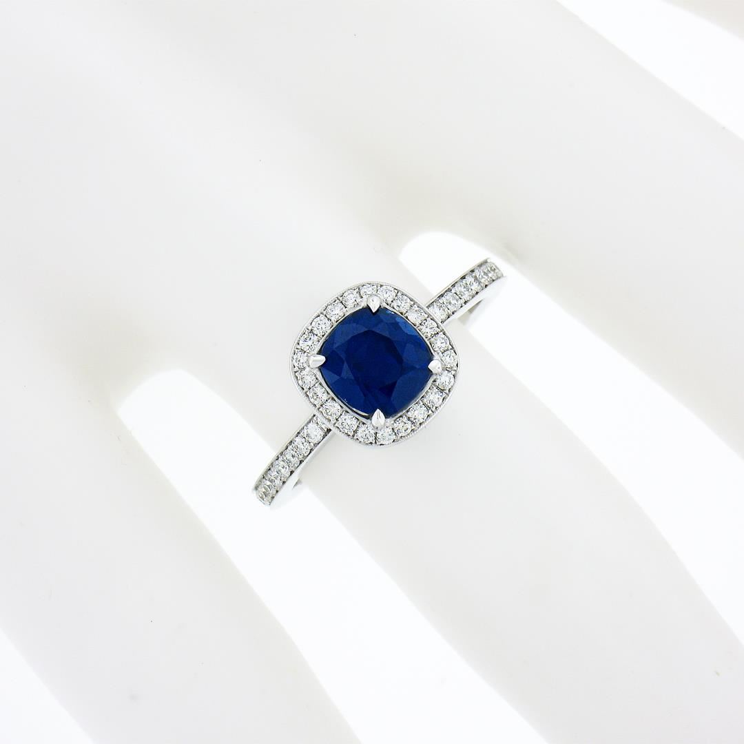 A solid platinum engagement ring, with 1 GIA graded cushion cut natural sapphire (NO HEAT - 1.37ct ), and a halo of 90 round brilliant cut natural diamonds (F/G - VS1/VS2 ; 0.90ctw). The ring is size 6.0, weighs a total of 4.68 grams, and measures 9.40mm wide. Comes with all original relevant certifications.