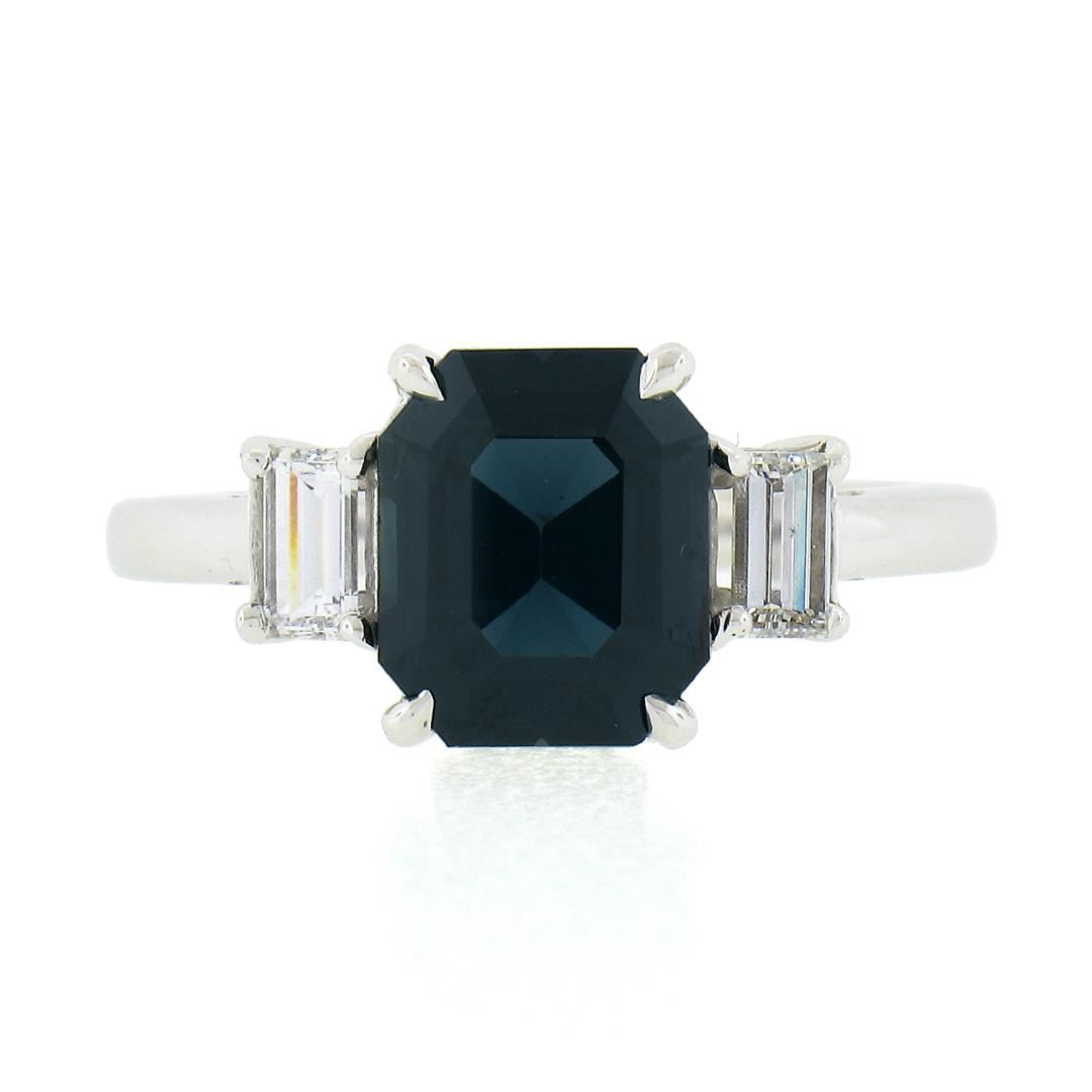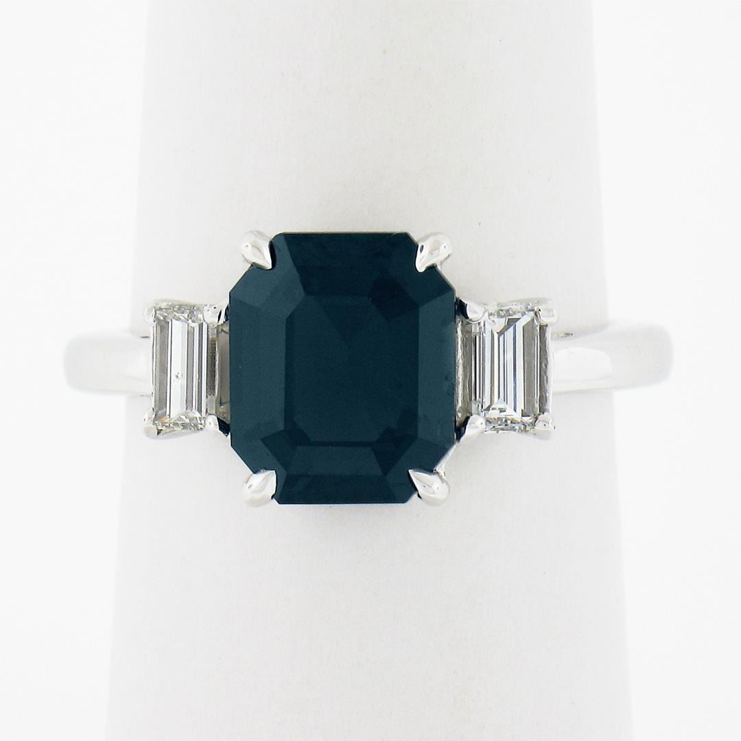 A new solid platinum ring, with 1 GIA graded octagonal cut natural sapphire (3.03ct ), and 2 emerald cut natural diamonds (G/H - VS1/VS2 ; 0.54ctw). The ring is size 6.5, weighs a total of 5.71 grams, and measures 9.2mm wide. Comes with all original relevant certifications.