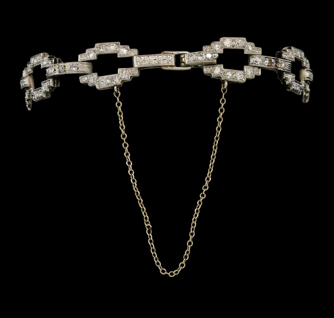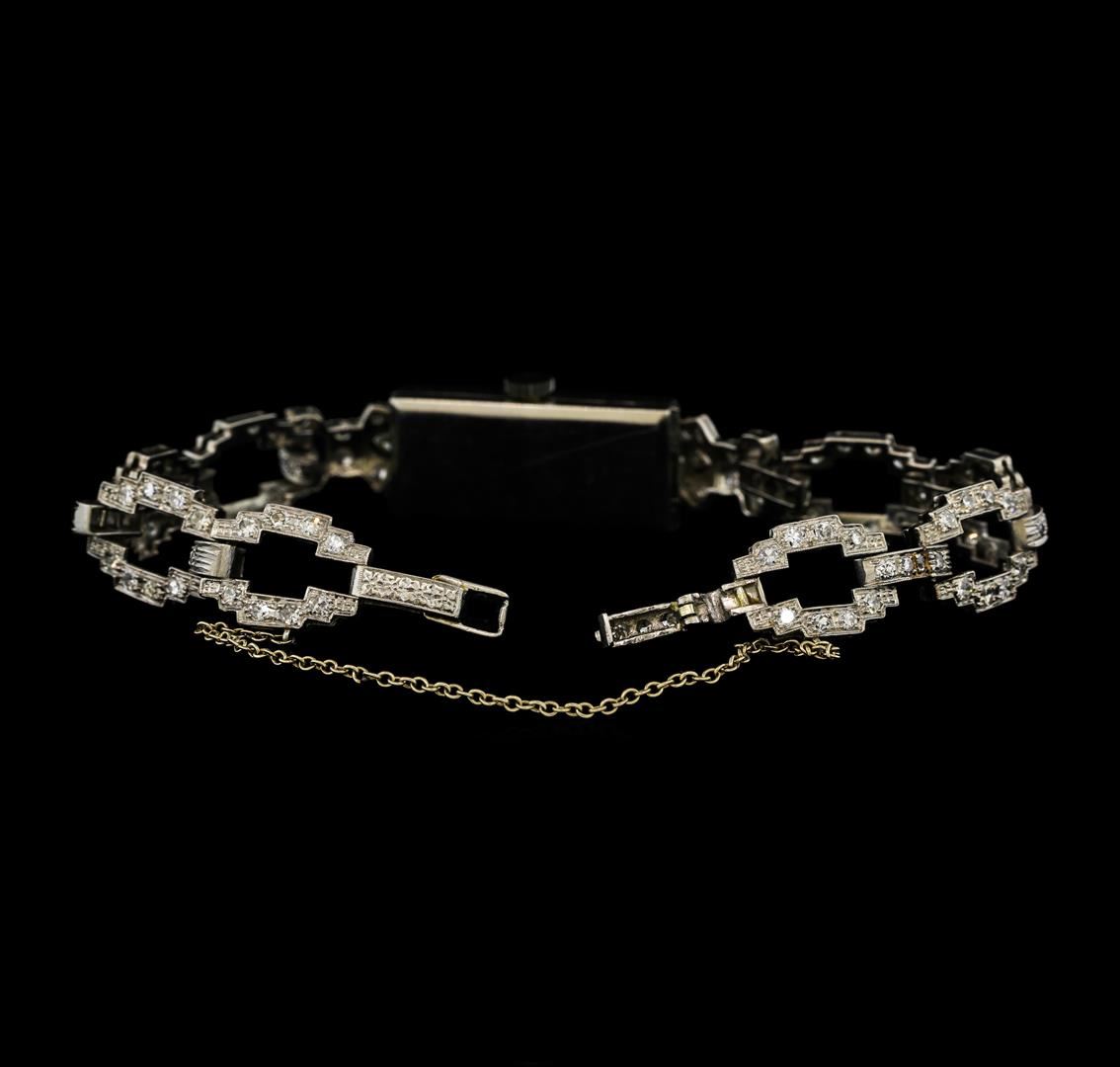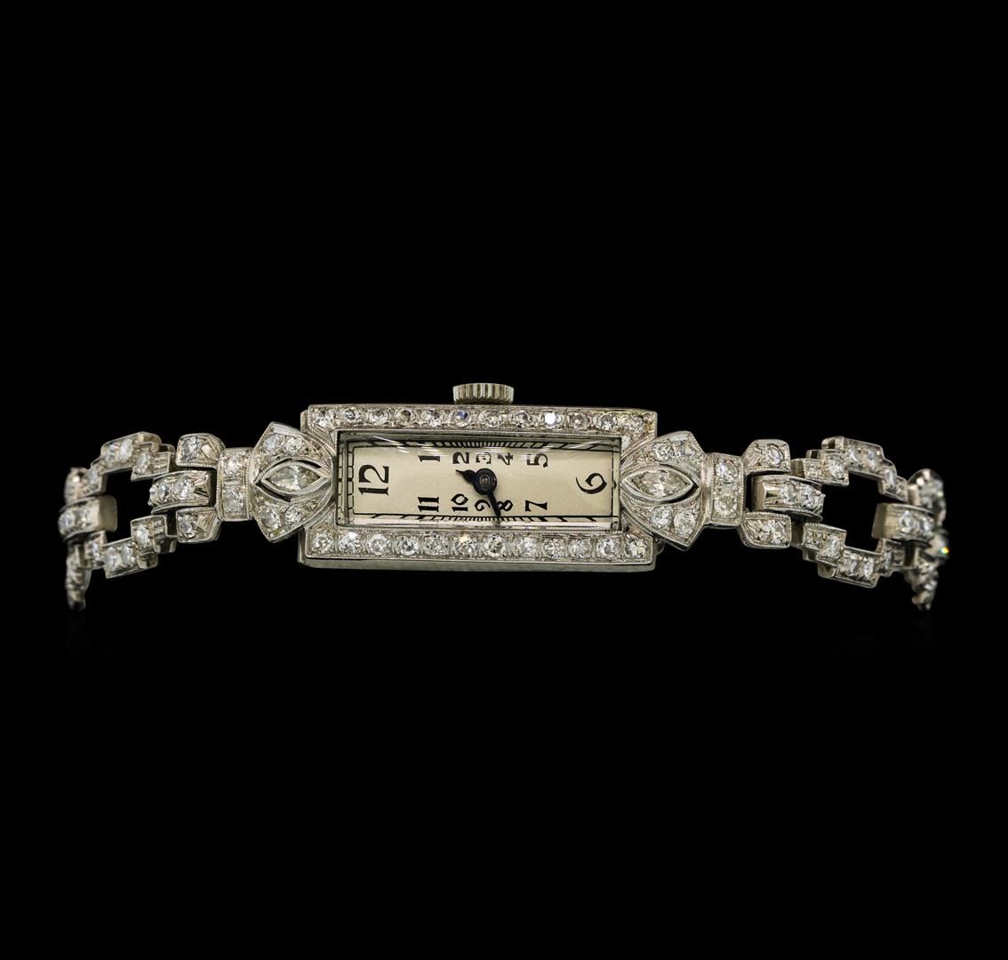 One platinum Longines Art Deco diamond ladies wristwatch with mechanical movement, 17 jewels. Movement signed "Longines". Case and Lugs: Platinum, diamond bezel, acrylic crystal, measures 23mm x 10mm. Signed " 10%IRID-PLAT". Dial: Silver in color with Arabic markers and pointed hands. Bracelet: Platinum set with diamonds, fold over clasp with safety chain. Signed: " 10%iridplat". Condition: G-4 FINE, (good working order and good condition). Containing: Two bezel set marquise shaped cut diamonds, measuring 3.50 x 1.50 x 0.95mm (depth est.) approximate total weight of 2 stones = 0.06ct. Clarity of SI-2, Color of I-J. One Hundred Twenty-Eight prong set single cut diamonds, measuring 1.50 - 1.50 x 0.90mm (depth est.) approximate total weight of 128 stones = 1.57 ct. Clarity of SI-1 to SI-2, Color H-I. Diamonds graded in the settings. Total Weight of Diamonds = 1.63ct. Total Weight of Watch = 22.40gm.
