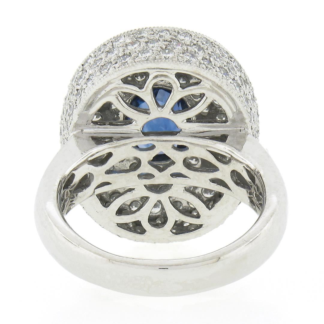 A solid paltinum platter ring, featuring 1 oval cut natural sapphire (1.74ct), and 159 round brilliant cut natrual diamonds ( F/G - VS1/VS2 ; 2.78ctw). The ring is size 7.0, weighs a total of 15.97 grams, and measures 21.1mm wide.