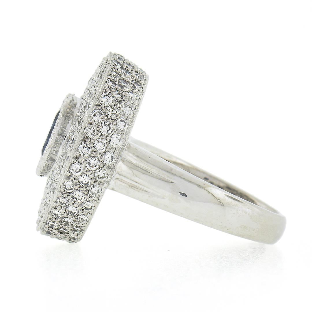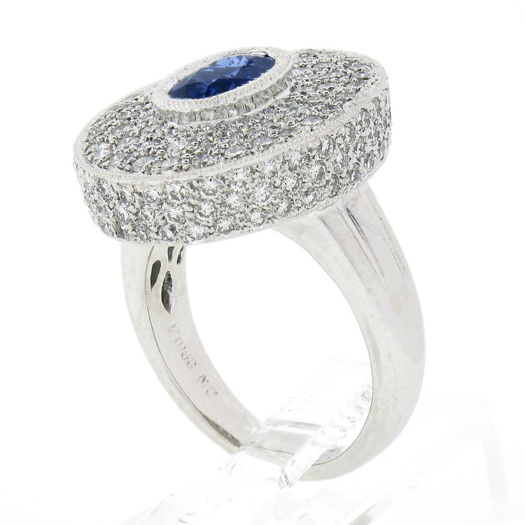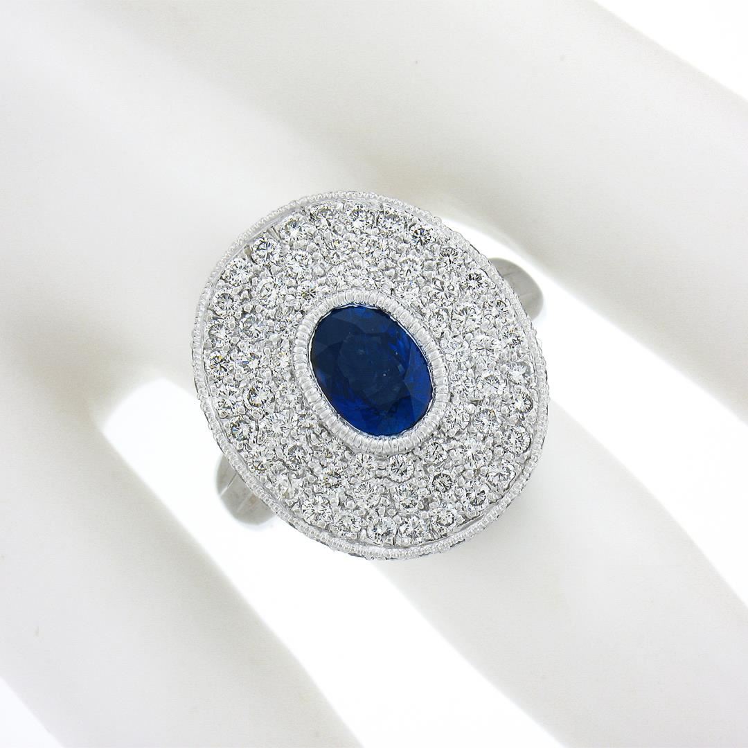 A solid paltinum platter ring, featuring 1 oval cut natural sapphire (1.74ct), and 159 round brilliant cut natrual diamonds ( F/G - VS1/VS2 ; 2.78ctw). The ring is size 7.0, weighs a total of 15.97 grams, and measures 21.1mm wide.
