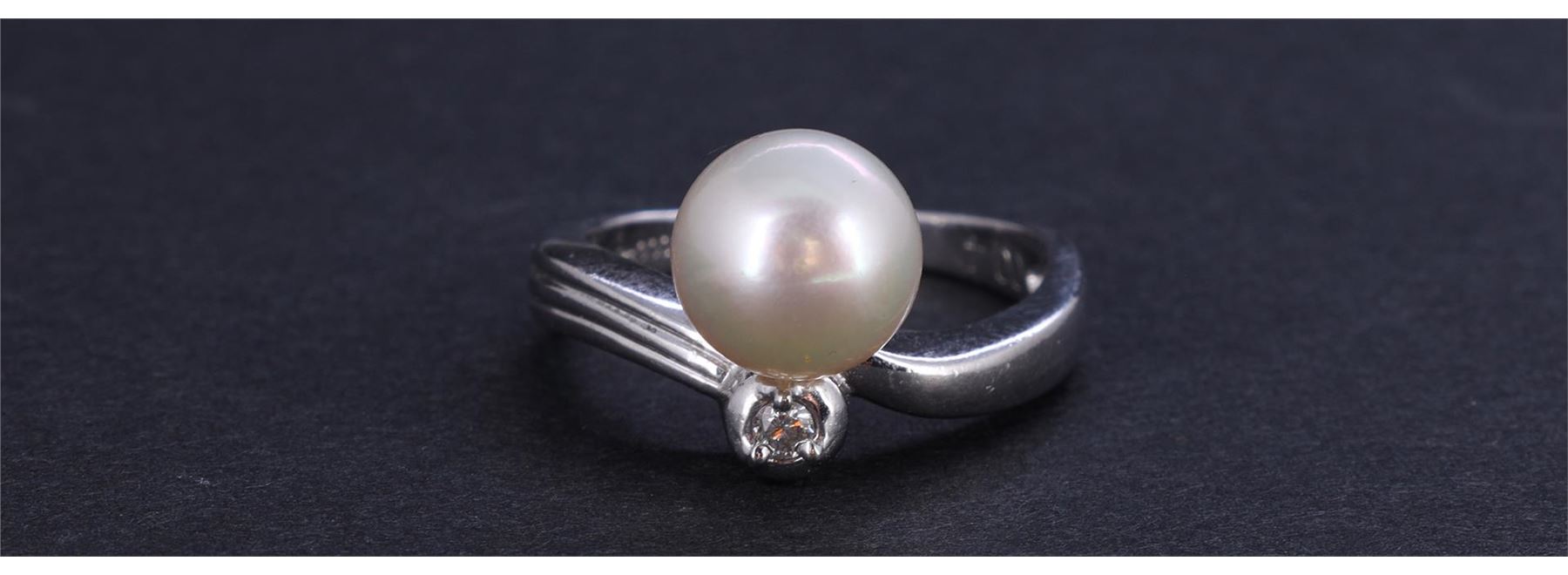 A platinum ring set with South Sea round pearl measuring approximately 9mm with single diamond accent weighing approximately .04 carats, the interior of the ring marked Pt900 004; gross weight 5.6 g, size 6