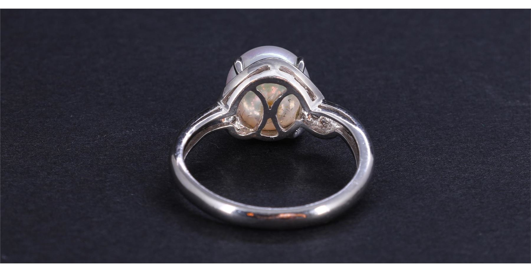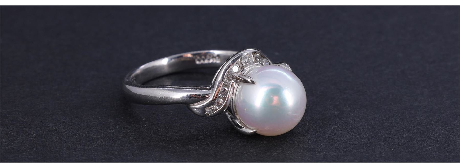 A platinum ring set with South Sea round pearl measuring approximately 9mm surrounded by approximately .16 carats of diamond accents, the interior of the ring marked D0.16 Pt900; gross weight 5.1 g, size 5 3/4