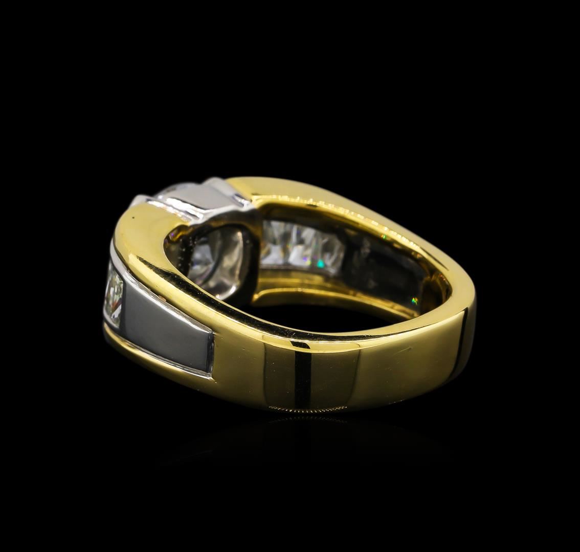 One electronically tested platinum and 18KT yellow gold cast diamond ring with a bright polish finish. The ring features a diamond supported by tapering diamond shoulders, completed by a six millimeter wide band. Trademark is LARSON. Identified with markings of "990 750". Condition is good. Containing: One prong set round brilliant cut diamond, measuring 9.60 - 9.55 x 6.10mm (depth est.) approximate weight of 3.51ct. Diamond Grading Report attached. Graded in the setting. Clarity: I-1. Color: 63.7%. Table 59.6%. Eight channel set baguette cut diamonds, measuring from 4.00 x 2.20 x 1.54mm (depth est.) to 5.30 x 2.50 x 1.75mm (depth est.) approximate total weight of 8 Stones = 1.40ct. Graded in the setting. Clarity: VS-2 to SI-1. Color: G - I. Total Weight of Diamonds 4.91ct. Total Weight of Ring 20.38 grams. AIG Appraised at $59,265.00.