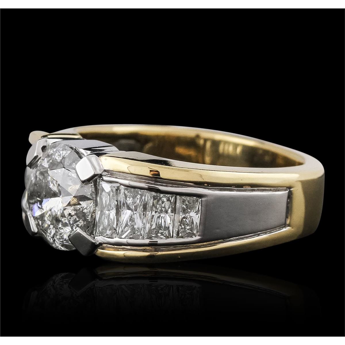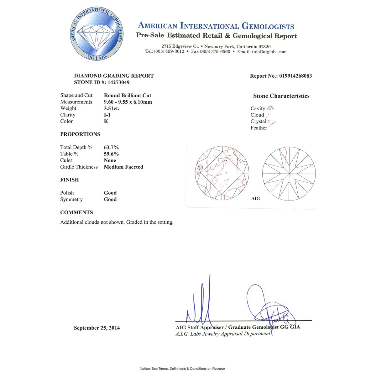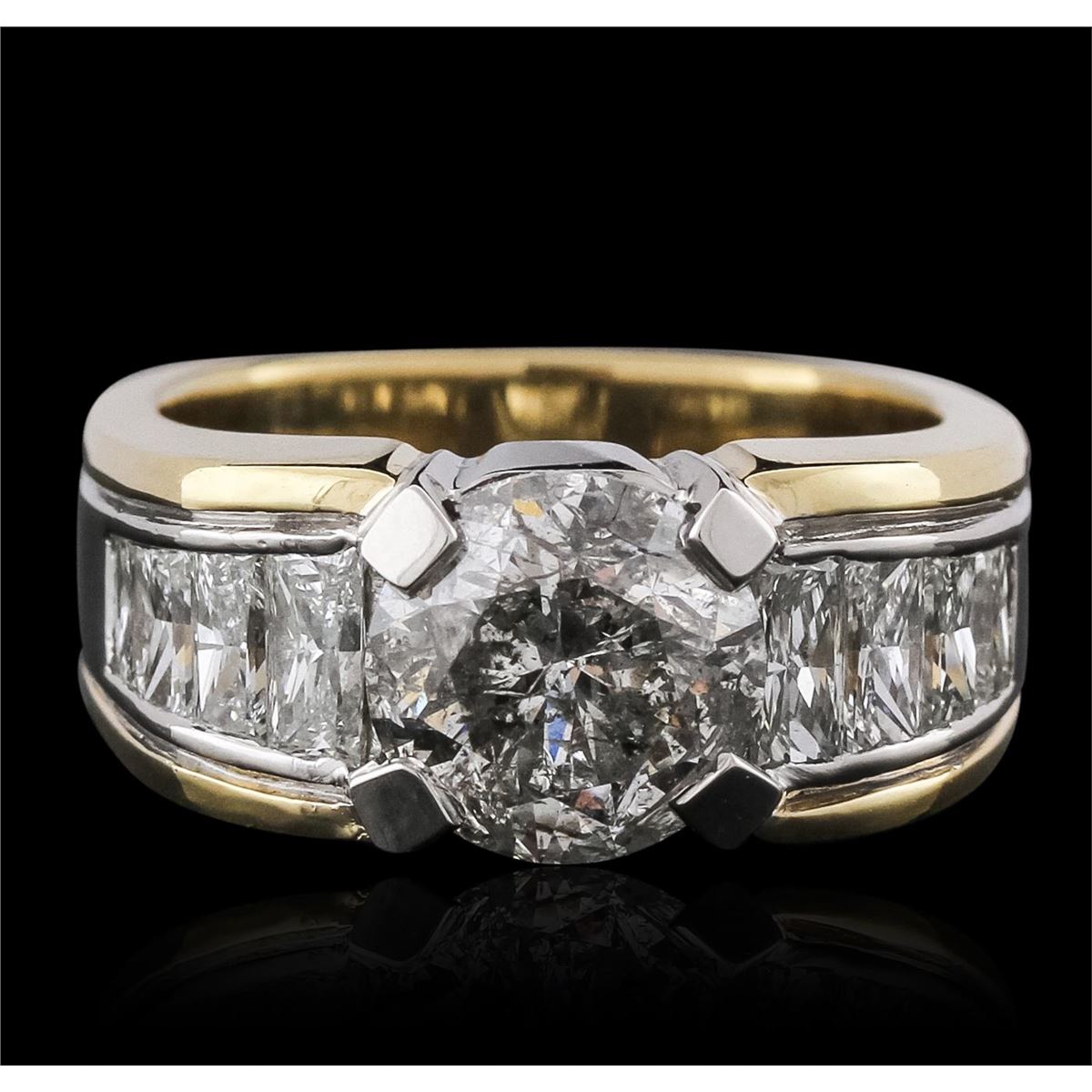 One electronically tested platinum and 18KT yellow gold cast diamond ring with a bright polish finish. The ring features a diamond supported by tapering diamond shoulders, completed by a six millimeter wide band. Trademark is LARSON. Identified with markings of "990 750". Condition is good. Containing: One prong set round brilliant cut diamond, measuring 9.60 - 9.55 x 6.10mm (depth est.) approximate weight of 3.51ct. Diamond Grading Report attached. Graded in the setting. Clarity: I-1. Color: 63.7%. Table 59.6%. Eight channel set baguette cut diamonds, measuring from 4.00 x 2.20 x 1.54mm (depth est.) to 5.30 x 2.50 x 1.75mm (depth est.) approximate total weight of 8 Stones = 1.40ct. Graded in the setting. Clarity: VS-2 to SI-1. Color: G - I. Total Weight of Diamonds 4.91ct. Total Weight of Ring 20.38 grams. AIG Appraised at $59,265.00.