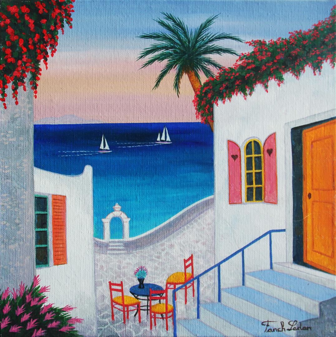 Fanch takes us to Sifnos once again, this time to enjoy the City plaza in a 12x12" original on canvas, with COA by Fanch,