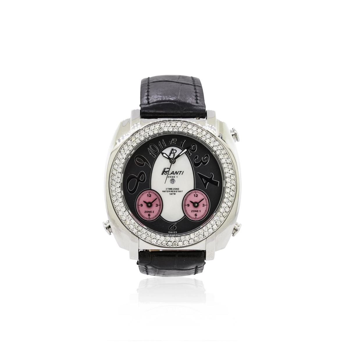 One Polanti 3 Time Zone wristwatch featuring: Case: Stainless steel. Bezel: Stainless steel set with diamonds. Crystal: Mineral crystal. Dial: Black, white, and pink color. The watch features the ability to set 3 different time zones. Time zones 2 and 3 located at the 7 and 5 o'clock positions respectively. Bracelet: Leather. Clasp: Buckle. Water resistant: 5 ATM.