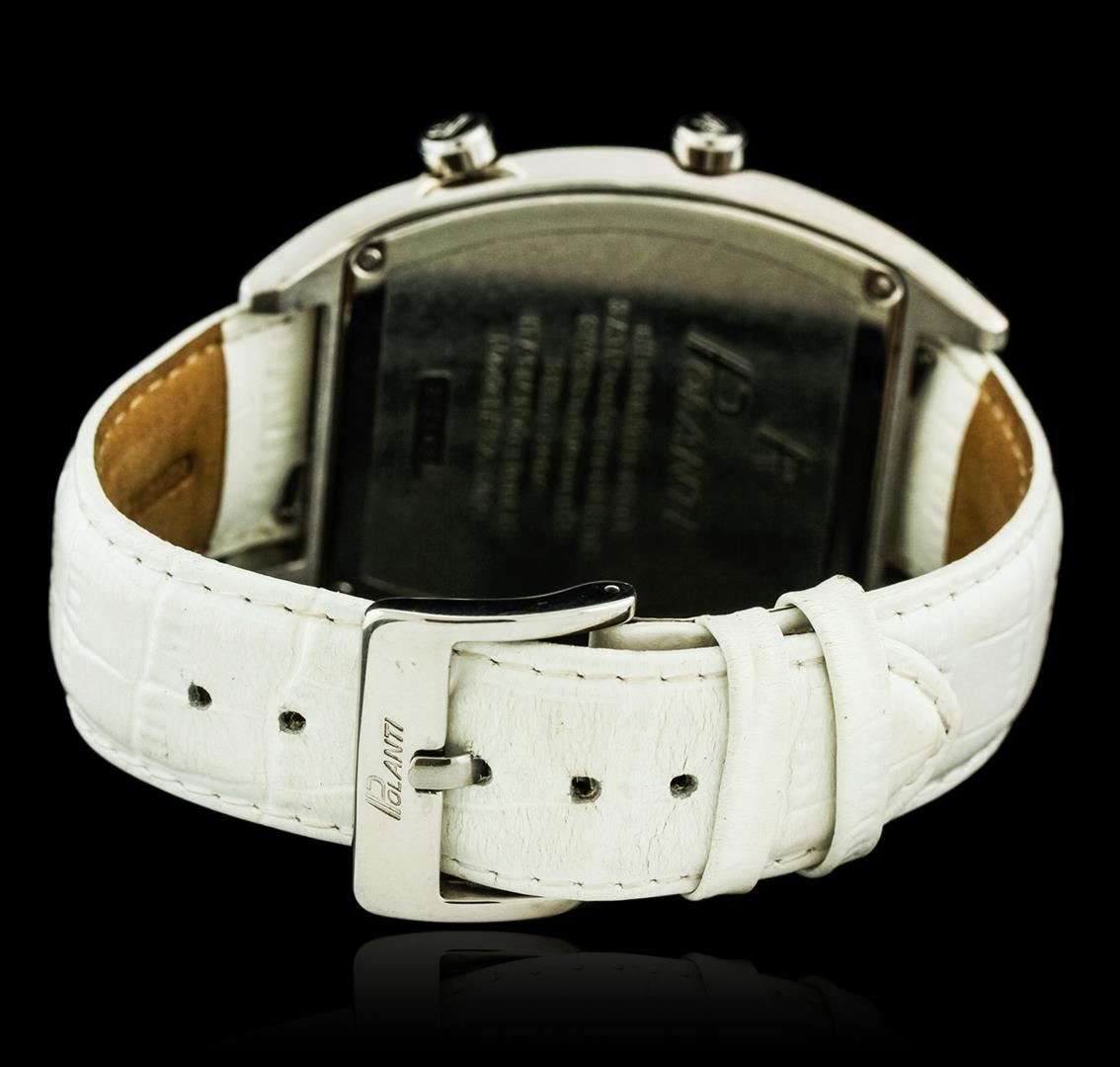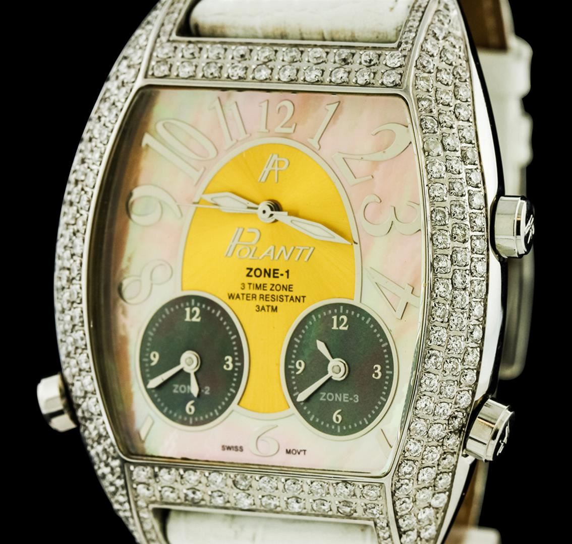 One Polanti 3 Time Zone wristwatch featuring: Case: Stainless steel. Bezel: Stainless steel set with diamonds. Crystal: Mineral crystal. Dial: Pink mother of pearl. The watch features the ability to set 3 different time zones. Time zones 2 and 3 located at the 7 and 5 o'clock positions respectively. Bracelet: Leather with buckle clasp. Water resistant: 3 ATM.