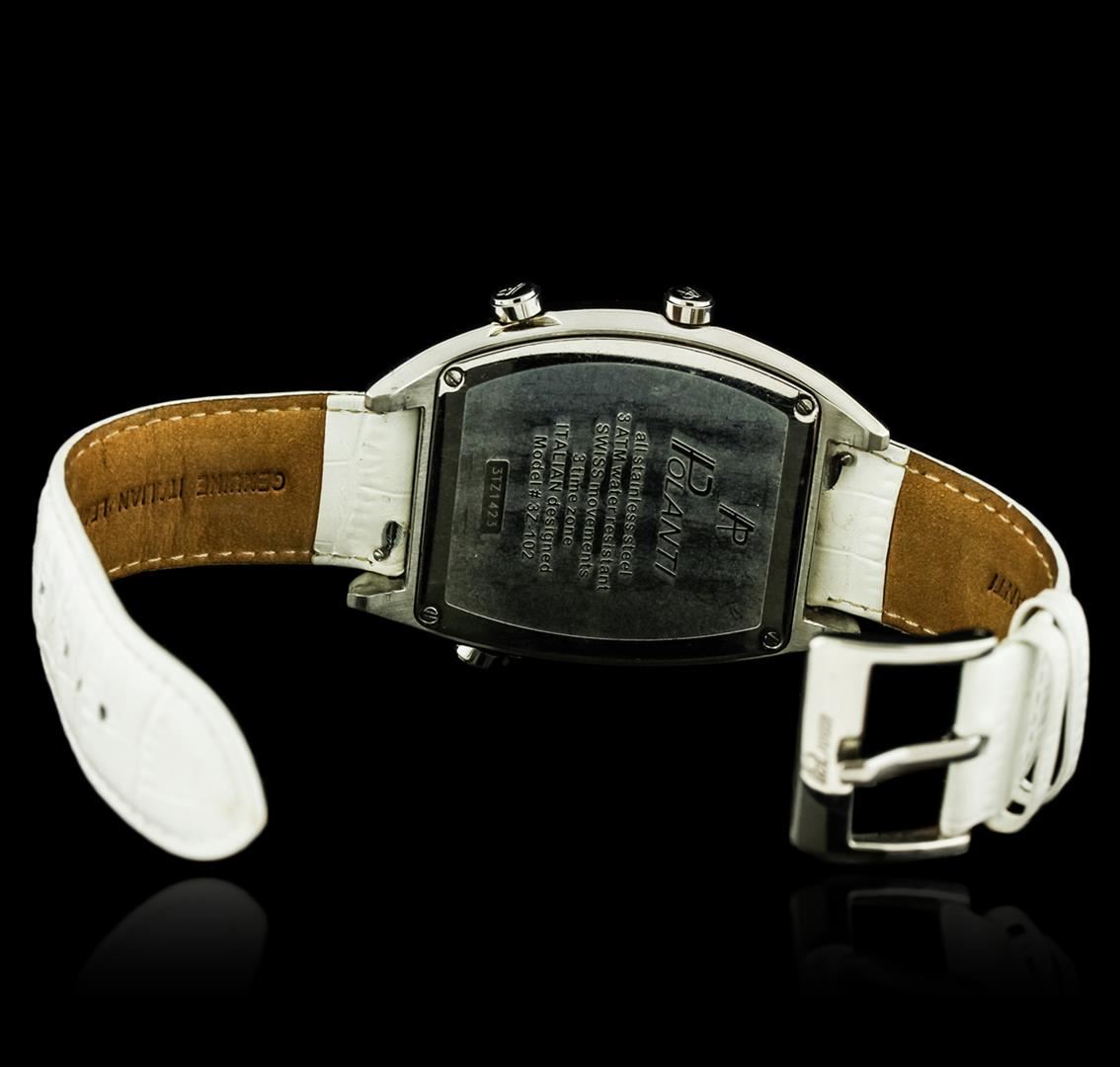 One Polanti 3 Time Zone wristwatch featuring: Case: Stainless steel. Bezel: Stainless steel set with diamonds. Crystal: Mineral crystal. Dial: Pink mother of pearl. The watch features the ability to set 3 different time zones. Time zones 2 and 3 located at the 7 and 5 o'clock positions respectively. Bracelet: Leather with buckle clasp. Water resistant: 3 ATM.