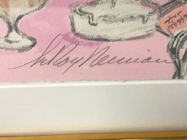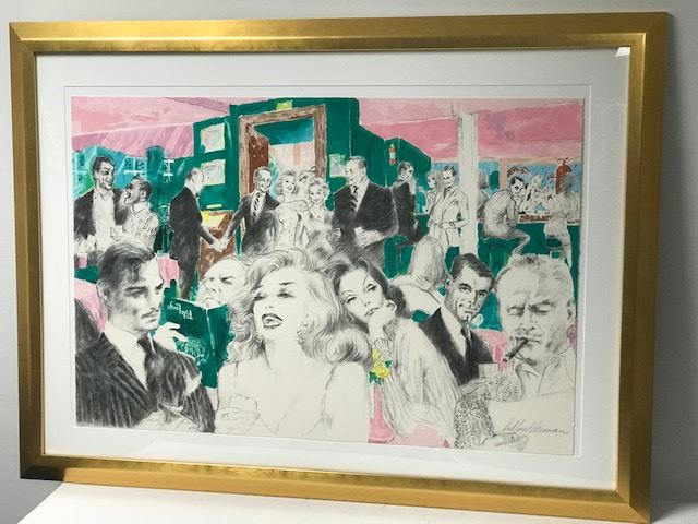 "Polo Lounge" by LeRoy Neiman Set - Limited edition serigraph #1 of 250 = 2 Matching pieces 48" x 35" each. "Polo Lounge" by LeRoy Neiman - COA Included - This is a rare Diptych Serigraph by LeRoy Neiman titled "Polo Lounge" from his tribute to his infamous bar and social scenes across the world. ~ "I bring personal and sentimental baggage to this work," Neiman explained. "As a guest, I have felt at home in the bungalows of The Beverly Hills Hotel for many years. As a stargazer, I have always enjoyed the unique showcase that is the Polo Lounge. Stars here have left a special imprint on my memory, so there was something magical for me in creating this sampling of Hollywood's elite." And what a sampling it is! LeRoy Neiman has drawn together a remarkable group of personalities who have dominated the Hollywood scene from both in front and behind the cameras. Near Marilyn Monroe and Clark Gable sits a sly W.C. Fields, and, yes, he is holding his menu upside down. Famed gossip columnist Hedda Hopper is perched within earshot of Bogie and Bacall, who seem to be keeping an eye on Katherine Hepburn and John Huston. Elizabeth Taylor, regal and bejeweled, enjoys a quiet cup of coffee. Frank and Barbara Sinatra are making their entrance, perhaps to join Frank's fellow "Rat Pack" buddies Dean Martin and Sammy Davis, Jr., who have already arrived. Star-makers Darryl F. Zanuck and Howard Hughes are here, as are Johnny Carson and Joan Collins from the world of television. Film greats Gary Cooper, Bette Davis, Errol Flynn, Marlene Dietrich and Greta Garbo all help lend a magical air to this glittering assemblage. It is no wonder that LeRoy Neiman feels such a special warmth toward this magnificent work.