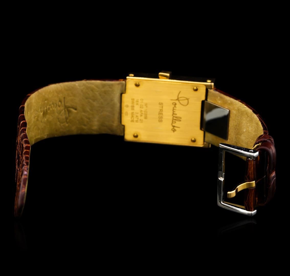 One, custom cast & hand crafted Pomellato Stress wristwatch, electronically tested 18KT Rose gold, Case: 28mm x 22mm, Case Back: secured by four set screws, engraved with the manufactures name, model, and ID numbers, Crown: square, Bezel: fixed, with a high polish, Crystal: synthetic sapphire crystal. Movement: quartz. Dial: Slate Black color, with baton hands and four numerals, Pomellato Bracelet: leather strap, Seven inch length adjustable, Condition: G-6 Extra Fine. Containing: Twenty-Five prong set round brilliant cut diamonds, measuring 1.70 - 1.70 x 1.02mm (depth est.) approximate total weight of 25 Stones = 0.50ct. Graded in the setting. Clarity: VVS-1 to VVS-2. Color: E - F. Total Weight of Diamonds 0.50ct. Total Weight of Watch 41.85gm. AIG Appraised at $4,000.00.