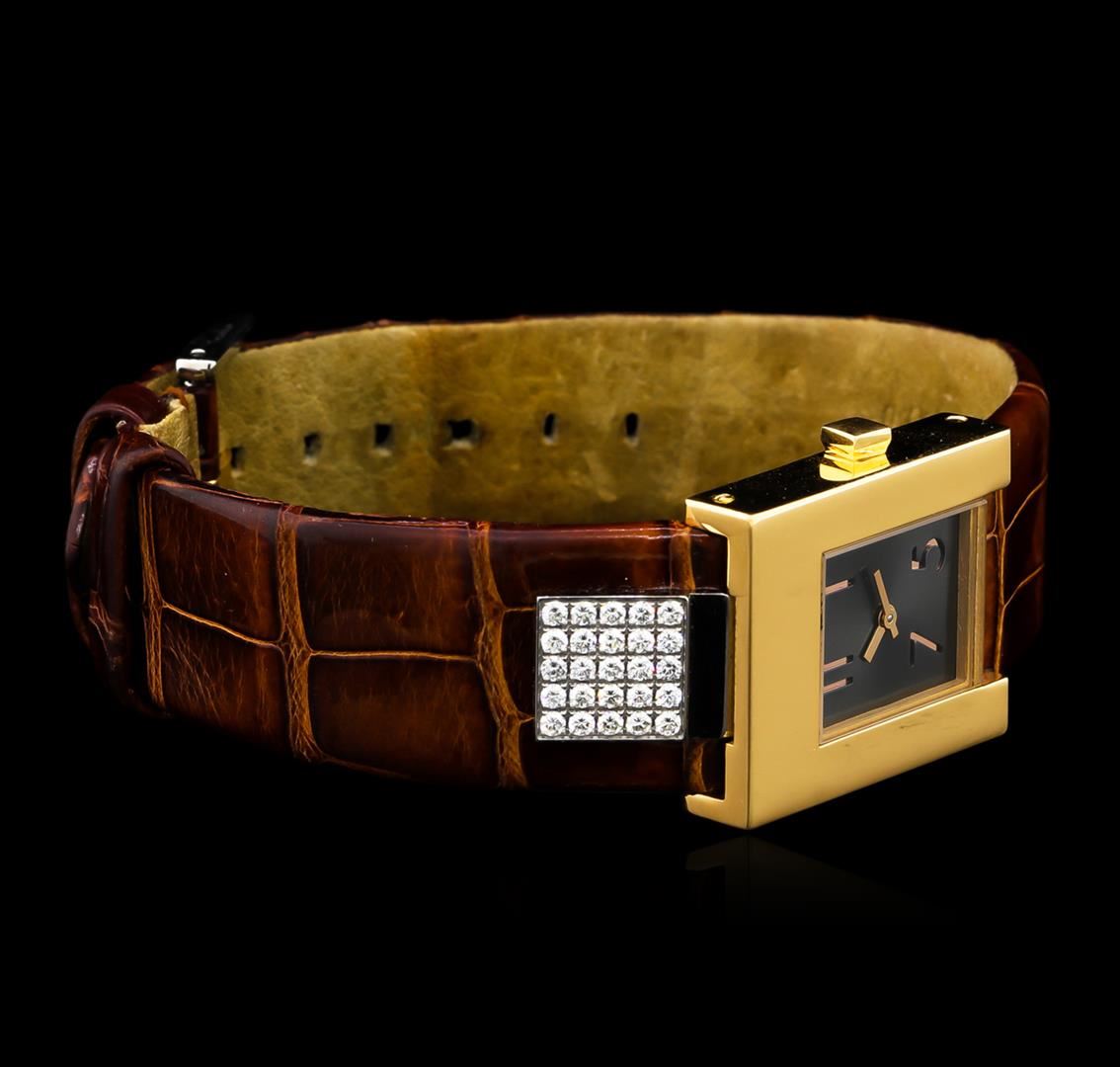 One, custom cast & hand crafted Pomellato Stress wristwatch, electronically tested 18KT Rose gold, Case: 28mm x 22mm, Case Back: secured by four set screws, engraved with the manufactures name, model, and ID numbers, Crown: square, Bezel: fixed, with a high polish, Crystal: synthetic sapphire crystal. Movement: quartz. Dial: Slate Black color, with baton hands and four numerals, Pomellato Bracelet: leather strap, Seven inch length adjustable, Condition: G-6 Extra Fine. Containing: Twenty-Five prong set round brilliant cut diamonds, measuring 1.70 - 1.70 x 1.02mm (depth est.) approximate total weight of 25 Stones = 0.50ct. Graded in the setting. Clarity: VVS-1 to VVS-2. Color: E - F. Total Weight of Diamonds 0.50ct. Total Weight of Watch 41.85gm. AIG Appraised at $4,000.00.