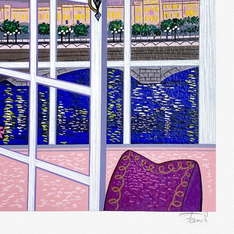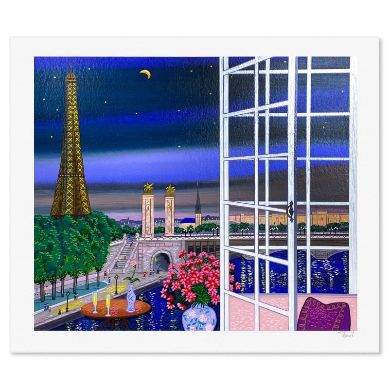 "Pont Alexandre III" is a limited edition serigraph on paper by Fanch, AP numbered and hand signed by the artist. Includes Letter of Authenticity. Measures approx. 16" x 19" (border), 14" x 16.5" (image). This proof came from Fanch Ledan's personal collection. It may have some slight imperfections in the image and border, but it's overall condition was inspected and approved by him.