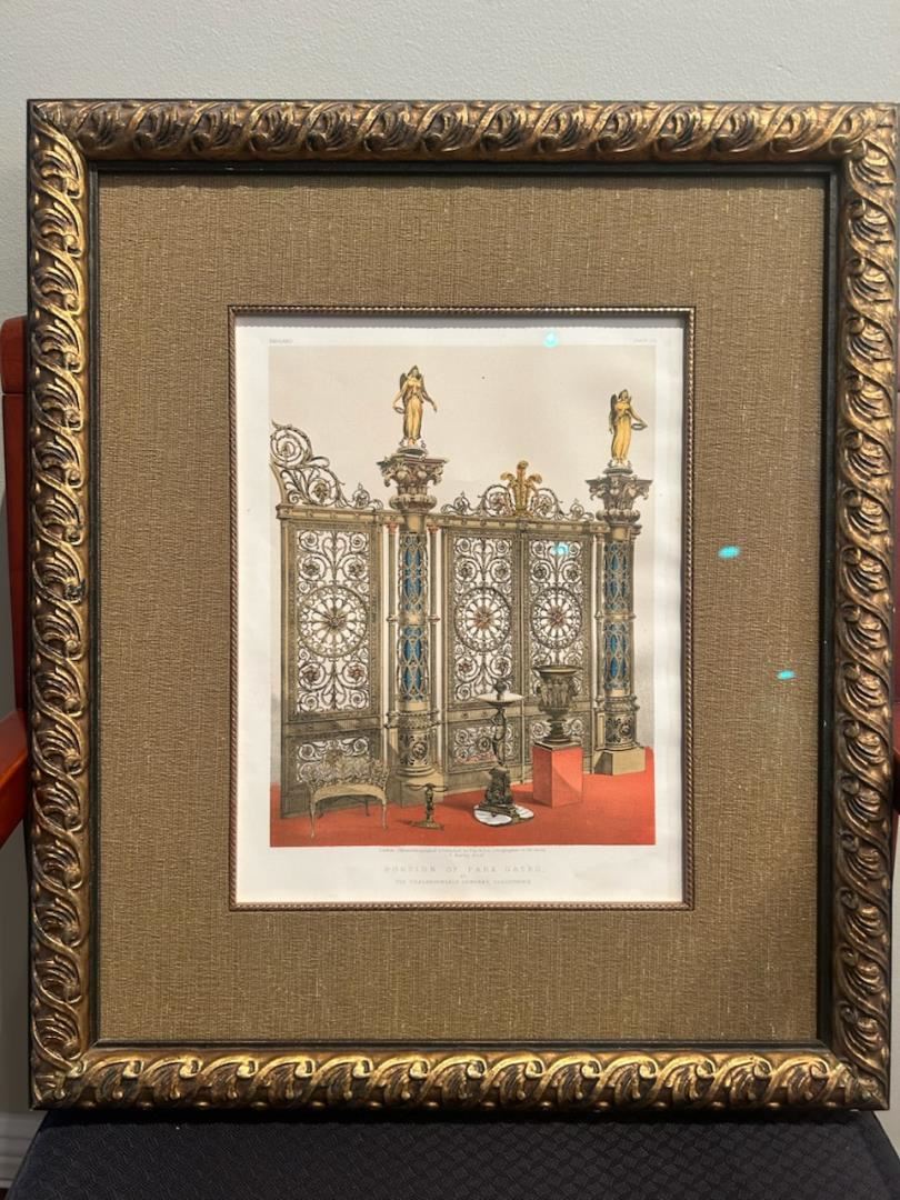 Antigue reproduction of a color etching depicting a portion of the Park Gates by engravers to the Queen 18.5 x 21.75" on paper, silk matted & Framed w/Museum Glass.