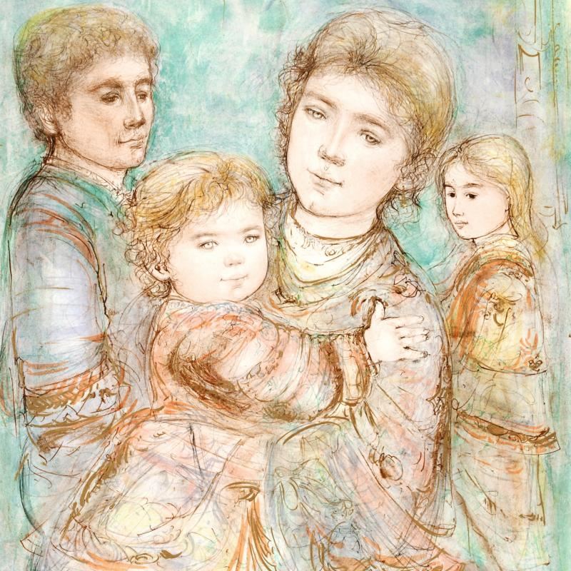 "Portrait of a Family" is a limited edition lithograph on paper, numbered and hand signed by Edna Hibel (1917-2014). Includes Certificate of Authenticity! Measures approx. 31.5" x 44" (with border), 28" x 40.5" (image).