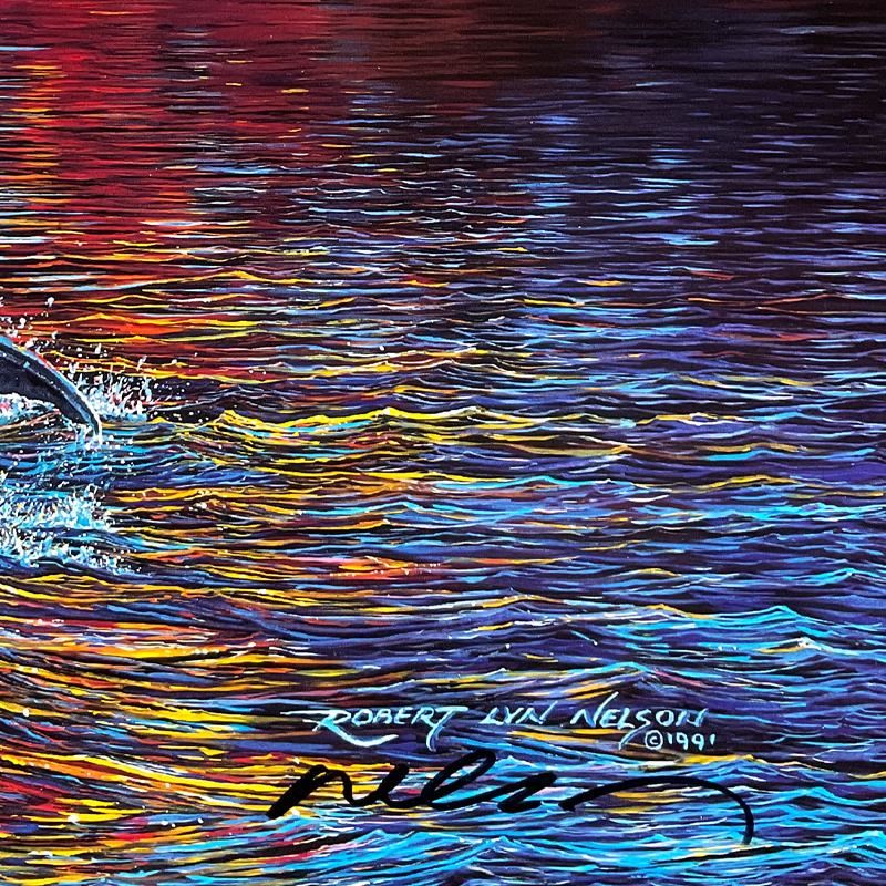 This is a hand signed poster by Robert Lyn Nelson. Measures approx. 31" x 18" (image). There may be very minor wear on the paper but the piece is in overall good condition.
