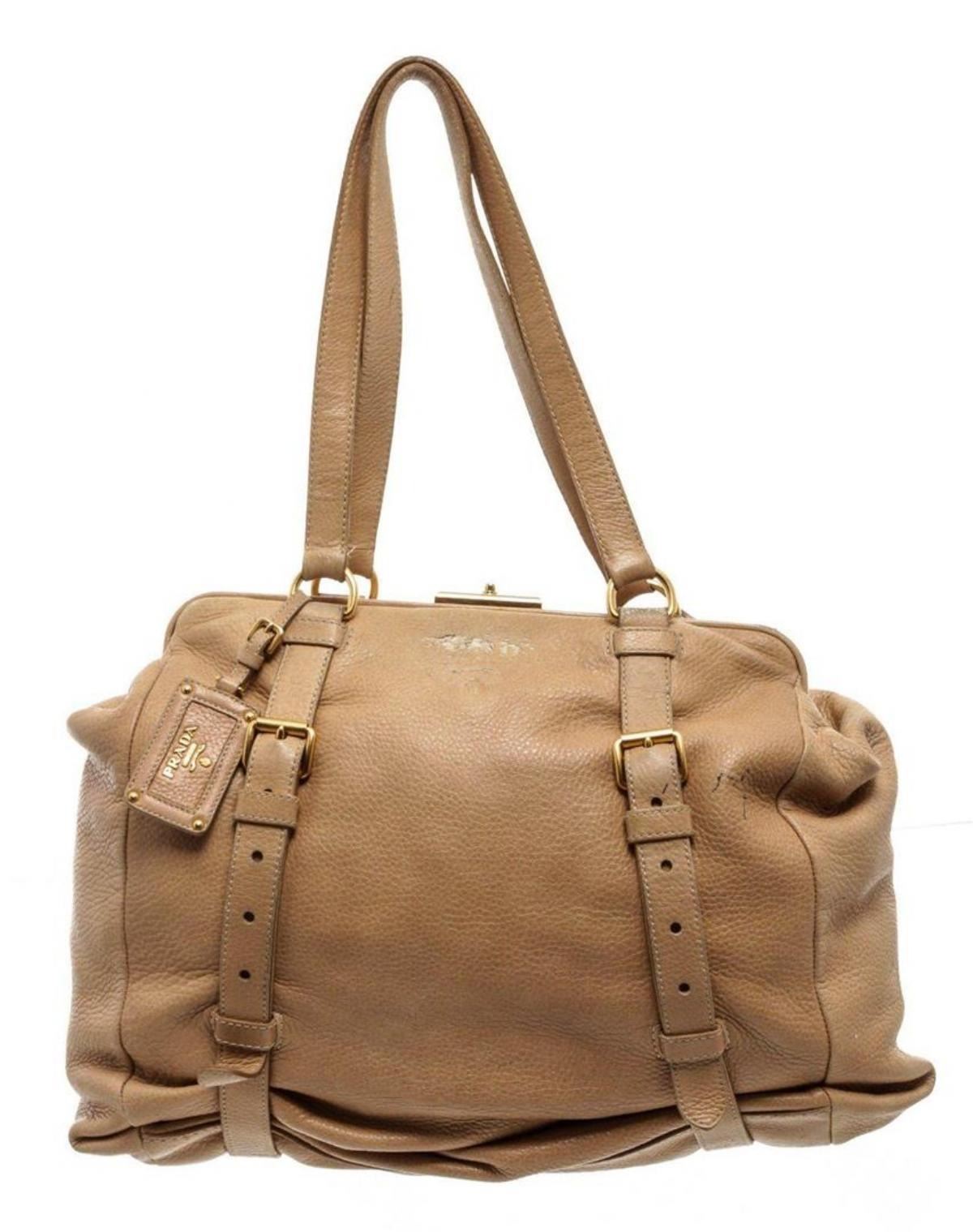 Prada Beige Cervo Leather Buckle Tote Bag. Beige Cervo leather Prada Buckle tote bag with gold-tone hardware, embossed logo accent at front MISSING, dual flat top handles featuring buckle accents, jacquard fabric lining, dual interior pockets, one with zi