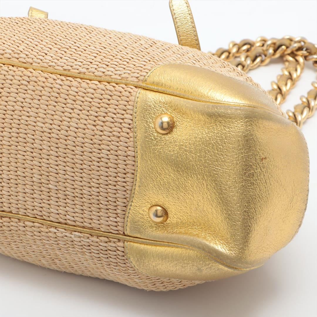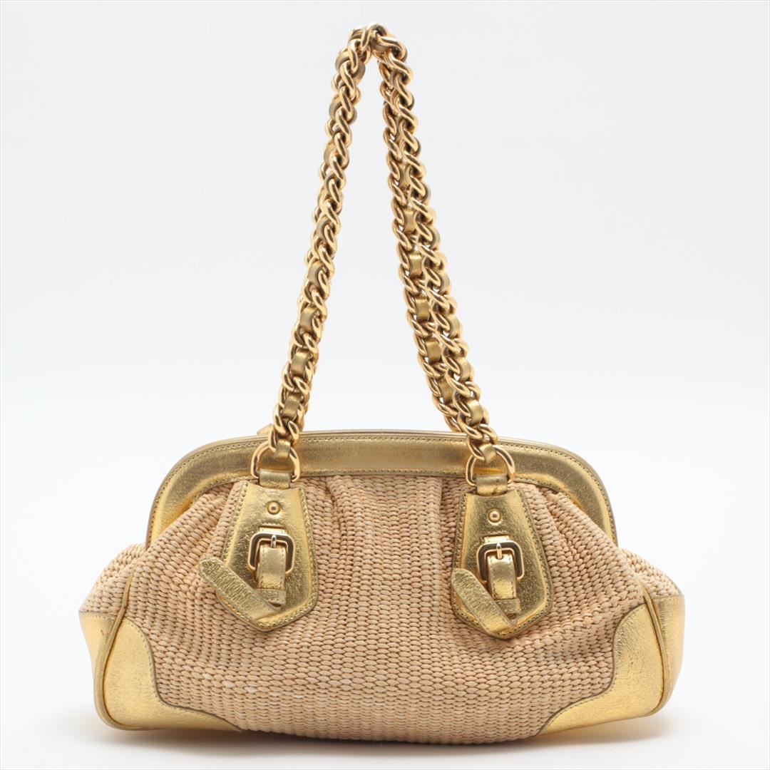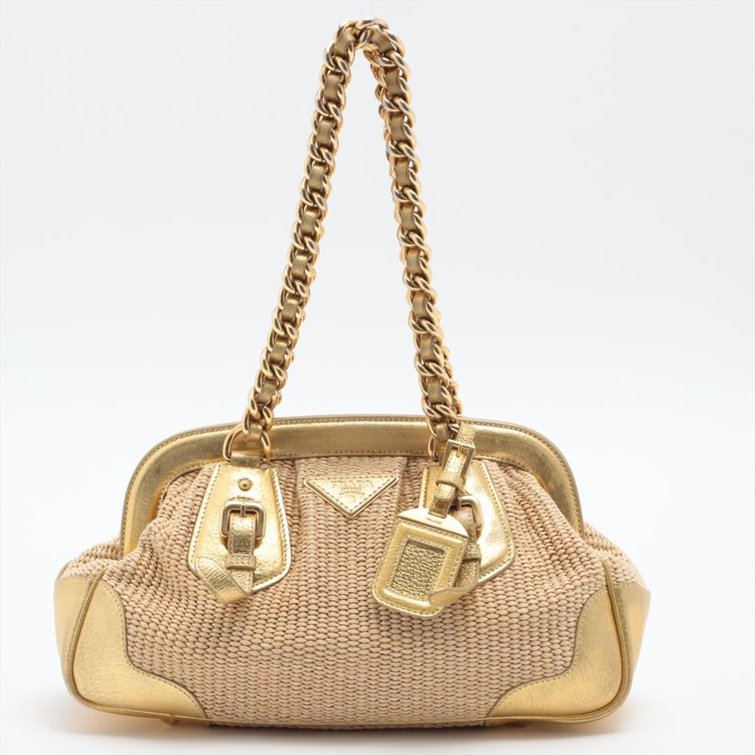 Designed with beige woven straw and gold metallic leather, Prada Dome satchel bag features gold-tone hardware, the interior is well-lined with beige logo jacquard, two woven leather and chain-link handles, as well as the logo detailing at front, snap top